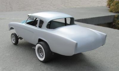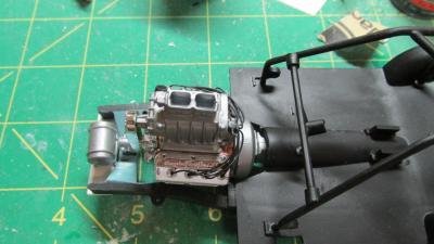Thanks for the kind words! One of the things that irked me about the Miss Deal kit is that there was no room for a fuel pump - the blower guard bumps up to the fuel tank. I ground down the old fuel tank supports and added a strip of Evergreen styrene for the new fuel tank. The fuel pump is from the Revell Ed Roth '57 Chevy - it and most of the other engine goodies are based on the Revell Sting Ray Engine Parts Pack. The fuel tank is modified from the Fumin' Fiat kit (originally the Roadster Chassis Parts Pack). The original tank was in two pieces, when joined together there's a pretty nasty seam. I shortened one of the pieces and reduced the seam. I had to give up on the white wall slicks. I had used Floquil acrylic paint and small cracks appeared, plus I wasn't happy with their appearance. I wish it had worked, as I really like the look of white wall slicks from the 50's & early 60's. I also enlarged the rear wheel openings.