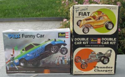 Revell's Miss Deal is a great source for early 60's Revell Pack parts, so swapping in parts from other Parts Packs is a snap. My sources were original Parts Packs (the front wheels), kits with re-popped parts (Revell '57 Chevy for the injector & scoop), and the Fumin'Fiat/Thunder Charger (rear wheels). I'm backdating the kit to a circa 1962 altered. The only body mod I've done so far is filling in the gigantic slot in the trunk. And I hope to clean up the whitewalls before the next posting....