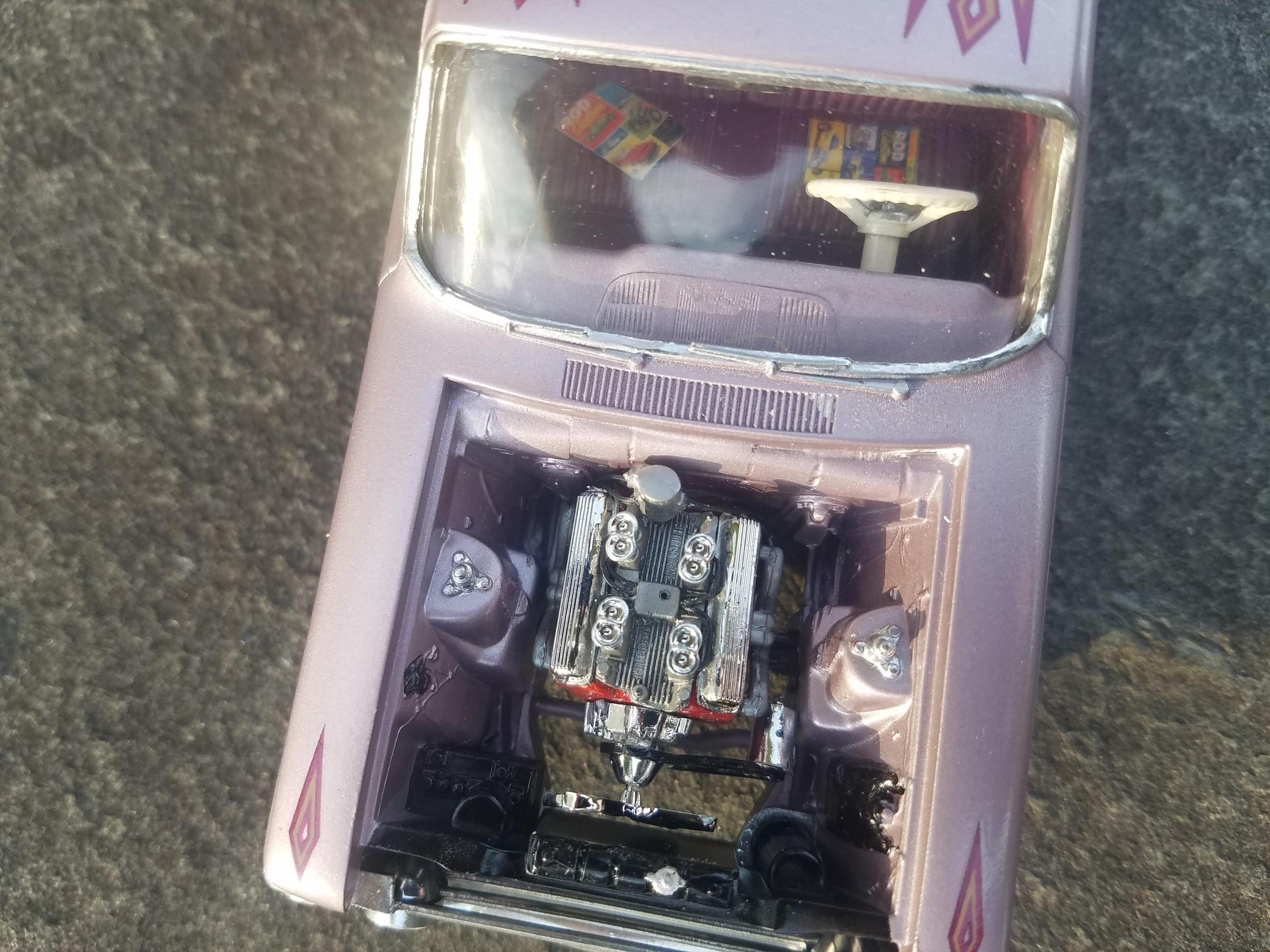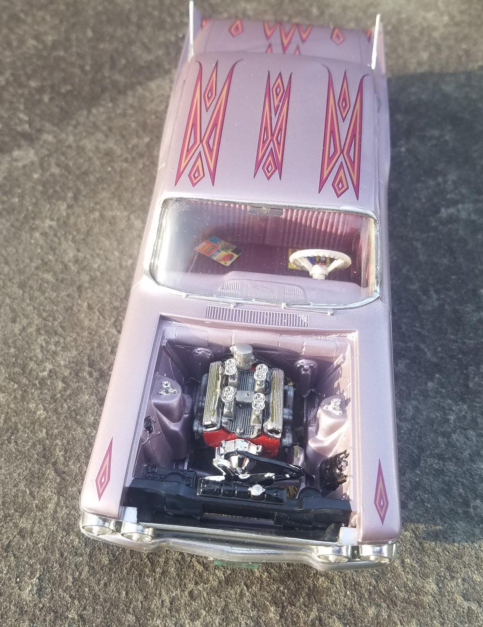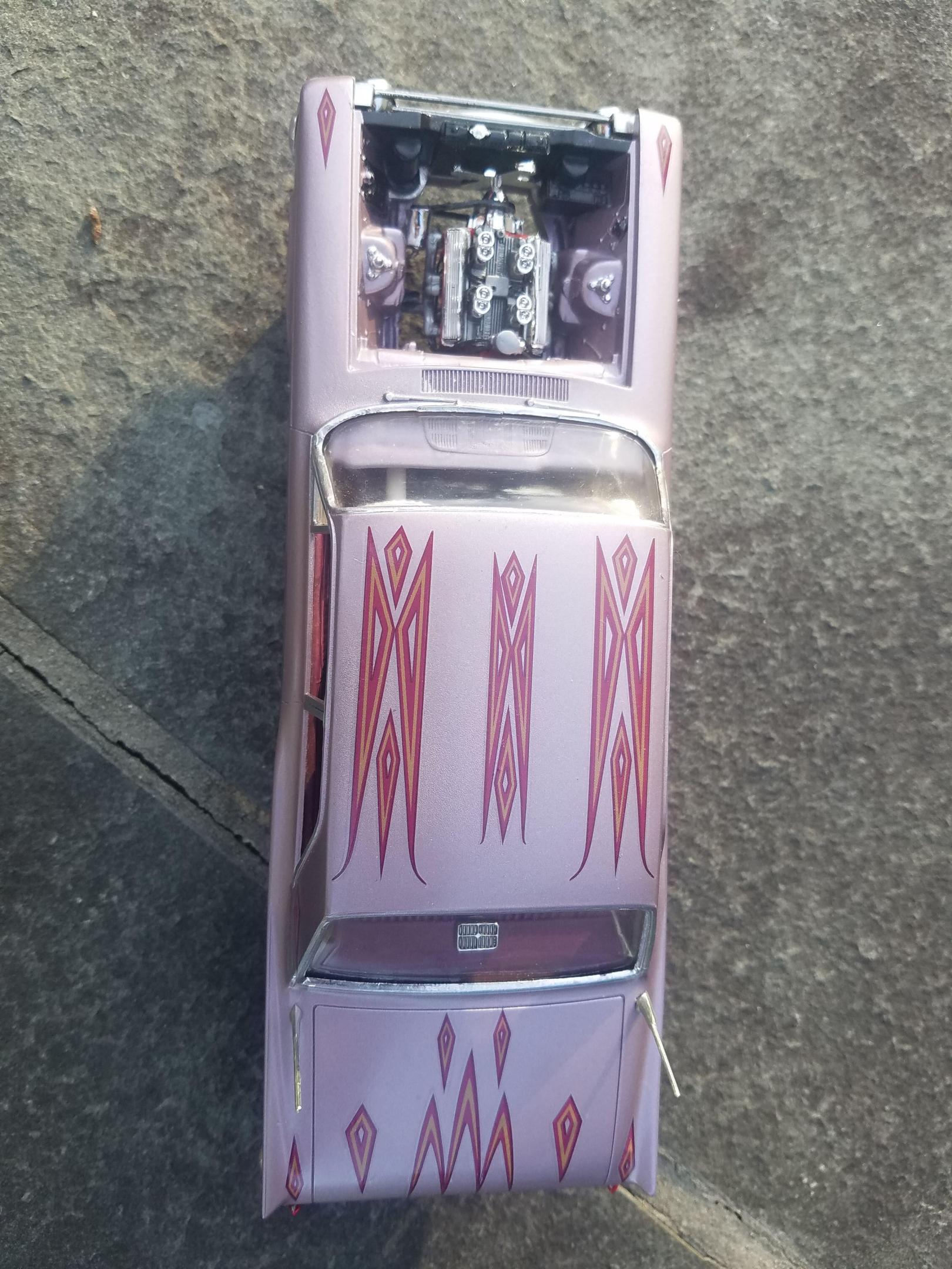 I have a fondness for the model cars that appeared in early 60's issues of Car Modeler, Rod & Custom, Car Craft, etc. You can call them over the top, impractical, or whatever, but many of these builders really had a knack for "dare to be different". When I acquired one of my holy grails, an AMT 1962 Ford Fairlane, I knew I had to build it as an hommage to these creative souls. With the exception of the engine intake and tires, all the parts used in this build could be found in models that were originally released between 1962 and circa 1964. I did use some modern technology (Molotow pens, aftermarket ignition wire, 2 part epoxy), but for the most part it was assembled using old school techniques (including Testor's enamel paints, ugh). Details on the constrution can be found here: