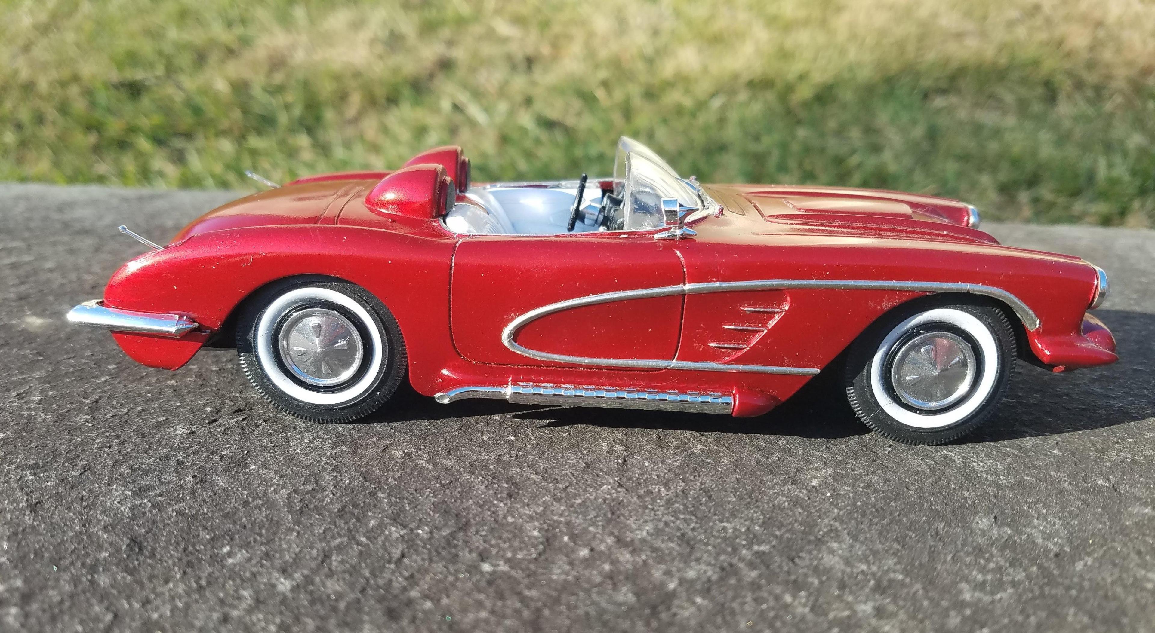 AMT 1959/1960 Corvette with the front end and canopy from the SMP 1961 Corvette. Hubcaps from the original AMT 1957 AMT Chevy, assorted custom bits from the '60 Corvette, paint by Tamiya. Ugly as sin, but I really likedthe SMP space age custom bits!