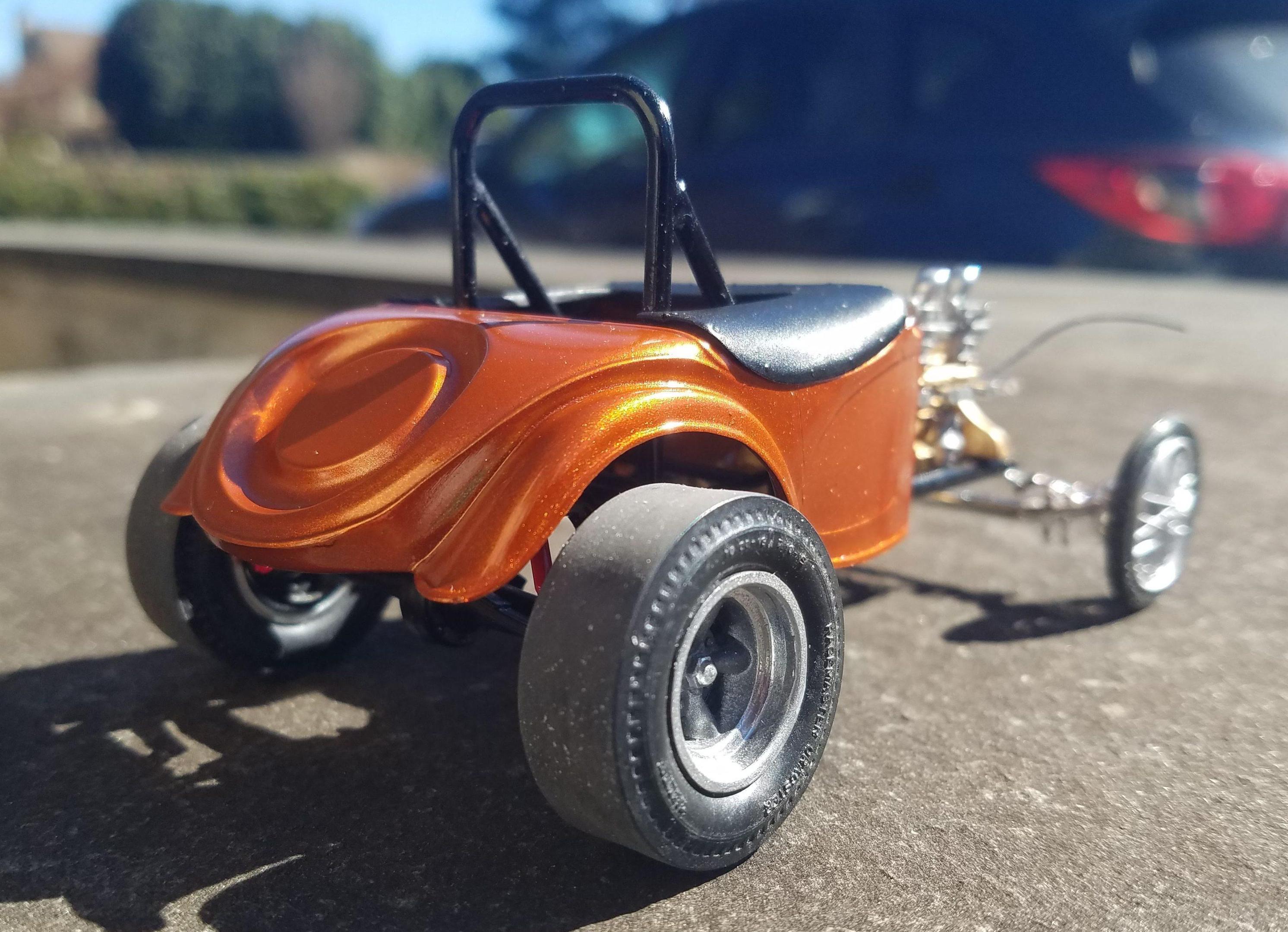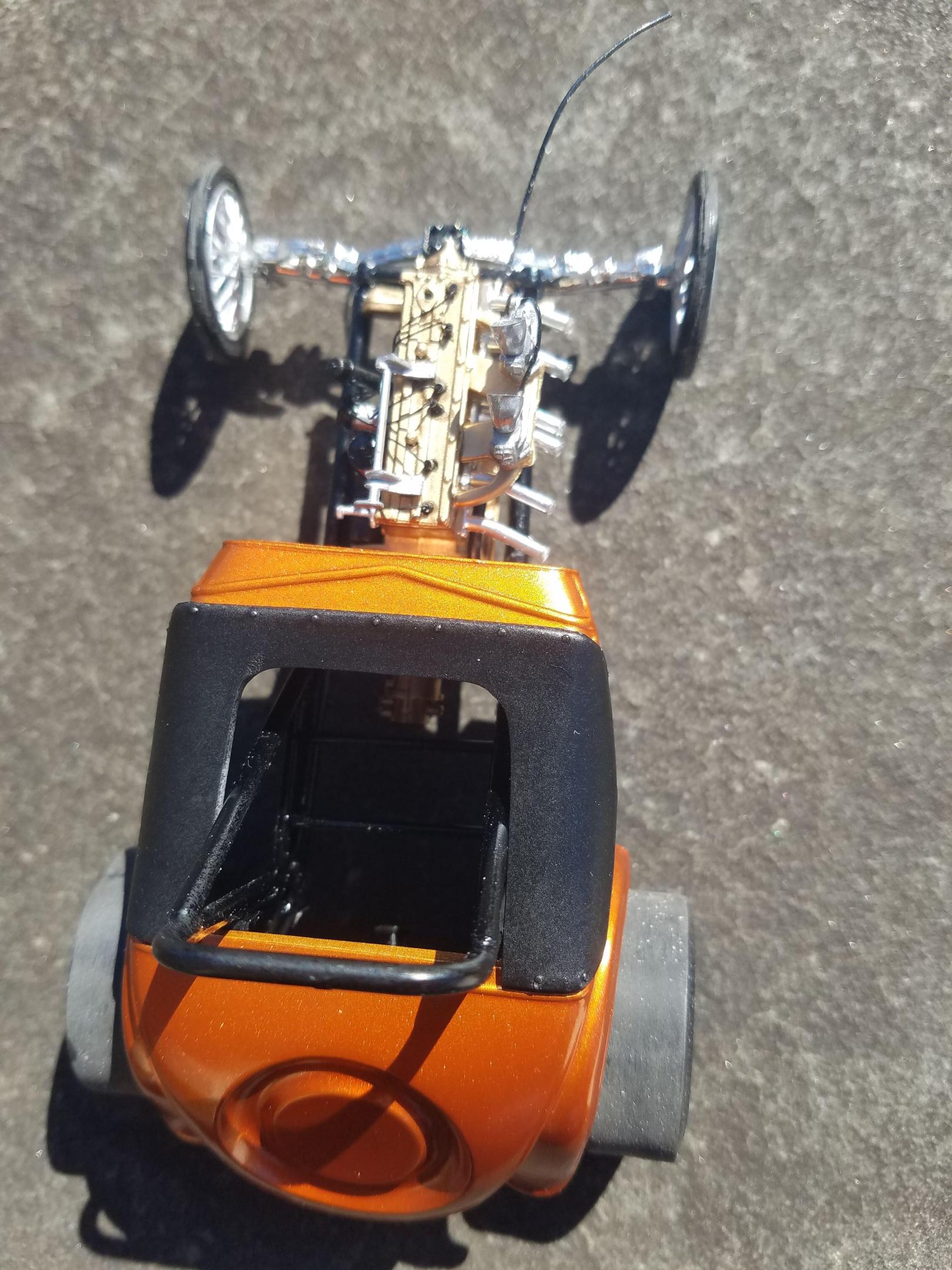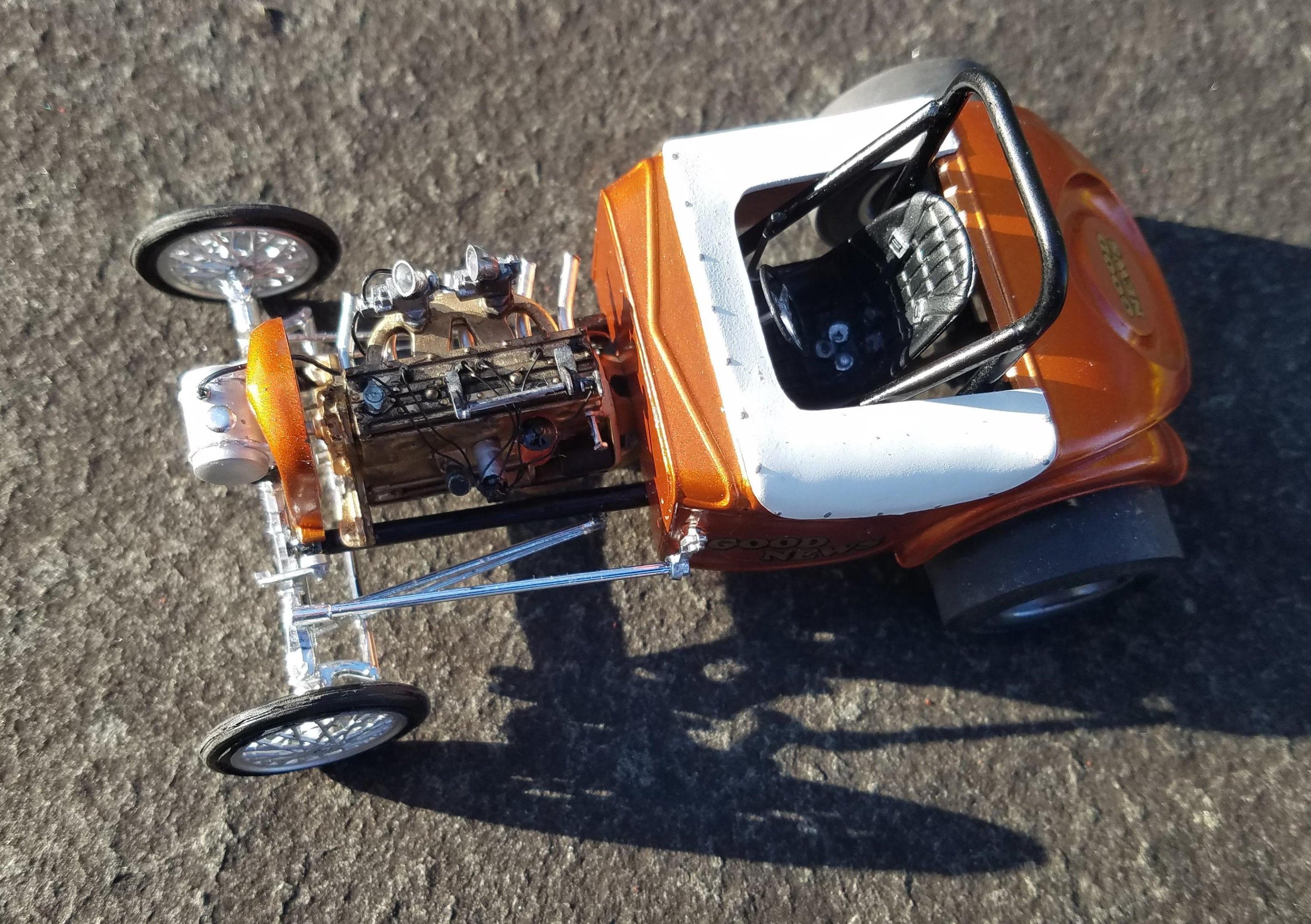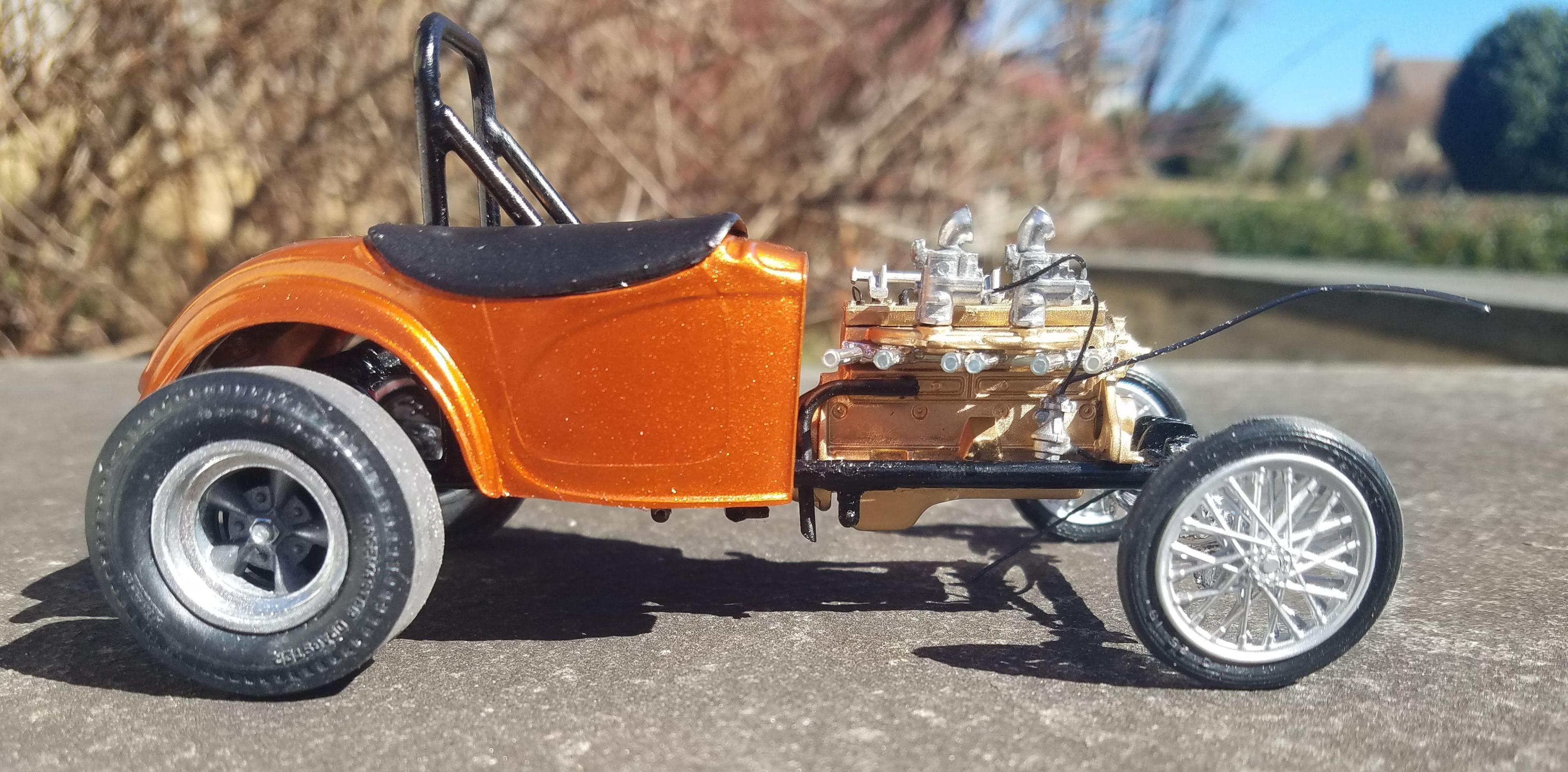 Got some more work done on the altered. The color is Tamiya Metallic Orange. The engine is basically stock, except for the Replicas & Miniatures carb velocity horns and 2 sets of exhausts from the Revell Tony Nancy Plymouth engine.