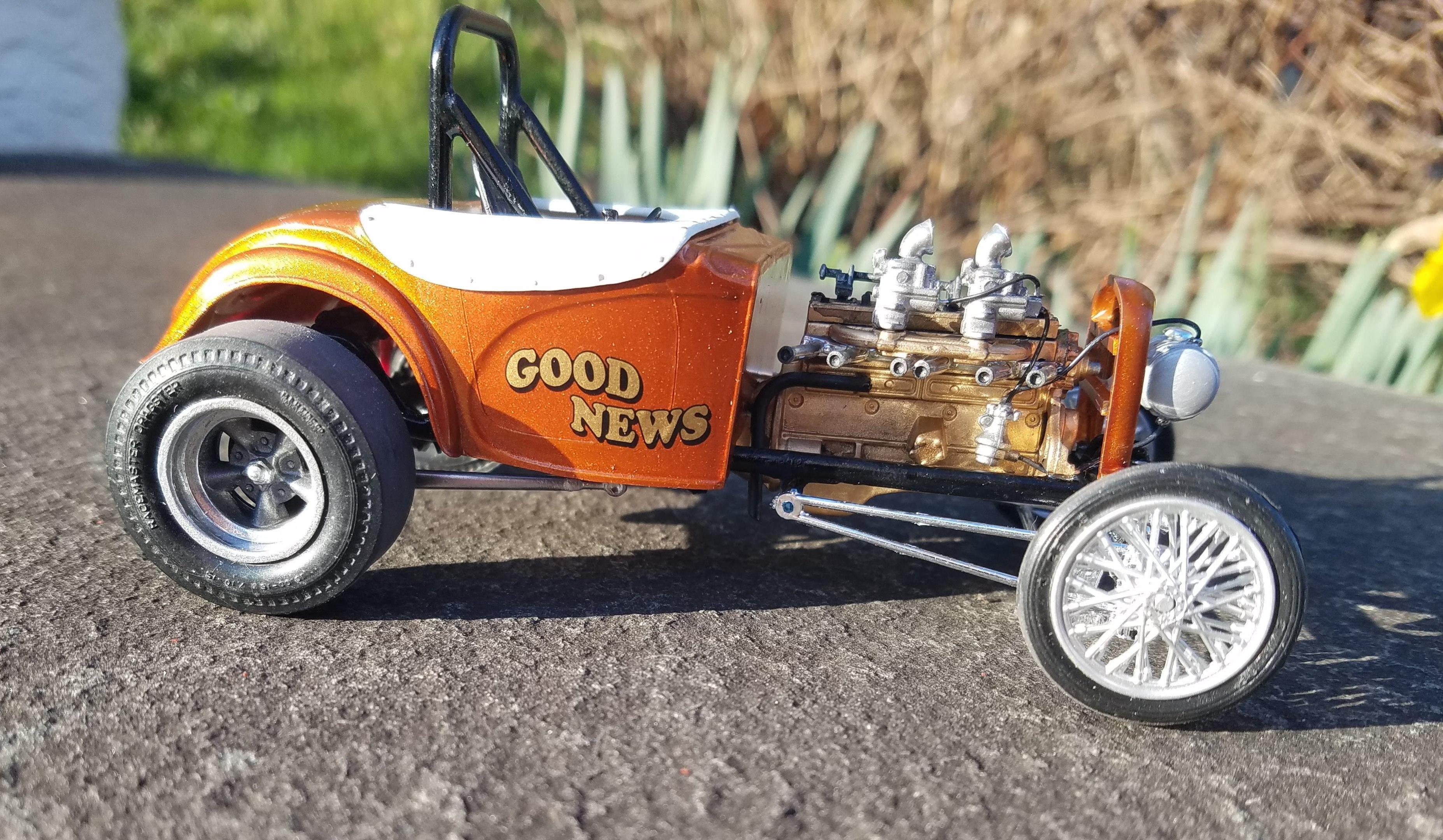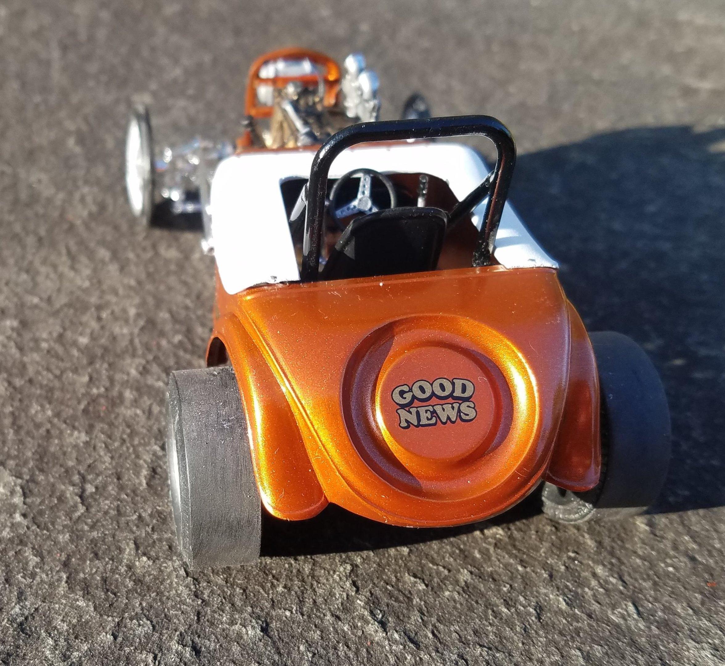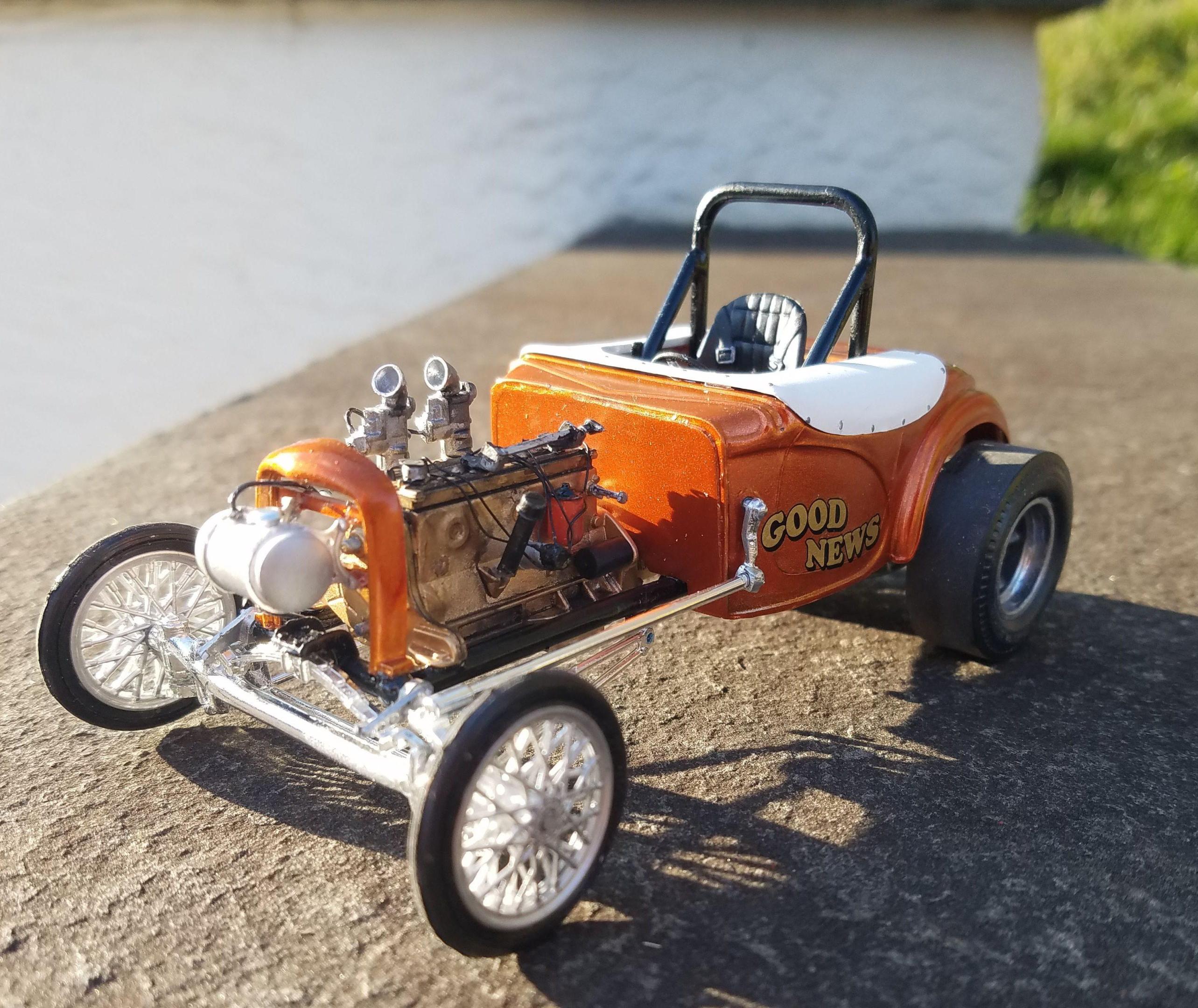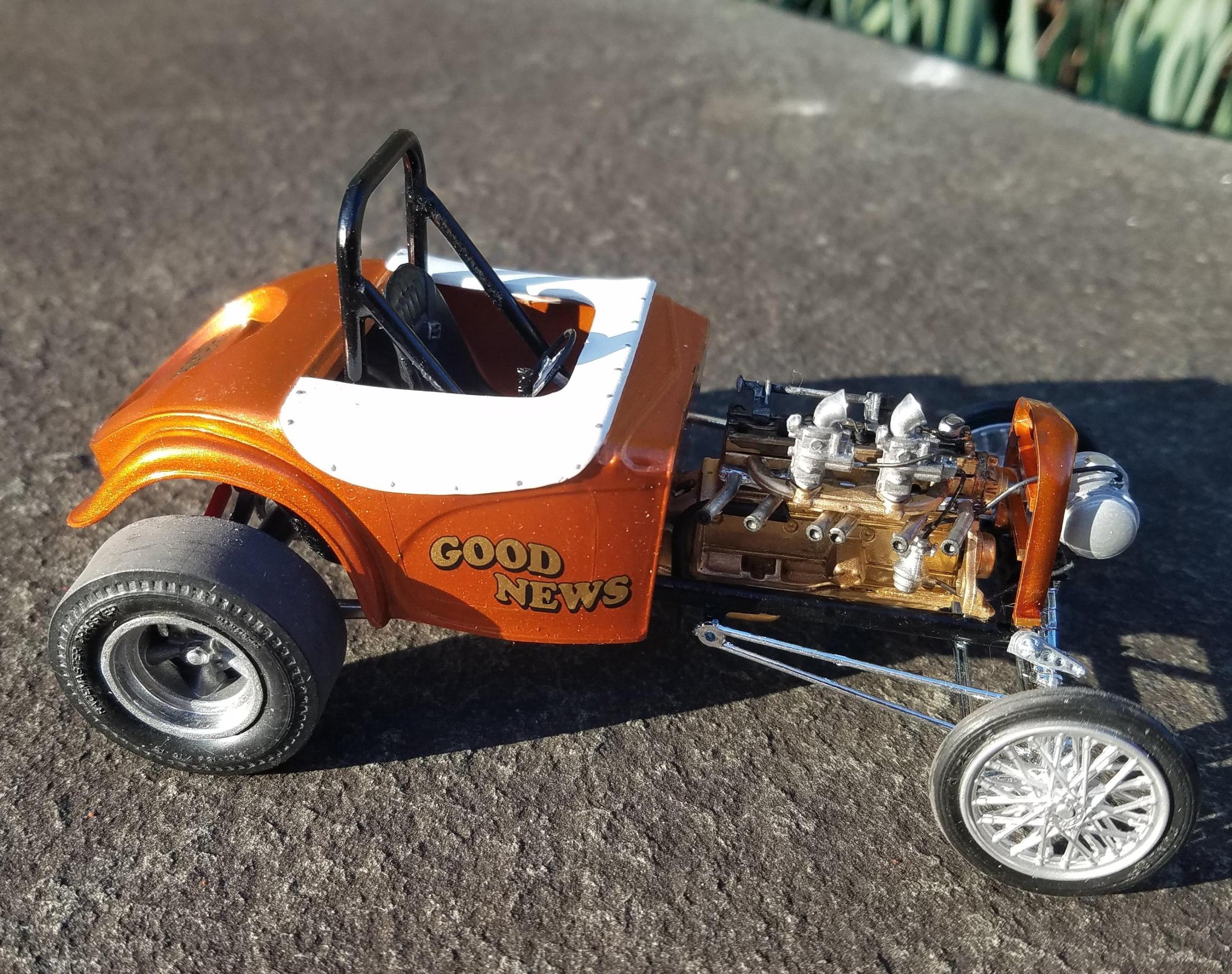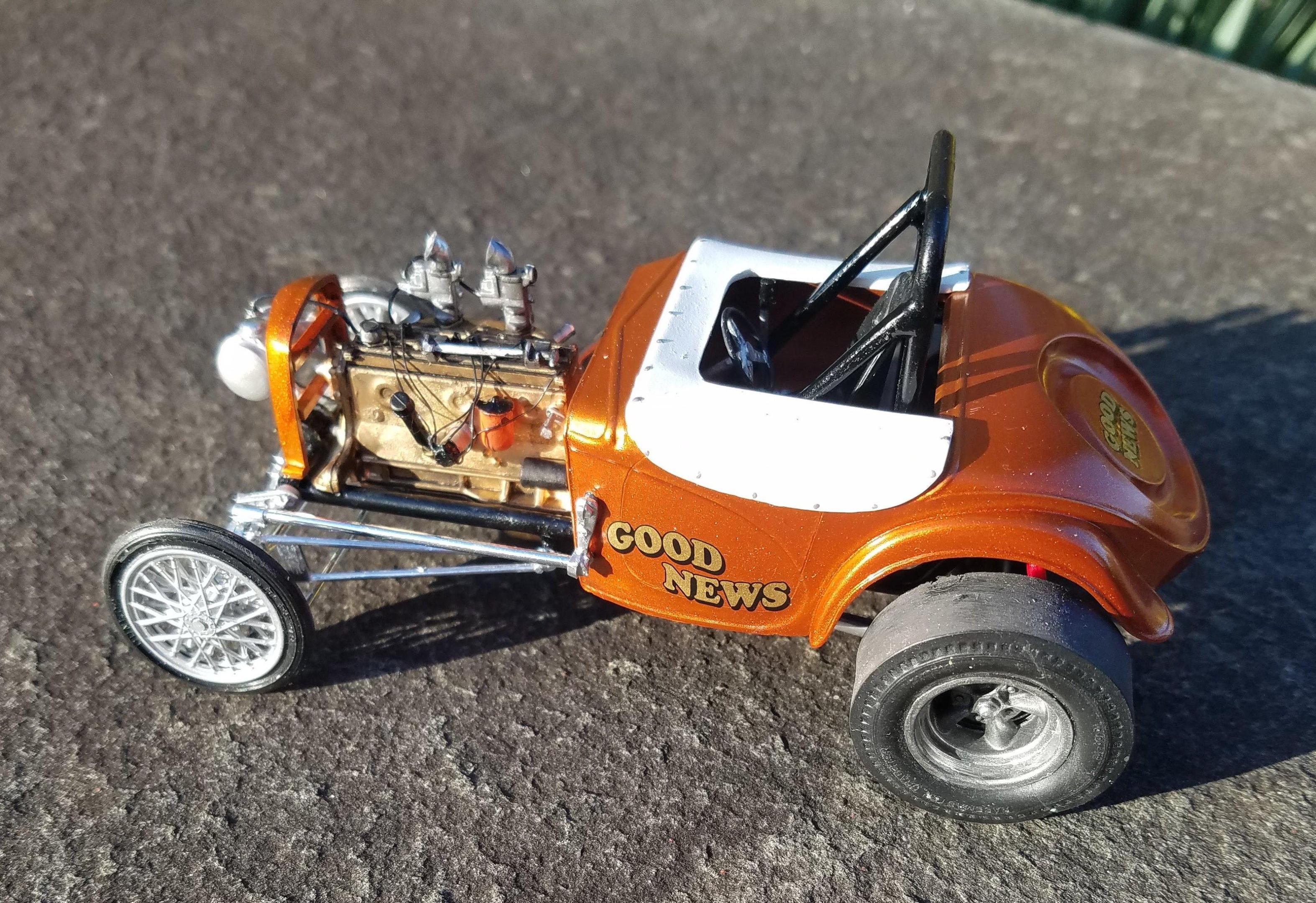 Got some more work done on the altered. The color is Tamiya Metallic Orange. The engine is basically stock, except for the Replicas & Miniatures carb velocity horns and 2 sets of exhausts from the Revell Tony Nancy Plymouth engine.