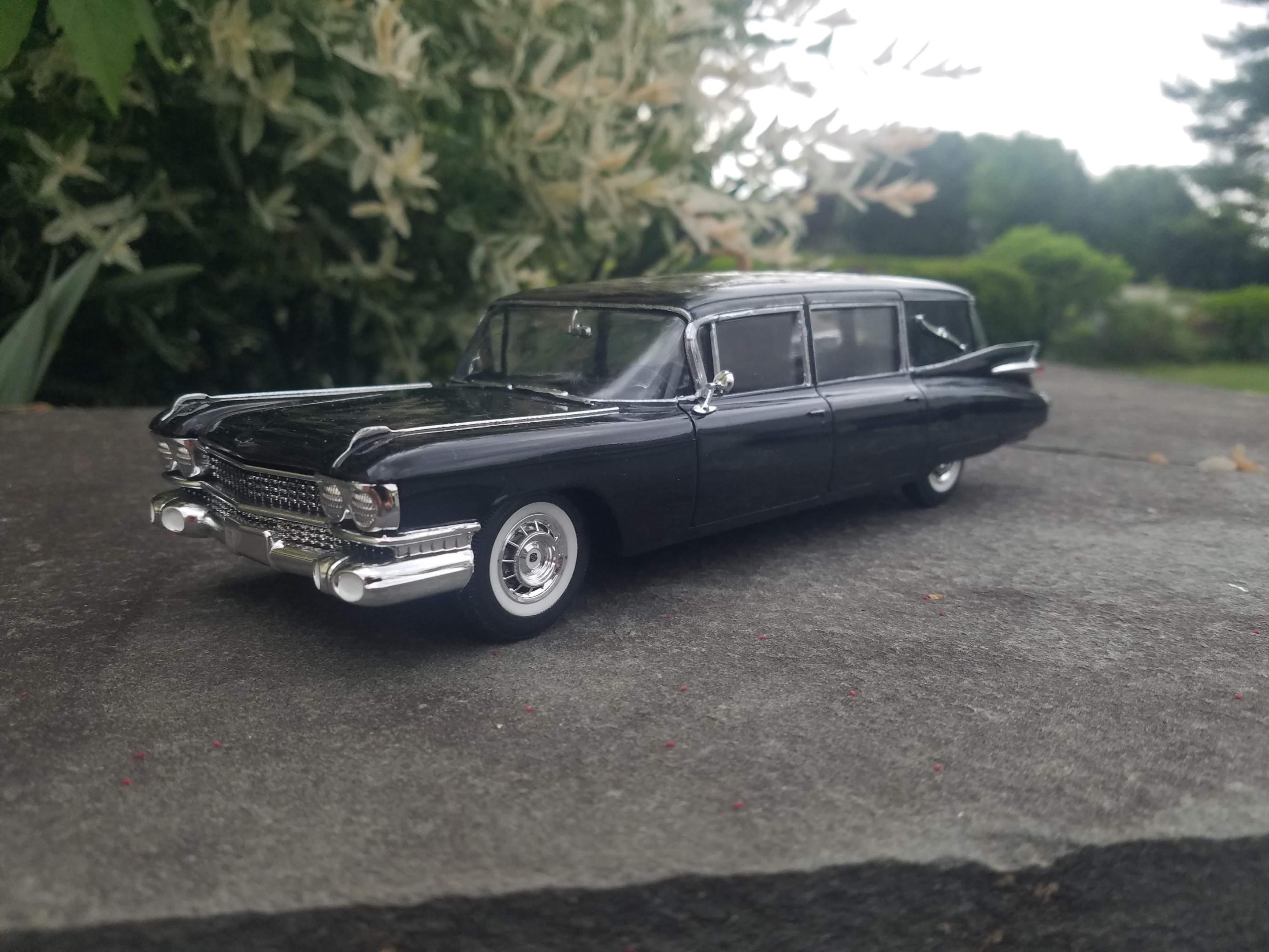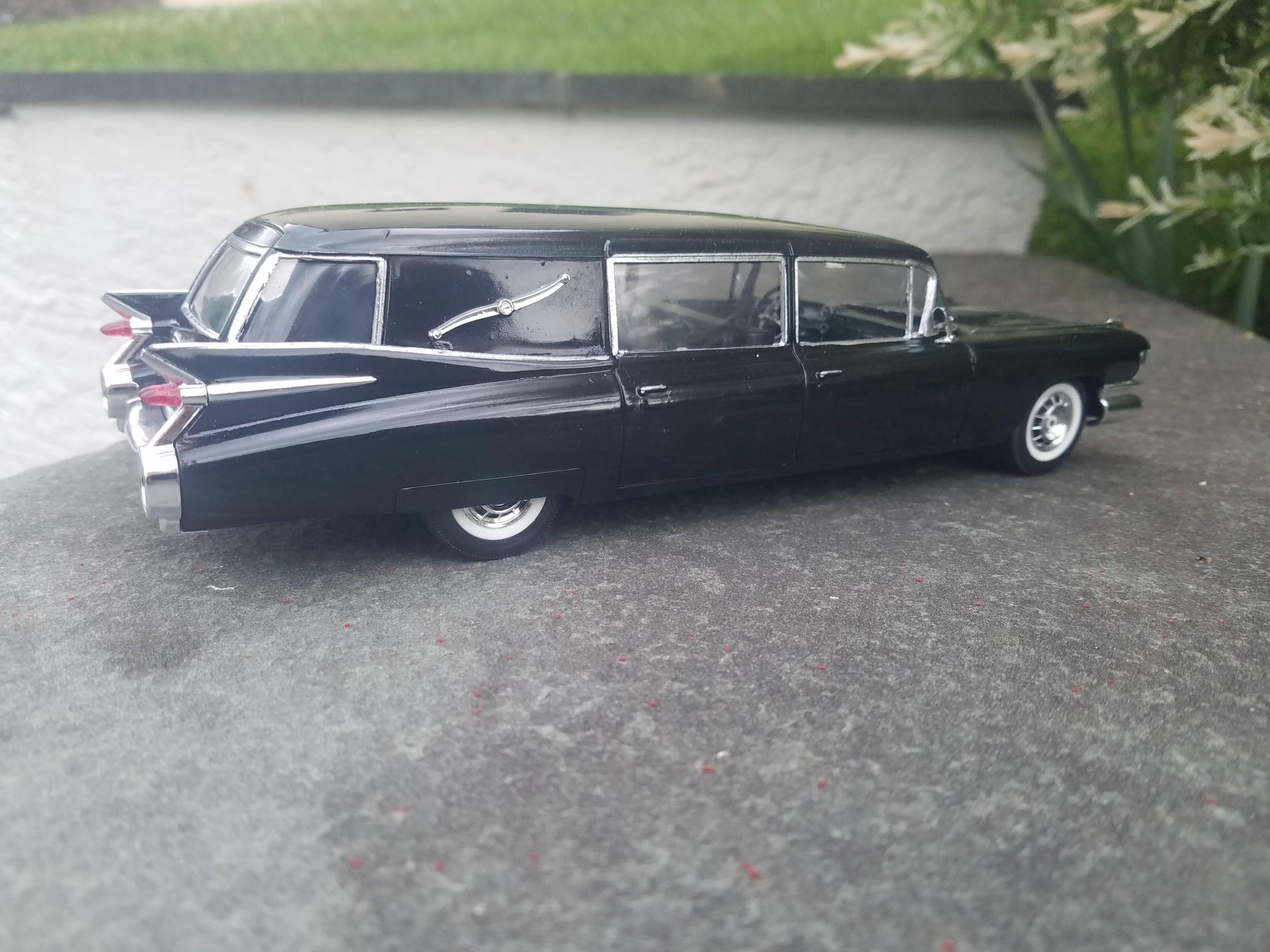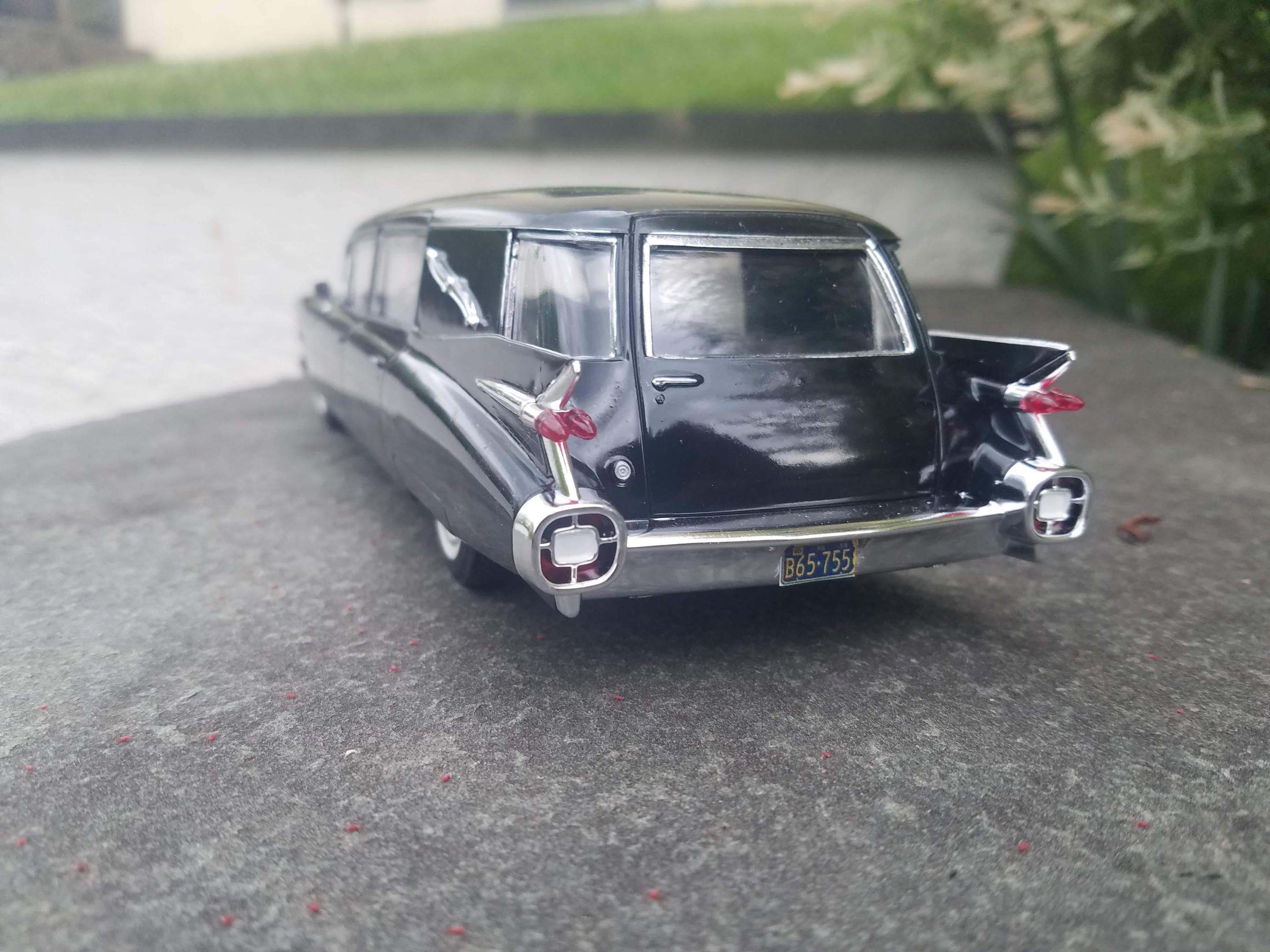 The new AMT ambulance seemed like a natural for this one. The fender antenna hole and roof holes were filled, Evergreen sheet was used to cover the windows. The Monogram '59 Cadillac supplied the wheels/tires and steering wheel, the landau iron is from the Monogram '58 Thunderbird. Paint is Testor's Black enamel, shot through an airbrush. The license plate was downloaded and reduced. If you gotta go, go big!
