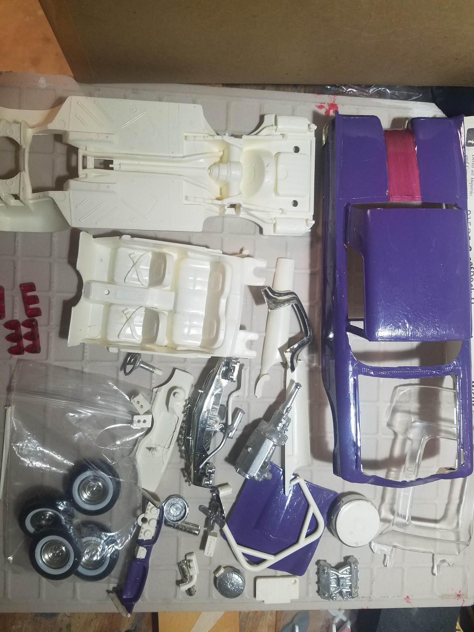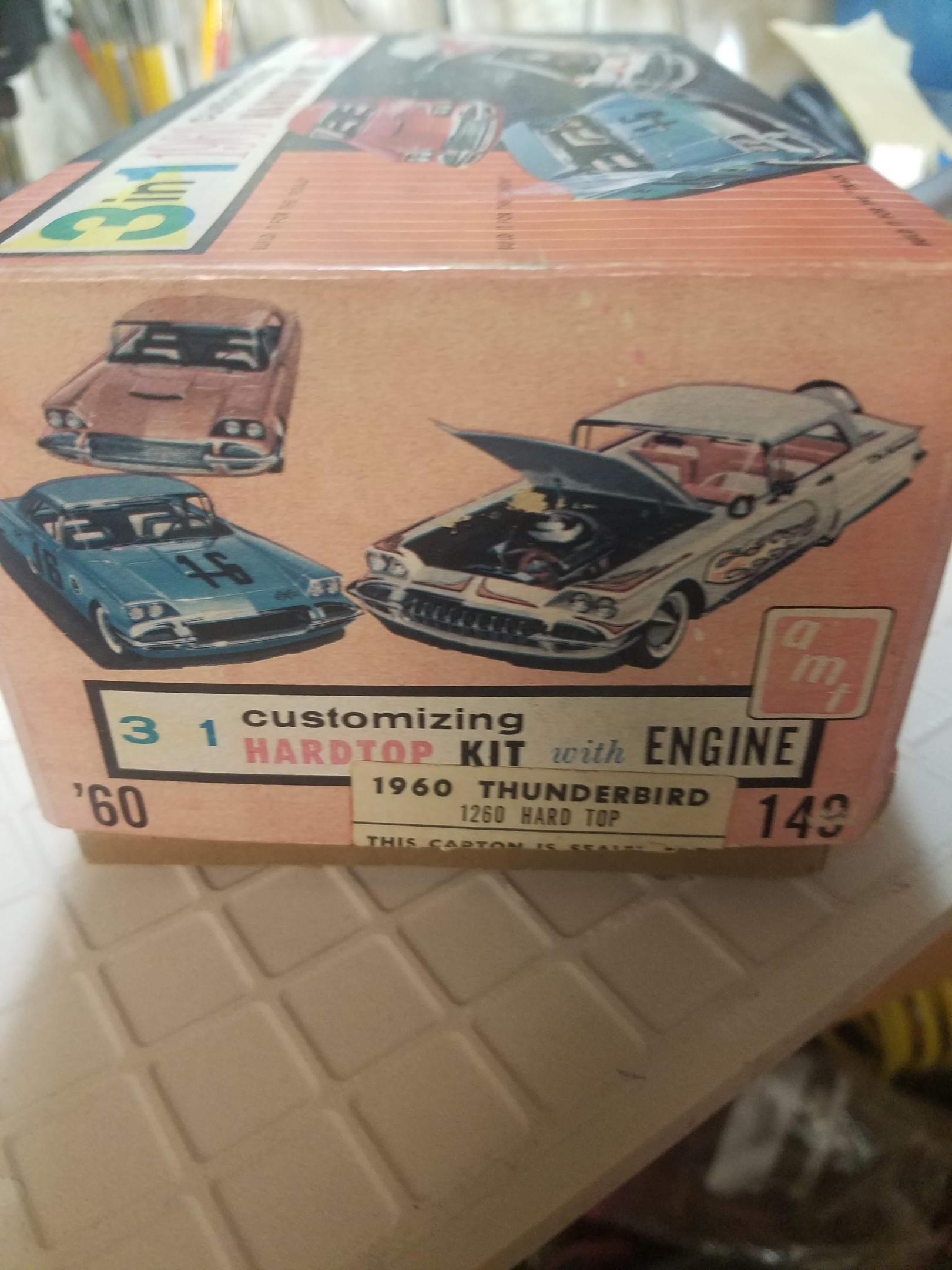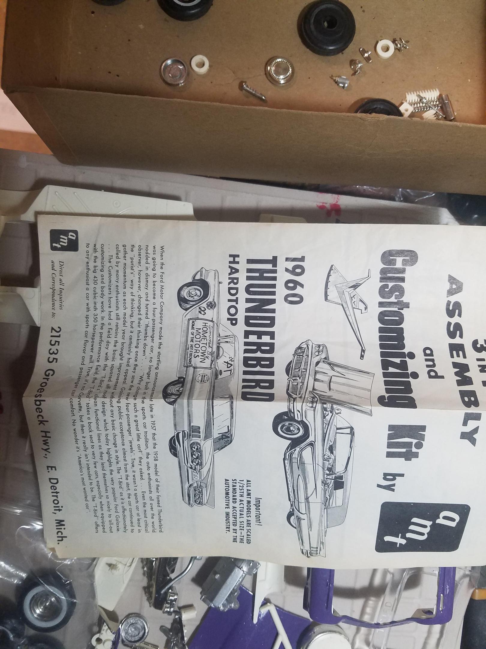 I picked up an amazingly intact AMT 1960 Thunderbird at yesterday's MAMAs contest; the only parts missing only the side pipes and fender ornaments. The paint is brushed on enamel, so a soak in the purple pond should take care of it. The chrome is in good condition, about the only unusable parts are warped tires (luckily, the current AMT whitewalls fit perfectly).