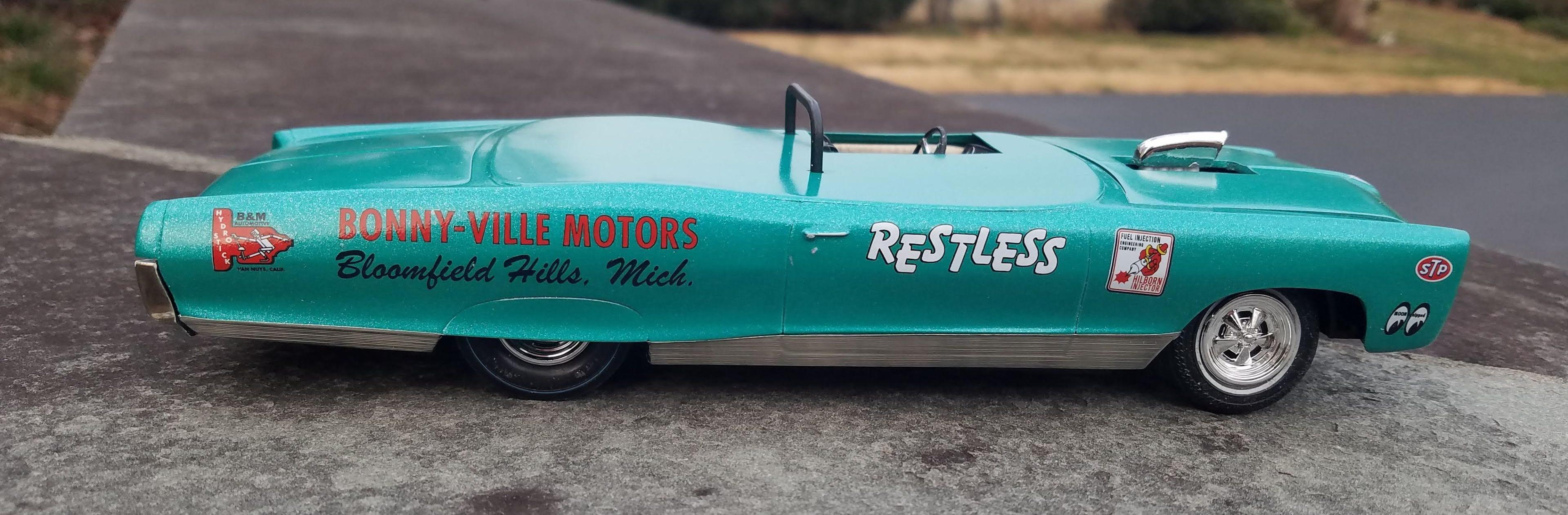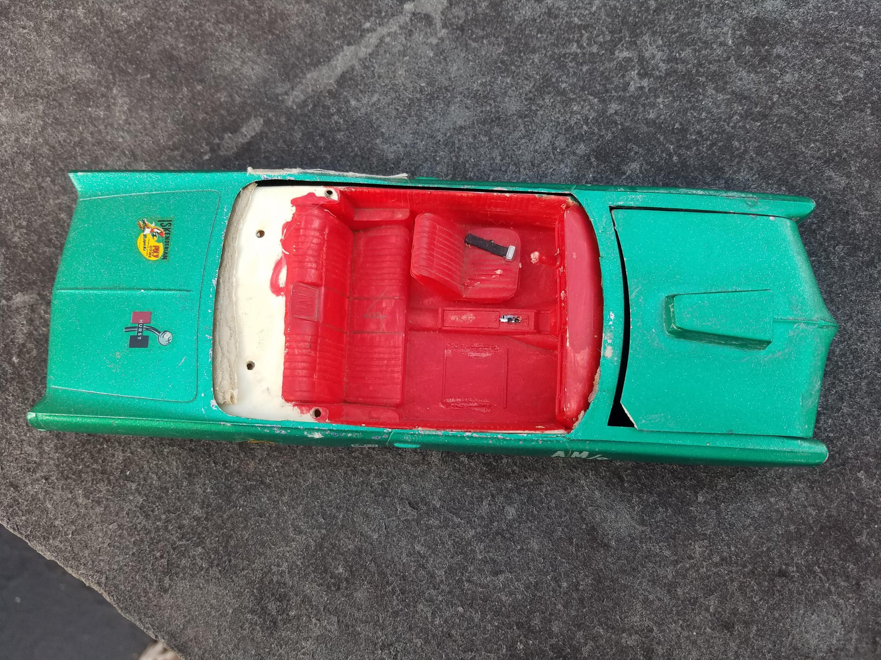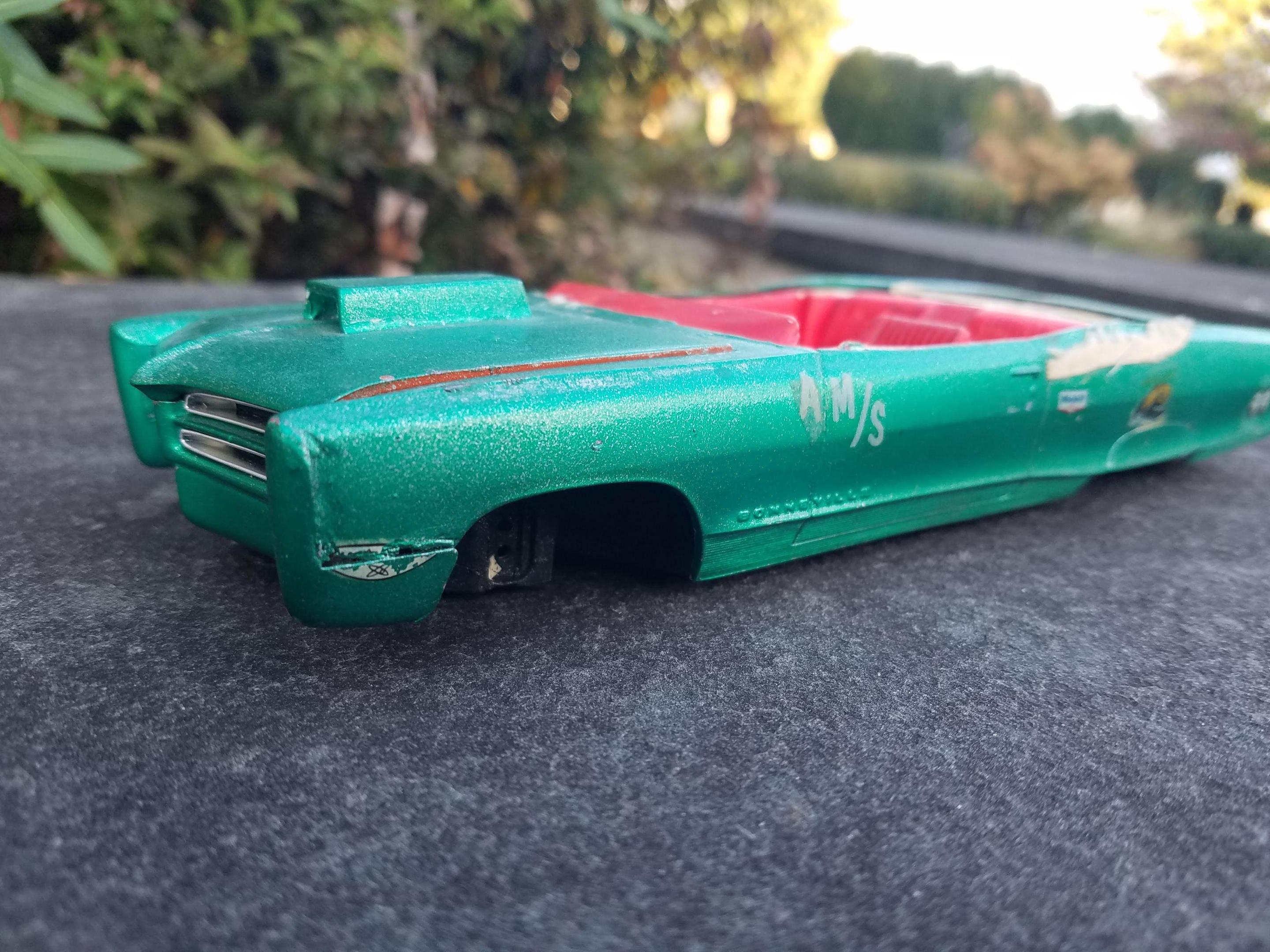 Even when I was 11, I was drawn to cars that shouldn't be race cars - there just something about a land yacht as a dragster that I find appealing. This MPC 1966 had a cloth tonneau cover, cut down kit hood scoop, Winfield Terra Thrust mags, and three distinct exterior colors : green, orange, and, considering the difficulty I had removing it, an AMT dark blue lacquer. I stripped the paint, added a tonneau cover from sheet styrene, molded the front pan, and dug out some Terra Thrusts from one of the newer issues of the AMT 1925 model T. The front tires are 60's survivors; the rears are new Goodyear Bluestreaks (I wish we had tires this nice back in the 60's). The engine is a Revell parts pack 421 Pontiac, the seat is a custom seat from the Bonneville from which I had to strip yellow Funny Fur, the roll bar is from the Revell "Miss Deal" kit. I need to primer the body and repair any (or many) rough spots. I think the final color will be Testor's Emerald Green metalflake.