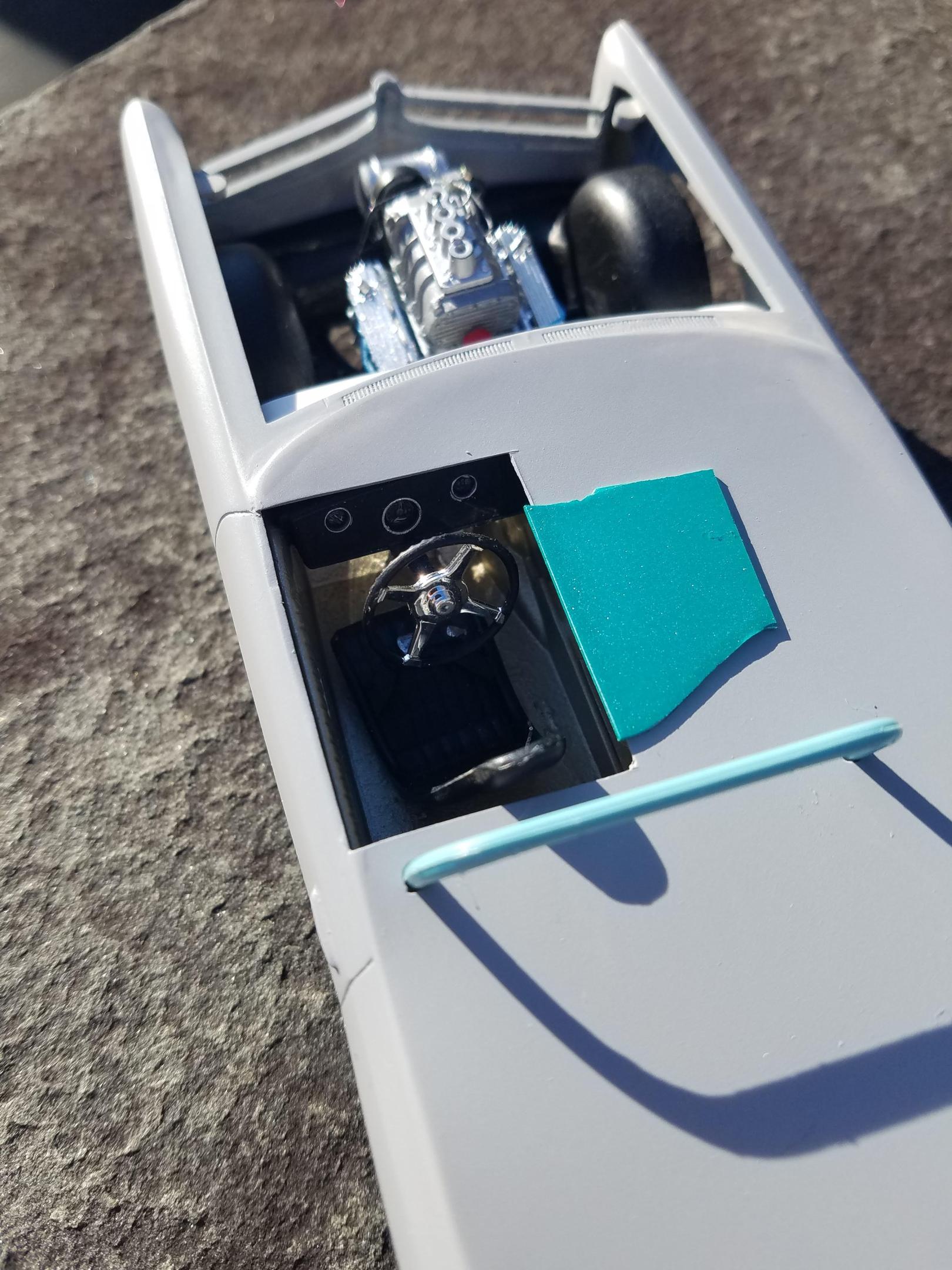 I got some more work done on the Bonnie. The engine has been plumbed and installed - the Moon tank is from the Atlantis Mooneyes dragster kit. The interior was painted Tamiya Titanium Gold. The instrument panel is from the AMT AWB '65 Chevelle. The steering wheel is from the AMT '57 Chevy, the seat is the custom seat from the Bonneville. I decided to paint it Testor's Tropical Turquoise metalflake, as it looked a bit closer to the original green.