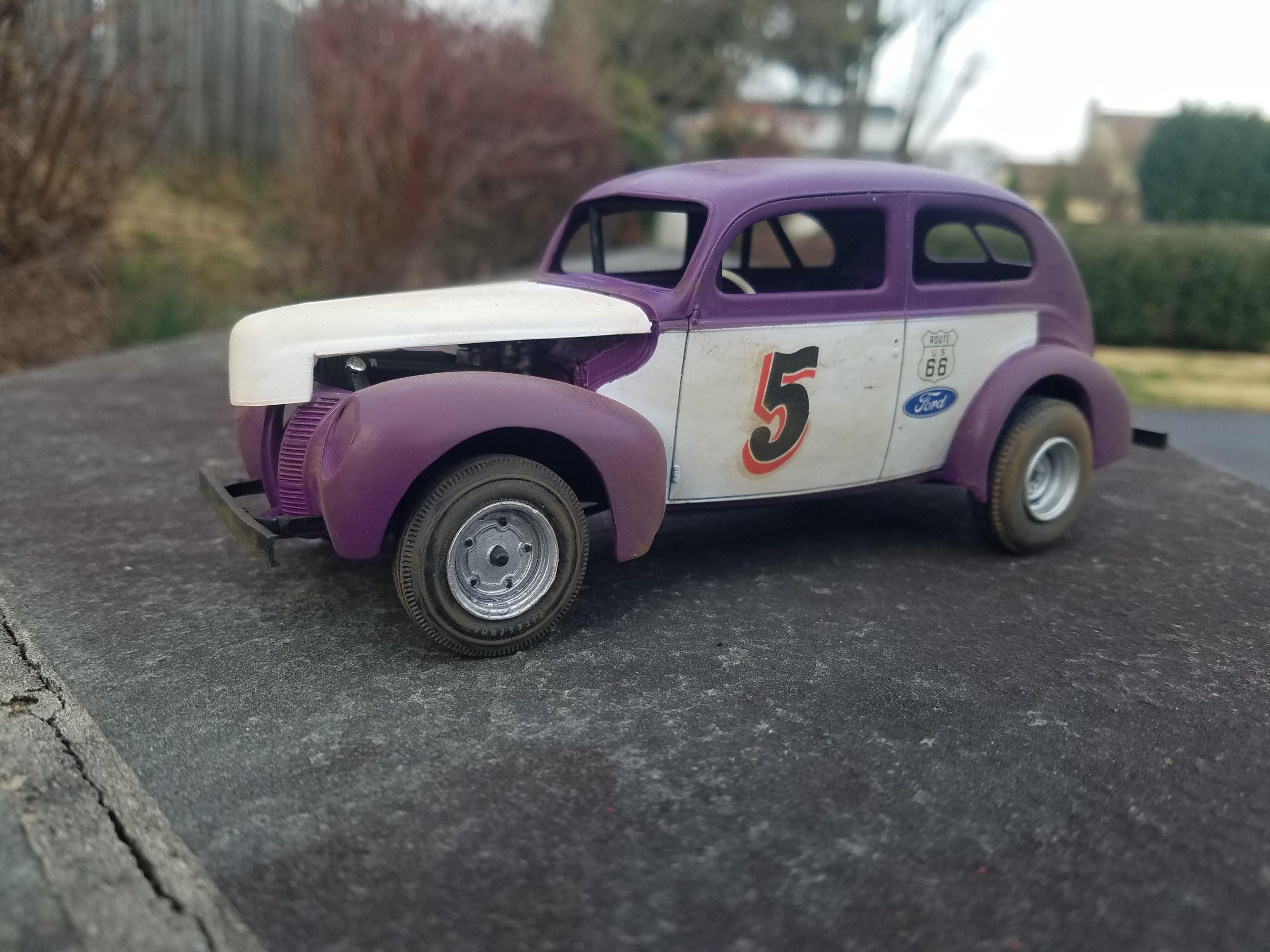 I had a bunch of AMT '40 Ford parts that weren't going anywhere, so why not take 'em out on the track? I removed the molded in windshield wipers, hogged out the wheel wells, removed the running boards, sanded down '39 Ford headlamp buckets as light covers, and cut away the sides of the hood (which may be the '39 hood). Inside, the rear seat was removed, the former location of the window and door cranks were drilled out, and custom seat from an AMT '37 chevy was installed. The stock engine was painted Tamiya British Racing Green; the AMT air cleaner was replaced with one from the Revell '40 Ford coupe. Rear tires appear to be truck tires, mounted on AMT '32 Ford steel wheels. The front tire/wheels are a mixed bag - the passenger side wheels are from the first edition of the AMT '36 Ford, with a Revell '50 Olds tire; the driver's side is a later AMT '36 wheel on a parts box AMT Firestone tire. The body was painted Tamya Pure Weight and Lavender, bumpers are Evergreen channel, and I used whatever decals I could find from my stash. -