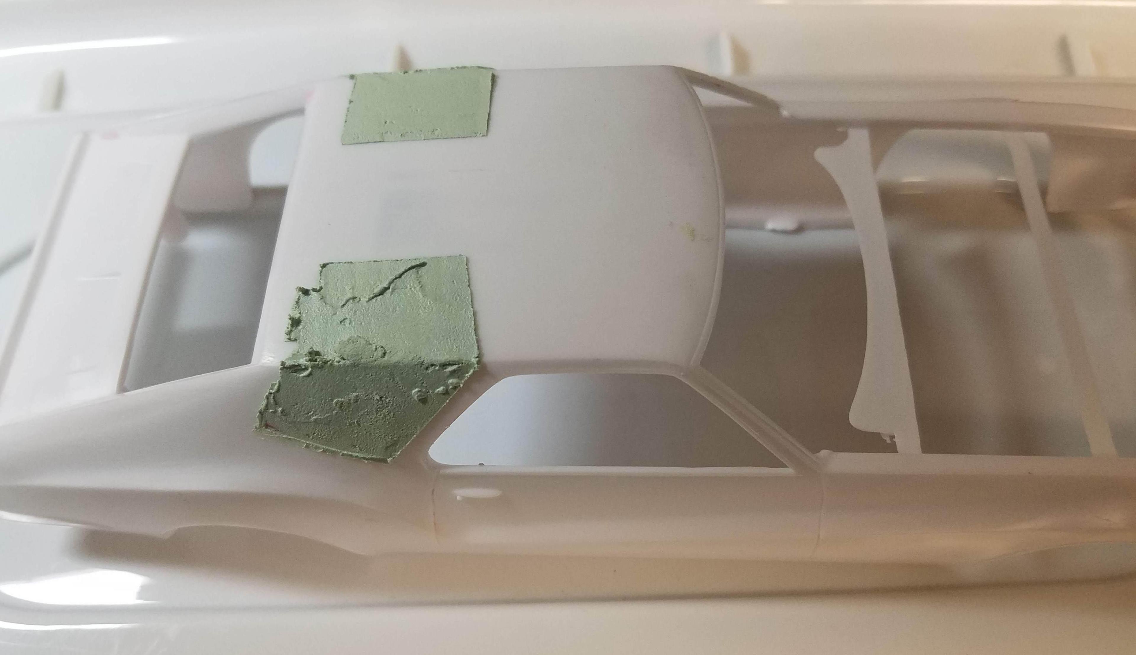 Heading into the homestretch. I tinted the upper part of the windshield with Tamiya Clear Blue and added a photoreduced 1968 Pennsylvania inspection sticker. The glass, interior, and chassis have been glued in place, I just need to add some details to the engine bay, glue on the taillights, side mirrors, and grill/lights, and call it done. I probably should have dusted it before taking photographs.