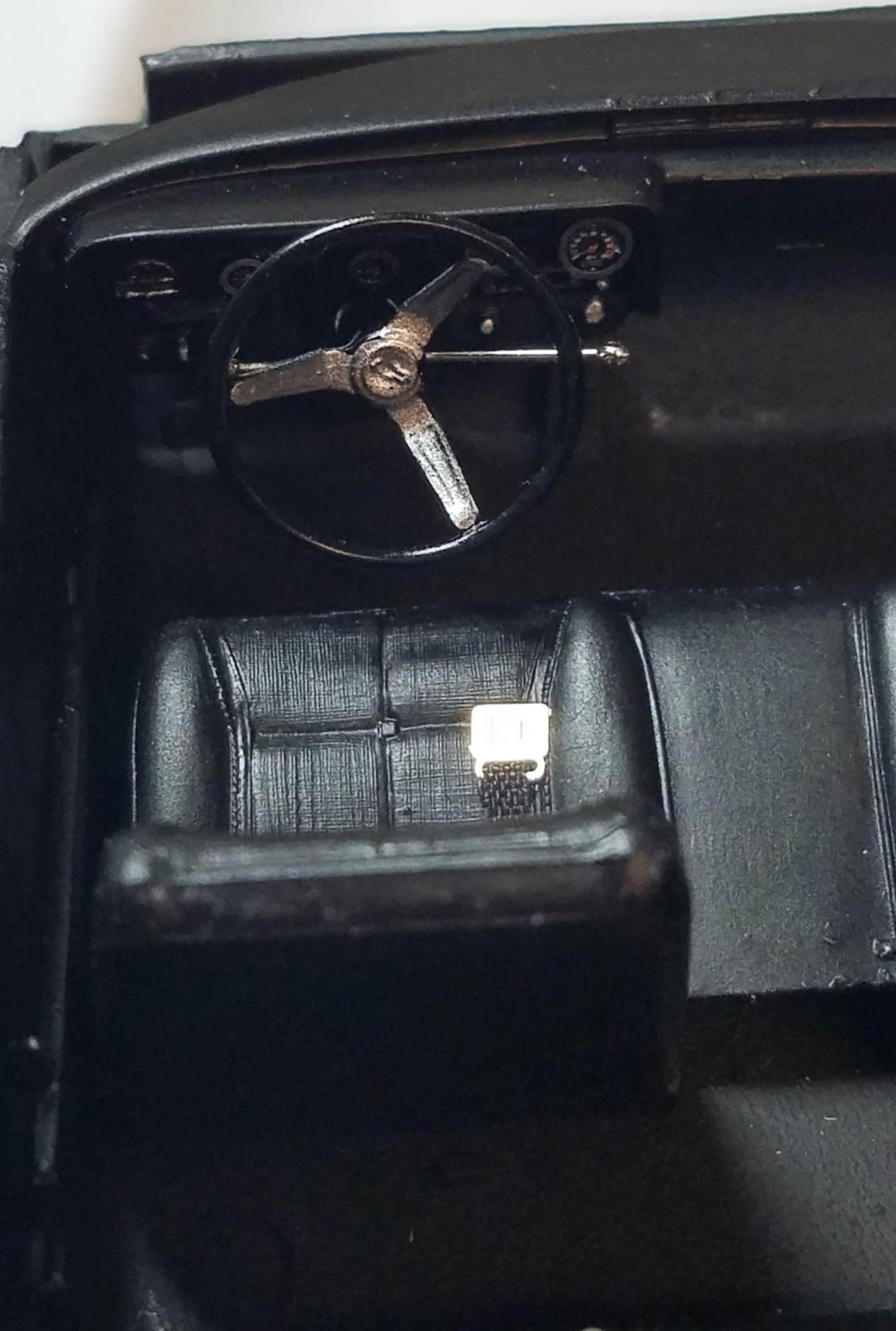 I completed the interior. I painted it Testor's Enamel Flat Black. In order to simulate leather, I masked off the floor and rear shelf, and painted it with Testor's Semi-Gloss Enamel. The steering wheel is from the parts box (looks like a Chevy). The turn indicator and shift are a straight pin with a blob of 2 part epoxy on each end, the blob was hit with a Molotow chrome pen; all the small chrome bits are Molotow. I used bezels from a Model Car Garage photoetch gauge set with the kit instrument decals. The seat belt buckles are also Model Car Garage items. I used the kit-supplied bench seat because it looked classier than the buckets. Photo-reduced copies of the April, 1968 Playboy and Cream's Disraeli Gears round out the swingin' interior.