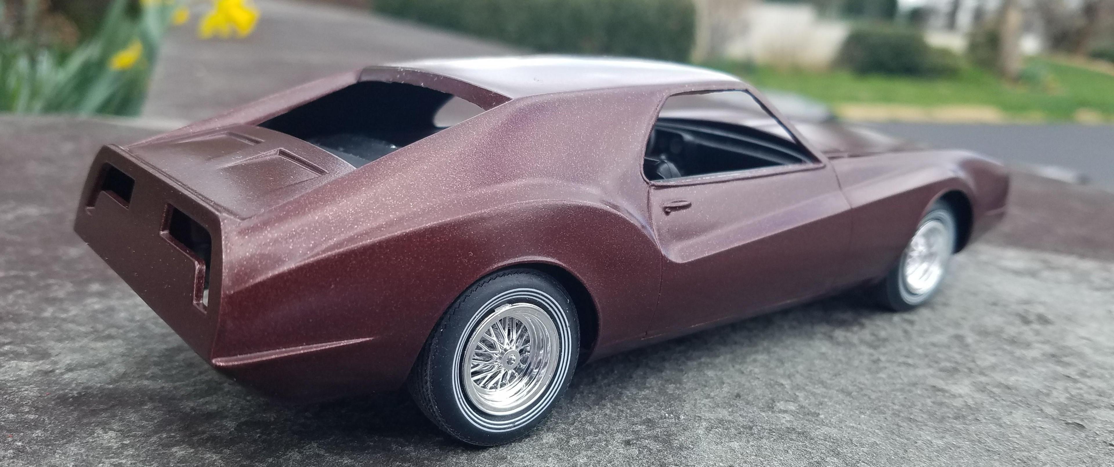 Tom, Thanks for posting this - it illustrates the stance problems with the kit-supplied wheels. You could just add some patina and you'd have a rat rod that's different. Another thing I considered was filling in the roof gills, simulating a vinyl top, molding in a continental kit, and adding some wide white walls and wire wheels for a FWD Super Fly-mobile.
