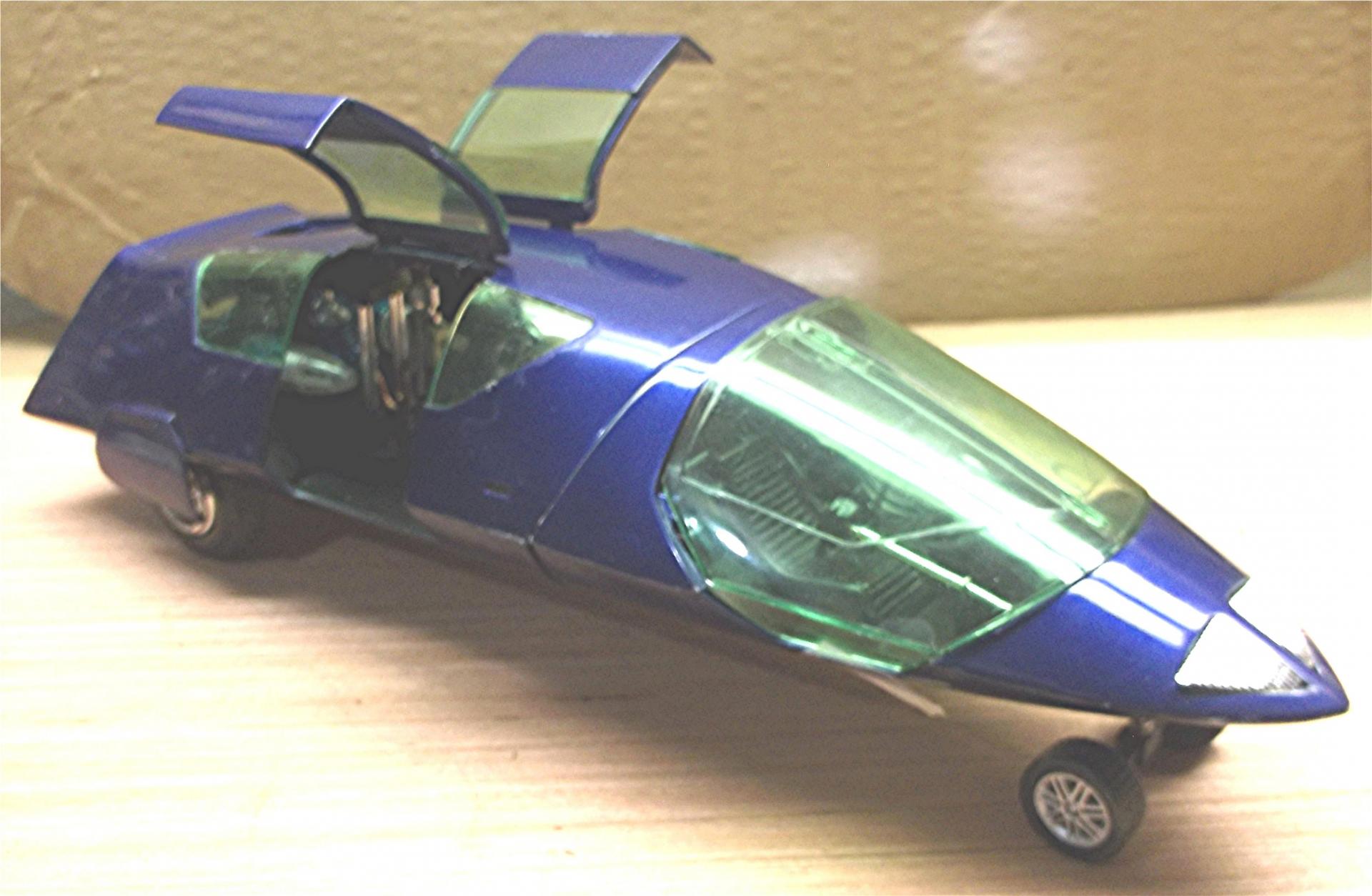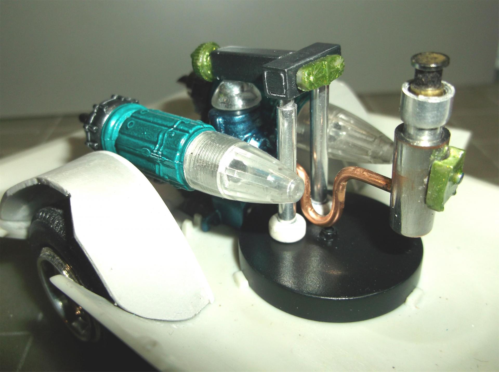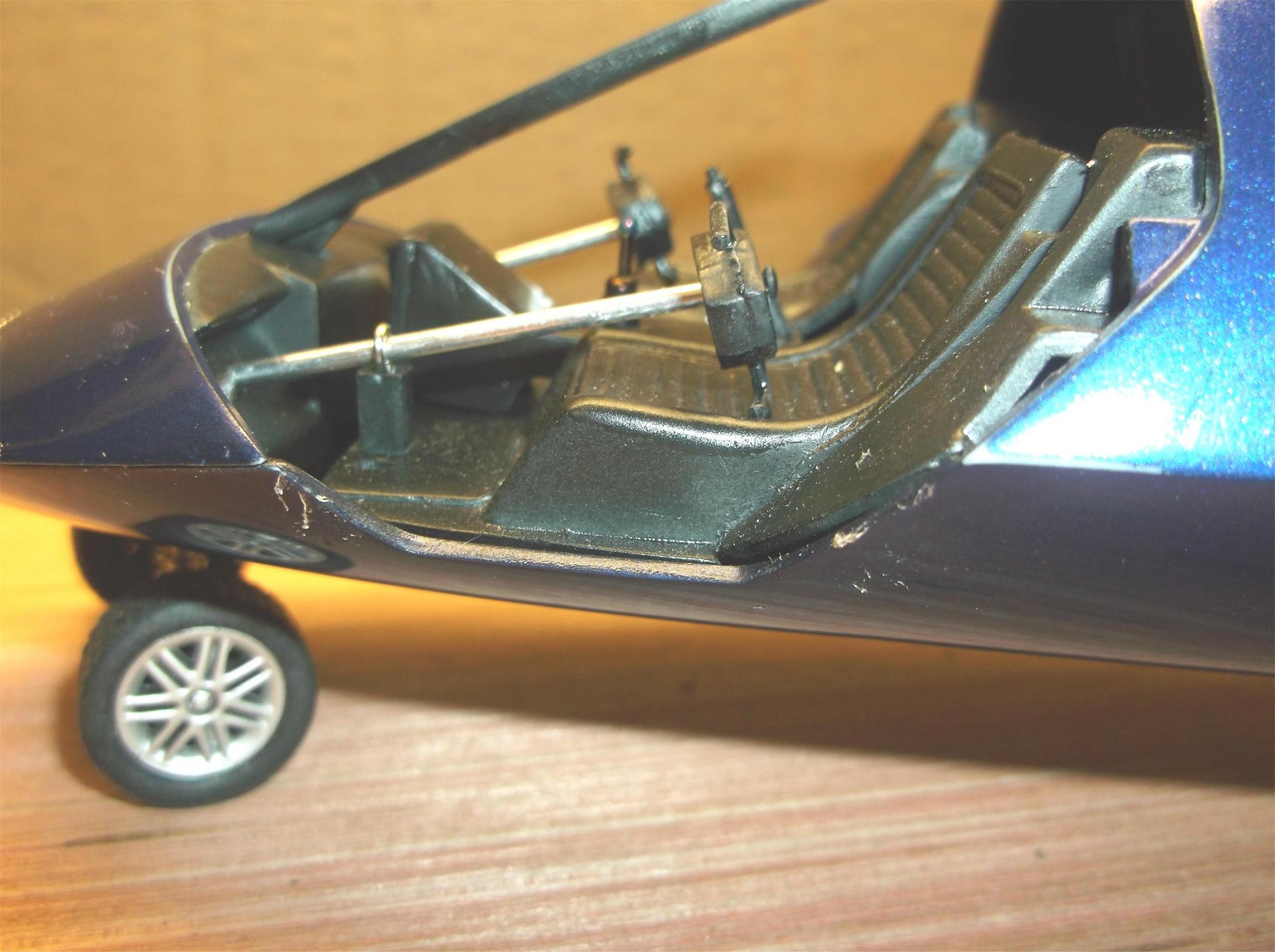 MOON TRASH 3 AMTronic Highlights of the build. I did do the engines similar to my original plan. I modified the two rear ones to look a bit more cool and aggressive, at least to my eye. I moved the front engine to the rear and connected it to the two rears. My theme on the engines was to make them look like garbage cans. The air intake I designed to look like an Insinkerator. I modified the interior, using two of the rear seats instead of the kit front seats. I designed this so either front seat occupant could drive at any given time. I made the steering wheels to look airplane related. The front wheel assembly was also aircraft inspired. I made my own inner rear wheel wells. I had to cut a hole in the bottom to get the rear pumpkin to mount the axle below the underside to get a higher ride height to off-set the height added to the front. It would have been like a nose high Gasser other-wise. The paint is DupliColor Sonic Blue Pearl (name kinda added to the theme) from the rattle can. This kit was, shall I say, troublesome.