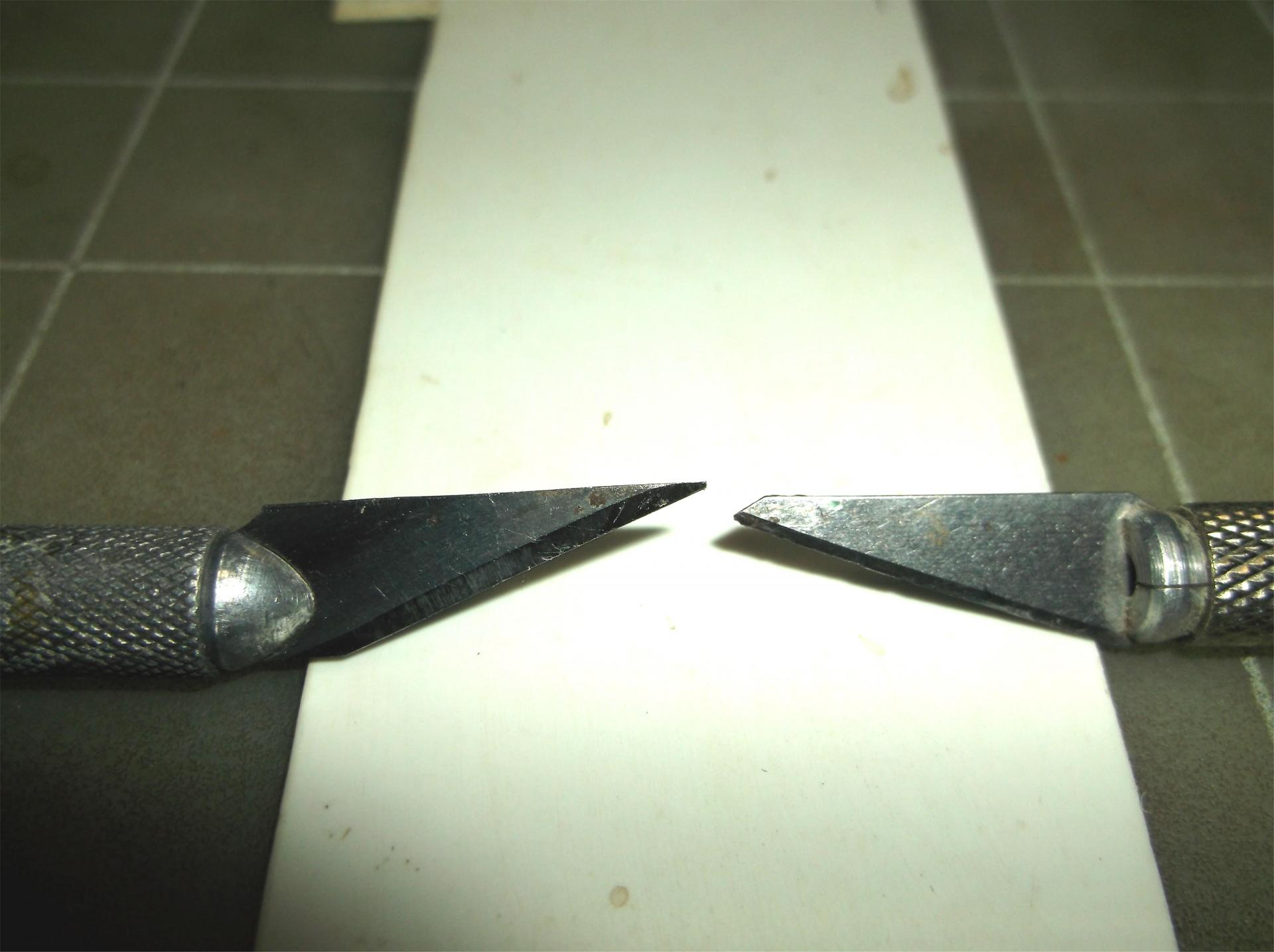 In my experience Tom, the cheap knock offs I have are different in two ways from an X-Acto #11. The first pic shows the difference in the tips. The #11 is on the left. The tip of the KO on the right is not broken off. It came tapered like that. Also, the KO is about 1/2 the thickness of the #11. I use this to my advantage at times when scribing as it makes a thinner line. It is hard for me to take a good pic showing this but if you look near the clamp areas you may see the difference. I'm also not sure if they will interchange handle wise. My KO came as a set and I use the handles it came with. -
