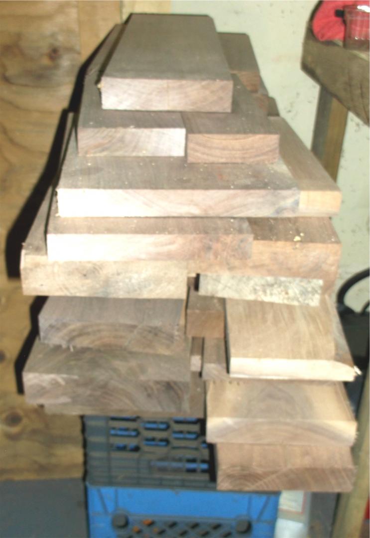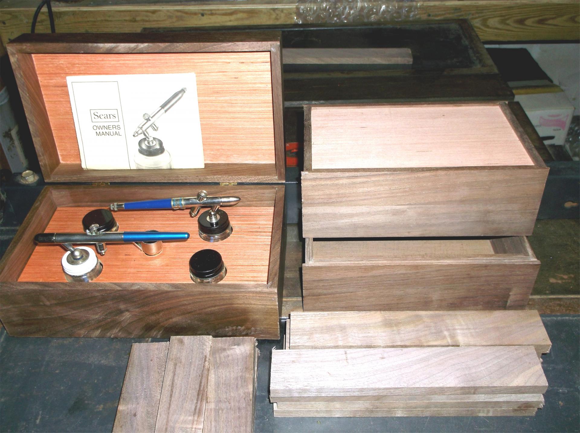 1. Really nice boxes! I've been keeping an eye out for some 10/4 or 12/4 maple since I acquired the walnut. The walnut was all rough cut when I got it. I need to hone my woodworking skills, along with my airbrush skills. I gave one box to the people I borrowed a planer from. This is most of the walnut and a couple of the boxes. The pieces are my next one.