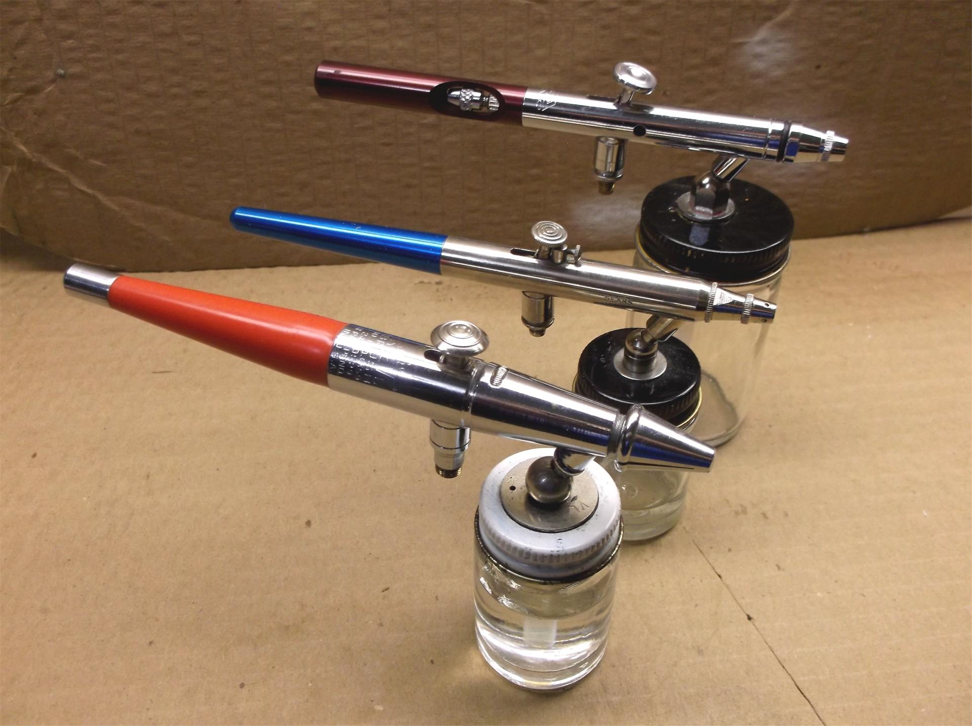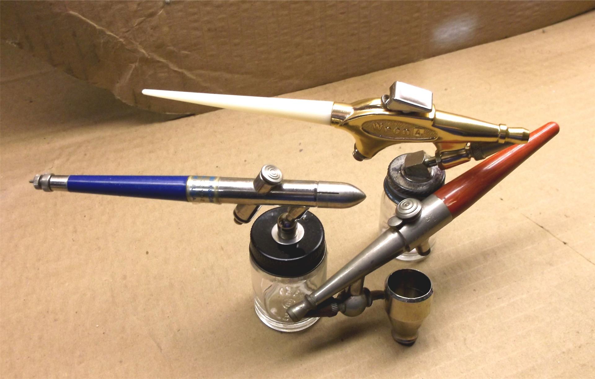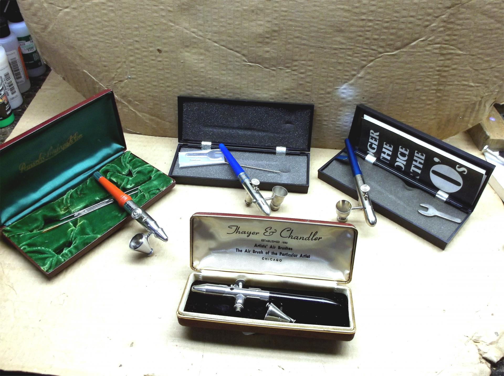 A few examples of a double action, side feed airbrush. In front is a vintage Thayer and Chandler model A, On the left is a vintage Paasche V, on the extreme right is a Badger 100XF and the center rear is a Badger 100XFL, left handed model. To my knowledge the T&C only uses a fine needle/nozzle combination. The Paasche V can be changed to either fine or medium needle/nozzles and the Badger 100 XF will accept all three combinations, fine, medium and heavy needle/nozzles.