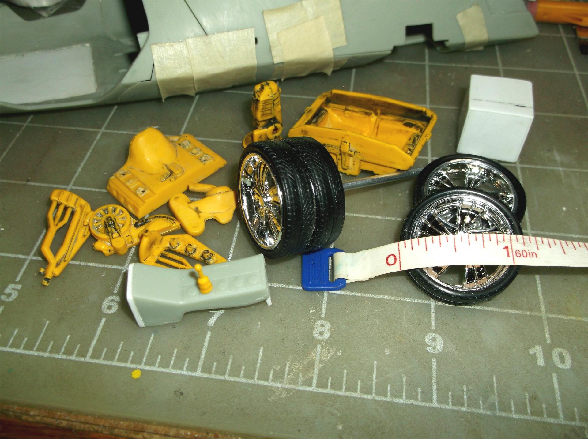 I have been working on the Amtronic, I try to do at least something everyday. Spent a lot of time just sanding the body for paint prep. I used 400 grit wet or dry, sanded dry, to knock the sheen from the plastic. I started to fab up the center console, I made a mini fridge and I was able to strip most of the flat black from the engine. I've reached a snag. The low profile wheel/tire set that I was going to use isn't large enough in diameter. The rear squats too low with the front tires in place. I have an ad in the truck trade section but this is what I need: I am looking for a complete set of pickup on road tires, with the inner and outer wheels.I prefer something a bit wide but beggars can't be choosers. I need the tires to be somewhere between 1-1/4" to 1-5/16" in diameter. The '58 Chevy's are 1-1/8". Semi wheels and tires are too big. If you have a skinny set I may need two sets to run duals. I'm sure I can find something here to trade for them. Edit: I worked on the center console. If you look at the first pic there were 5 gauges on the drivers side and a raised portion representing a glove box opener on the right side. One gauge I drilled out for the shifter and I sanded off the rest. I put in what was important. CUP HOLDERS!!! I had an Ebrake lever off the 911 but I seem to have misplaced it. I found one from a Ferrari 308 rebuilder that I have. It's in the brake on position but I can live with that, at least I know the model won't roll away.