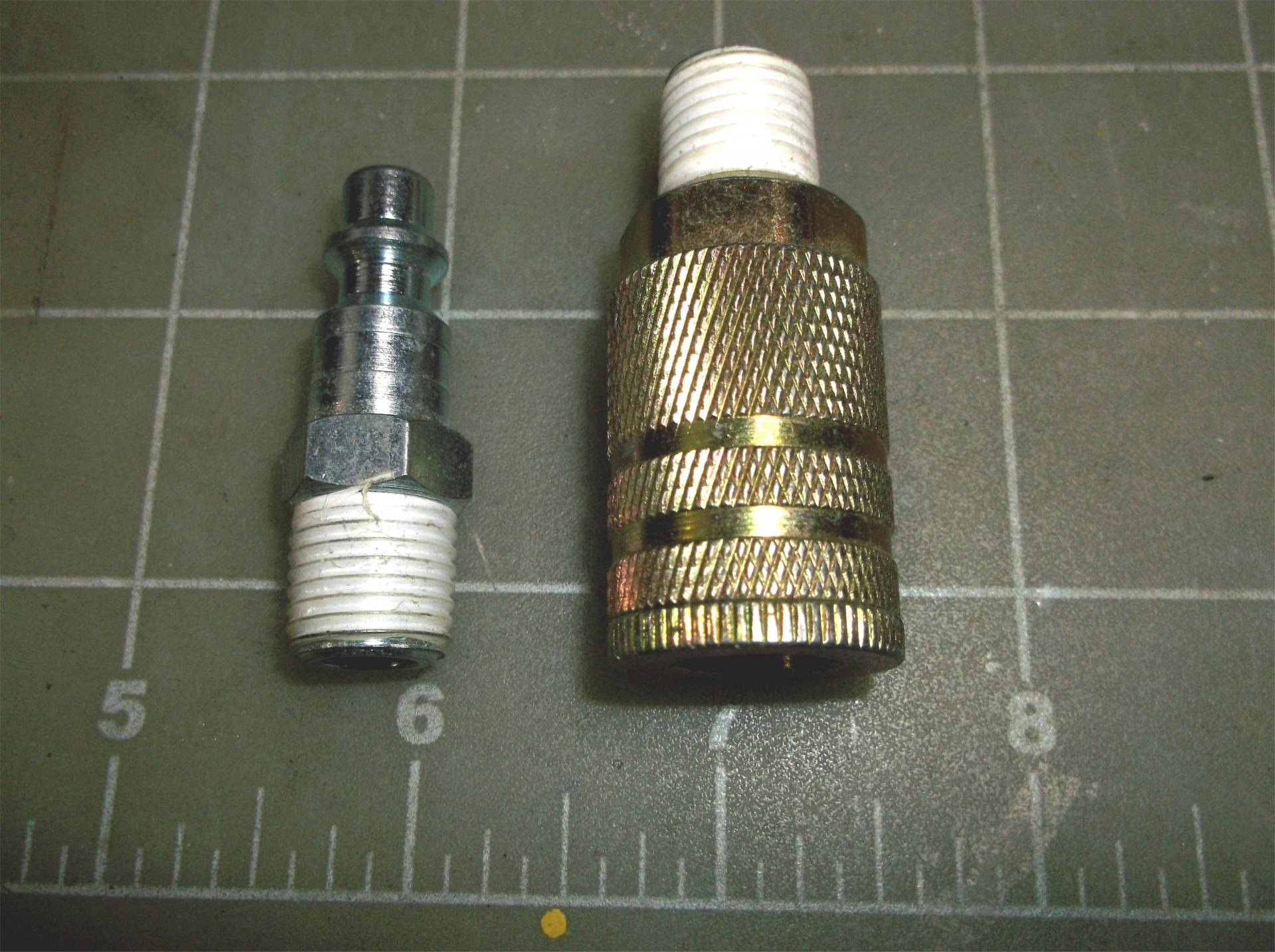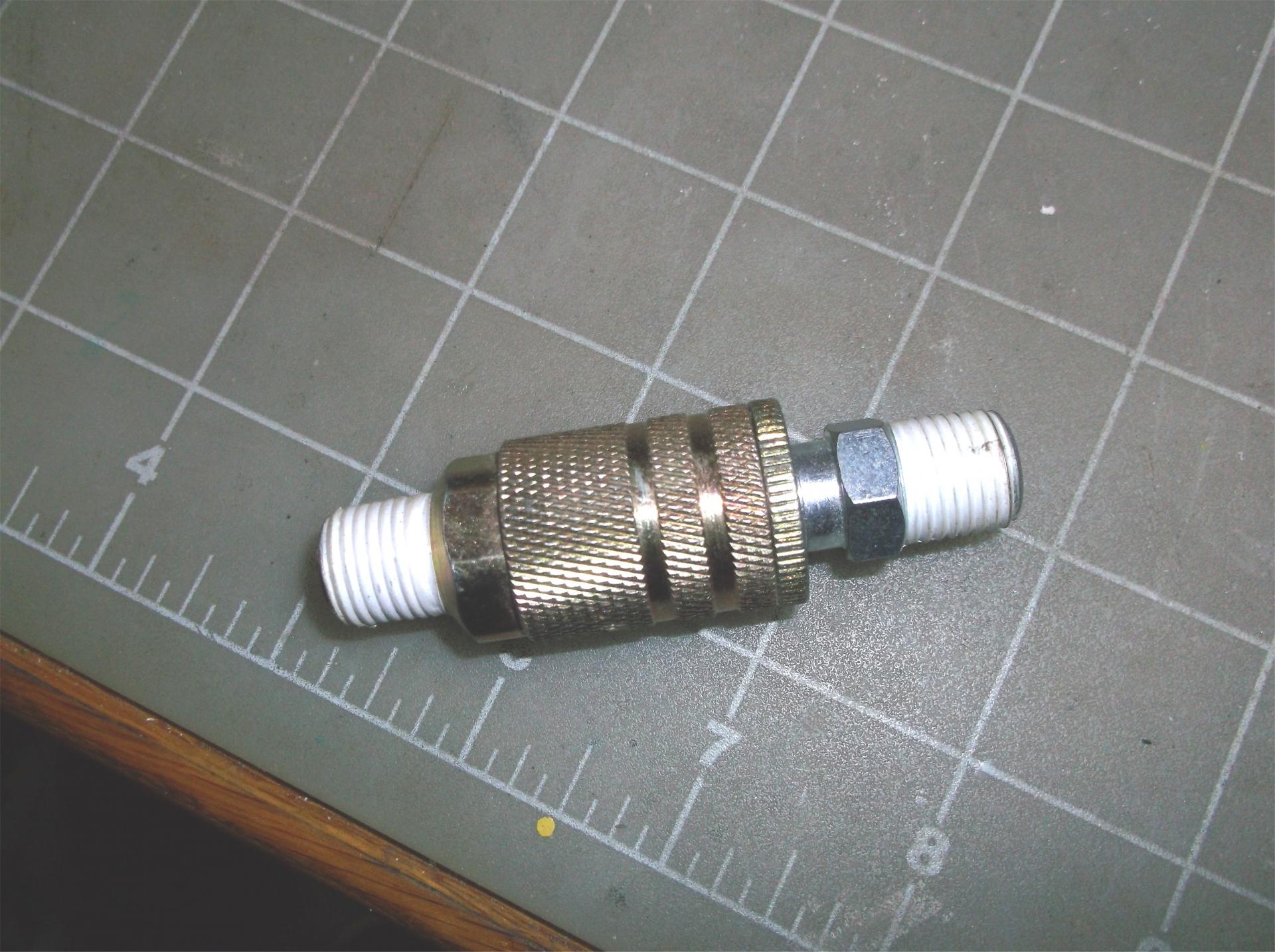 Your airbrush hose should attach to the connection off the water-trap. A better way would be to get a set of quick disconnects. The silver one would attach to your hose. The gold one would attach to the water trap. My gold one in the pic has a male end. You will need one with a female end. Also, use teflon tape on all threads. Hope this helps.