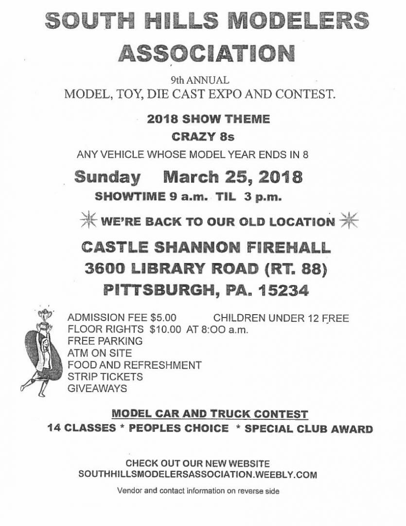16. Monthly meetings for the South Hills Modelers Association in Pittsburgh Pa. Come attend a meeting on the SECOND Monday of the month at the Waterfront-Homestead Eat 'N Park (245 E. Waterfront Dr., Homestead, PA 15120). We start the meetings at 8pm, but you can stop by earlier, and meet the crew. Hope to see you there!