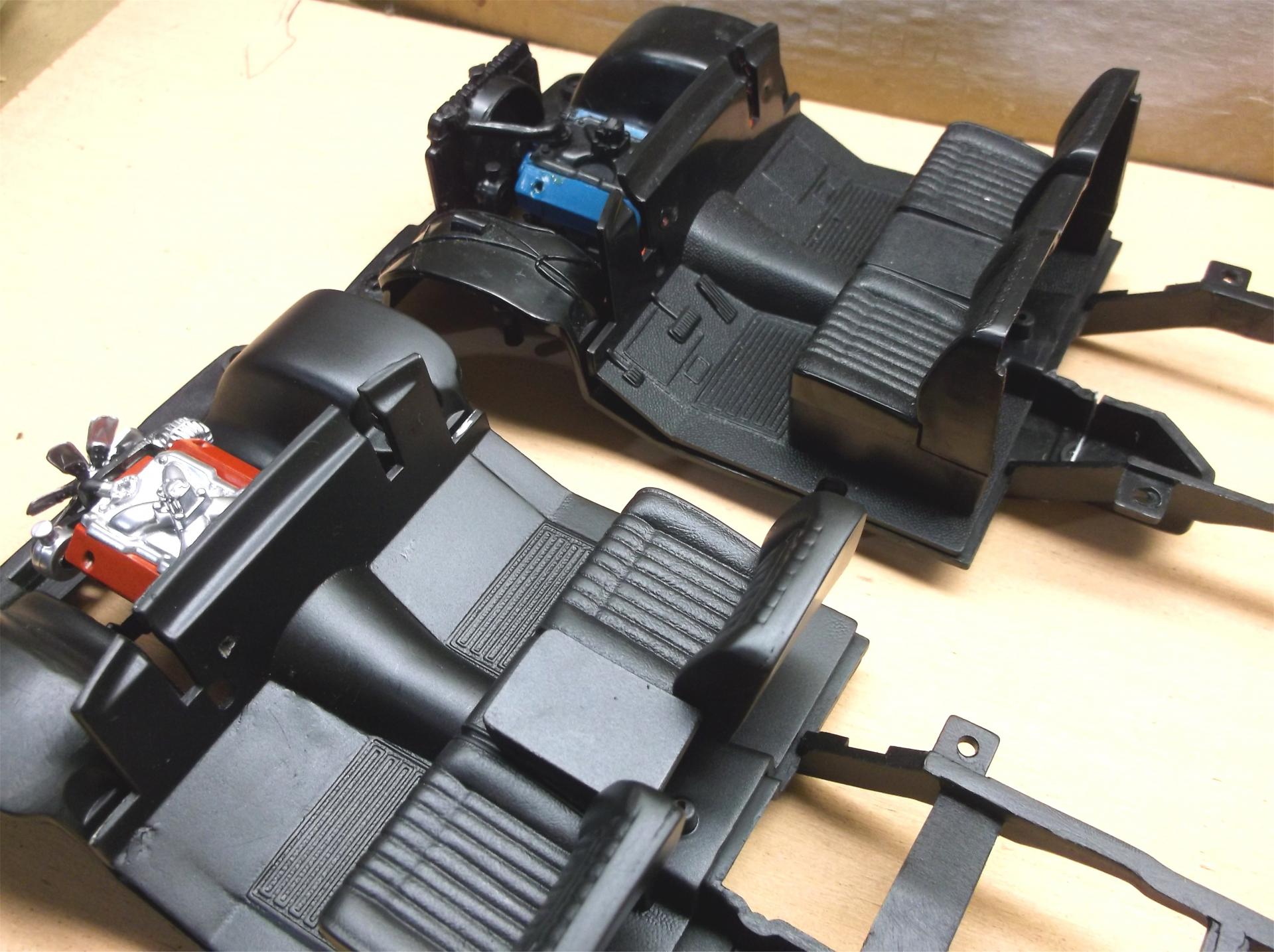 3. Well now, it has been a while. I have wanted to get back into doing some type of modelling again. I had pulled out a few of the kits I have started, looked at them for about ten minutes then boxed them back up. The urge for finishing one just wasn't there. I got the inspiration to restart this project. Been mostly painting stuff. My original post states that I'm anal so it could take a while. I've since decided to for-go most of the itzy-bitzy details I had planned. I'd rather get it finished. I ended up buying a complete Lil Red truck as my 1st post mentions I want to use it's wheels/tires. Being I have almost a complete spare truck and this is a die cast (which means all I have to do is remove screws), I can always go back and change things if I choose to do so. Lil Red has come in handy anyway. I started with it's frame and I cut the (fake) spare tire out and cleaned up the inner front fenders. Most of what I've been doing is painting. I used the Warlock interior as the lower inner door panels will be correct although the rest was molded in red. All paint is Dupli-color rattle can. I used a matte finish on everything (still gotta apply to intake manifold) except the oil pan. I made the gas and brake pedals. I know that the red on the engine isn't correct, it's what I had on hand. Comments welcome, good or bad. Pics would help huh?
