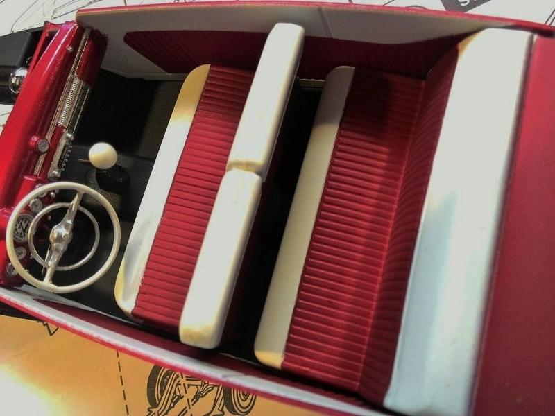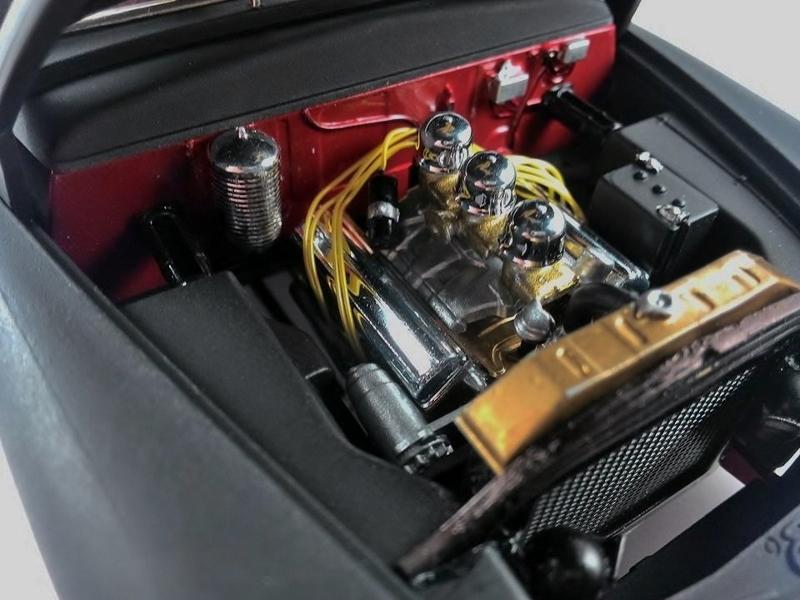 A simple kit but a lot of fun. Painted with Model Master metallic black & flame red. Roof was sprayed with Dullcoat & tires & wheels are from parts box. Interior is detailed & engine is wired.
