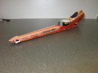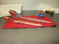 The body after applying the decals and before a clear coat. A new sharp blade was used to cut the decals before parting. I touched the engine bay, damaged edges and the parting faces near the red sections up with some red paint before clear coating. The inside was painted aluminum to stop light bleeding through. The decals are of a great quality and were cut up in some places to avoid any lettering ending up on the body seam. Some long decals were also cut in two pieces to help applying them straight.