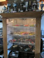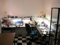 I was lucky to build this hobby room last year after building for decades in the corner of a bedroom. Made this work bench from IKEA kitchen sink shelfs and some coated chip wood. Amazing that no matter how much working space you have it always ends up cluttered up with trumpery. Check out the display cabinet I made from the old fireplace downstairs. -
