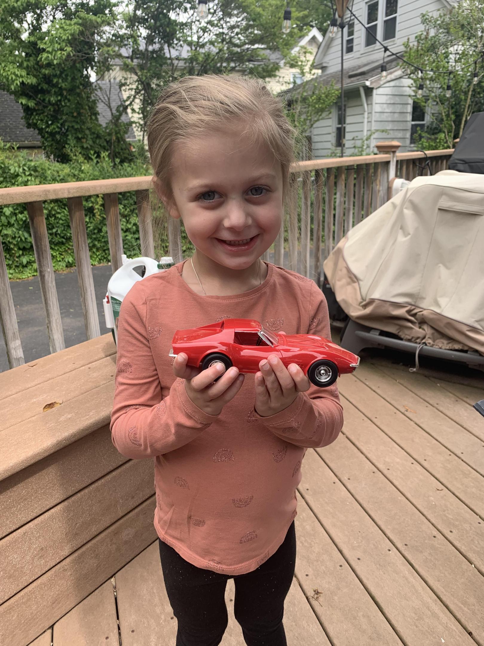 I just gave her a nice big brush with a paint cup of future floor wax, told her to paint the whole car except for the tires. We let it sit overnight and it looks like this! Lol -