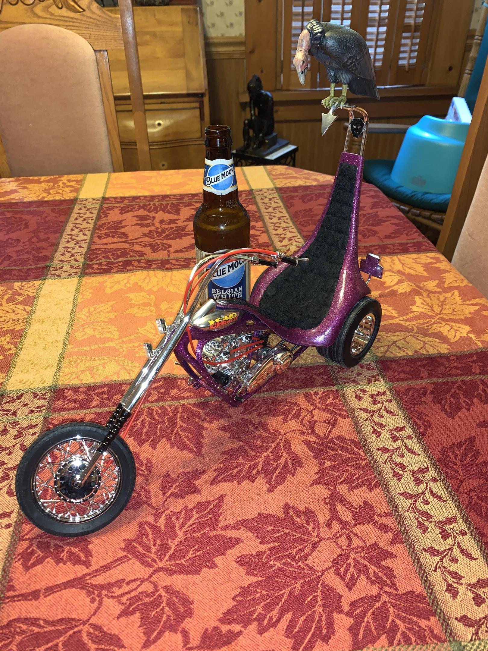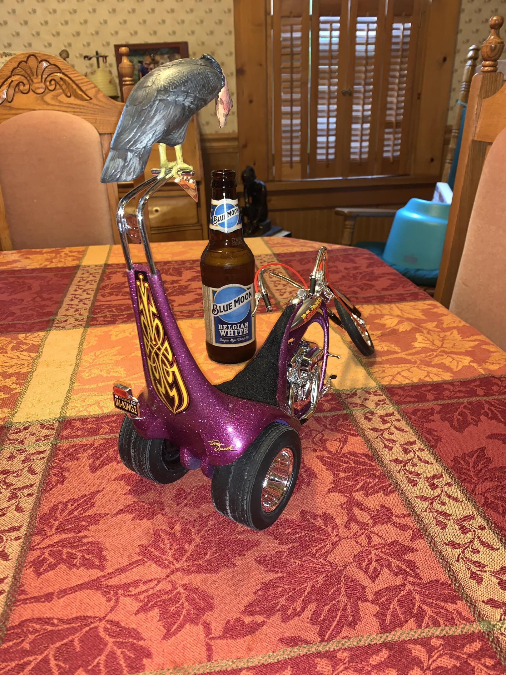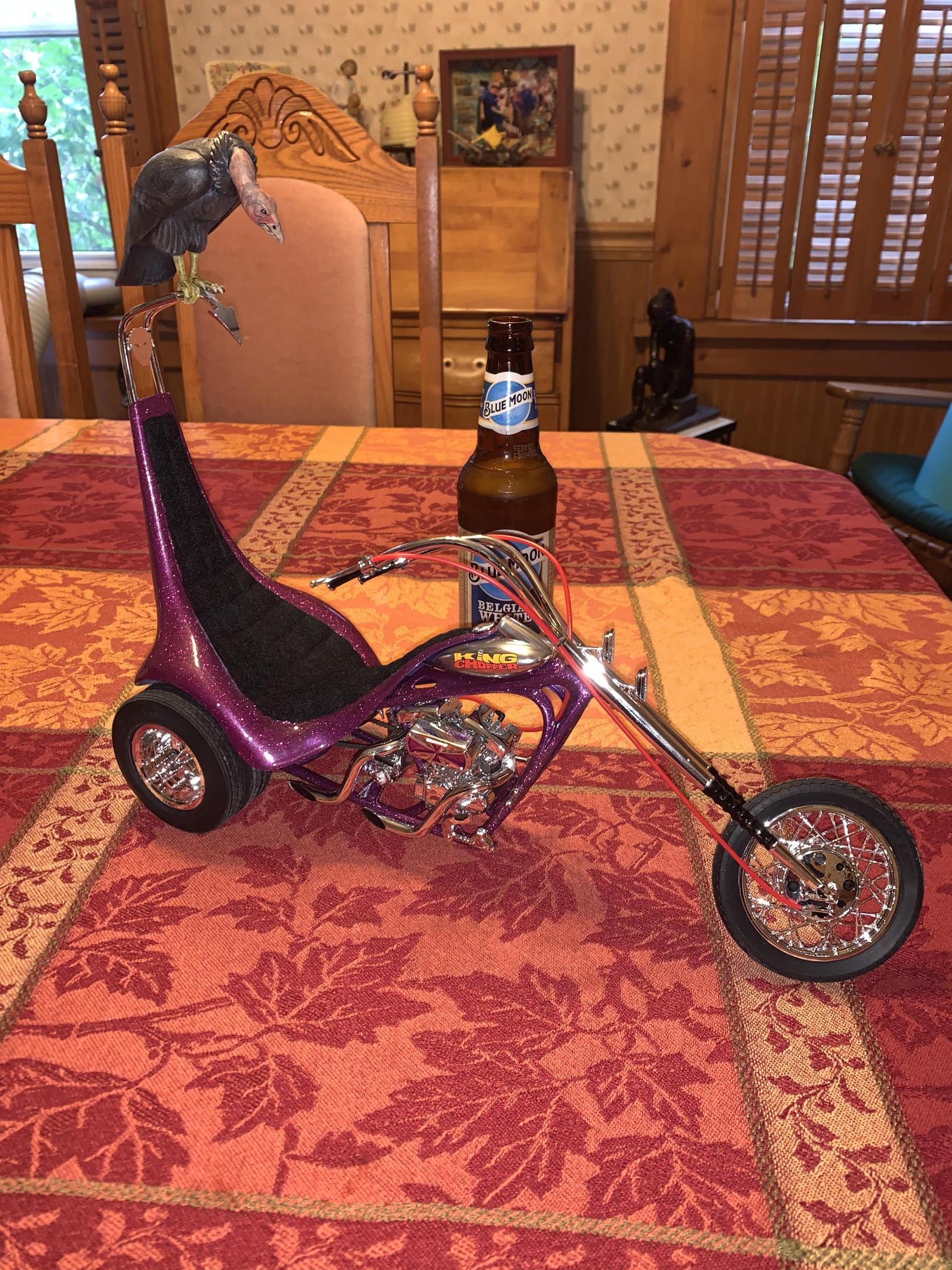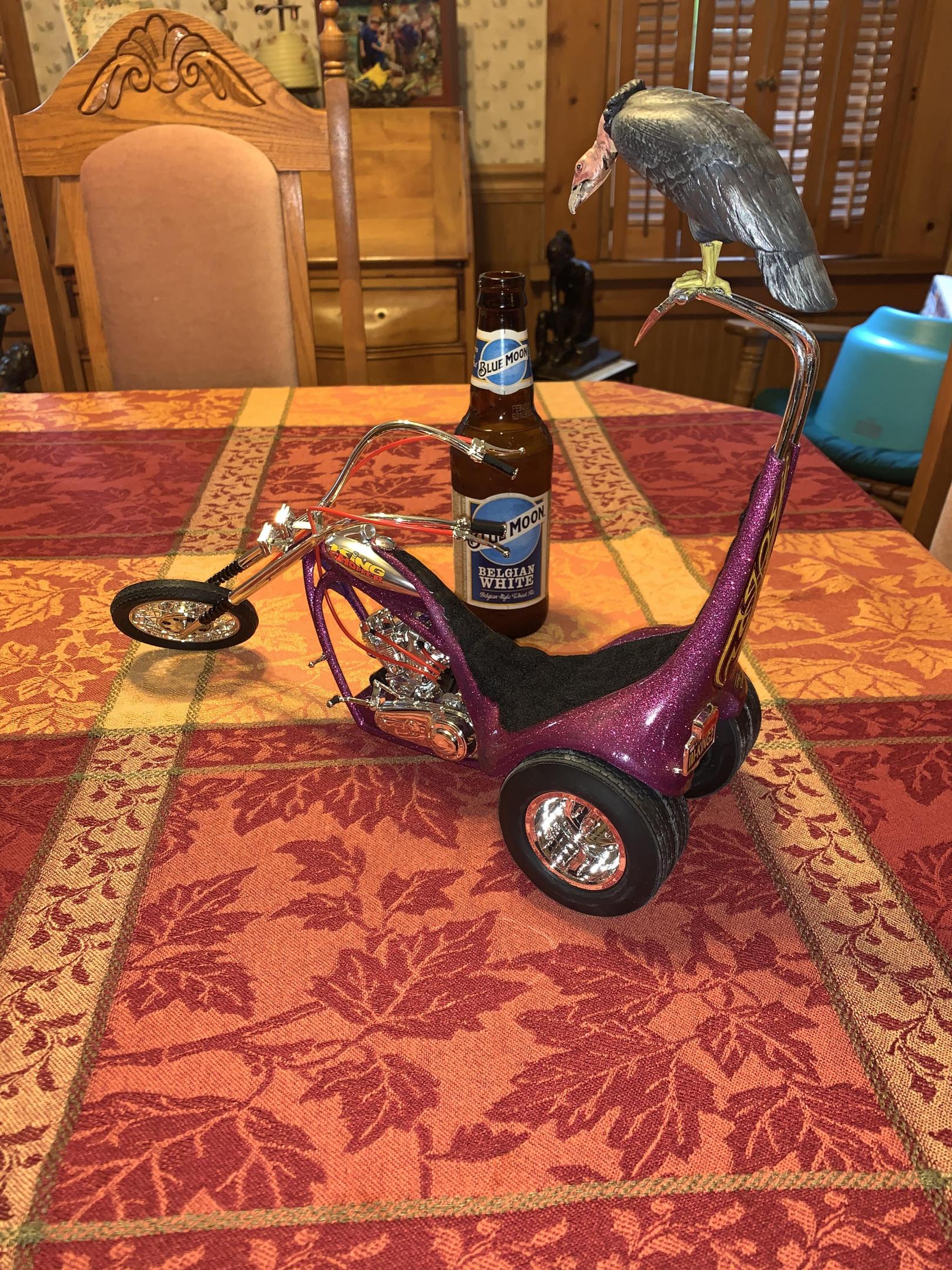 This kit really tested my patience. It’s a flash bomb but it turns out nice once you get past that. I painted it with krylon flake and then fogged some edges with purple. Then it was coated with Boyd’s dusty rose and then cleared. Still needs a coat of future. The tank was stripped & airbrushed with molitow. I wanted total 60’s so I did the seat with Kens funny fur. It’s really big once built but it’s pretty kool to se these kits again
