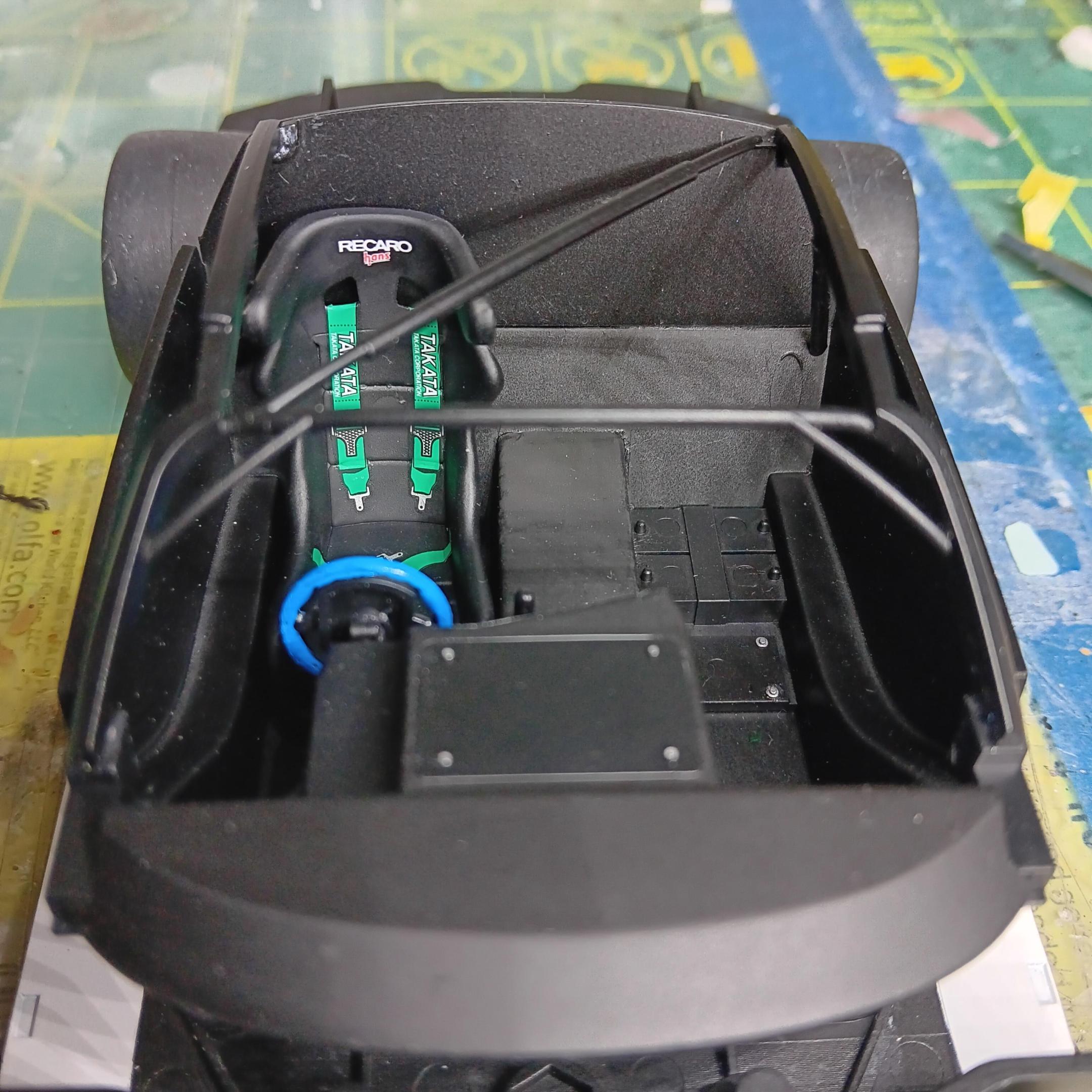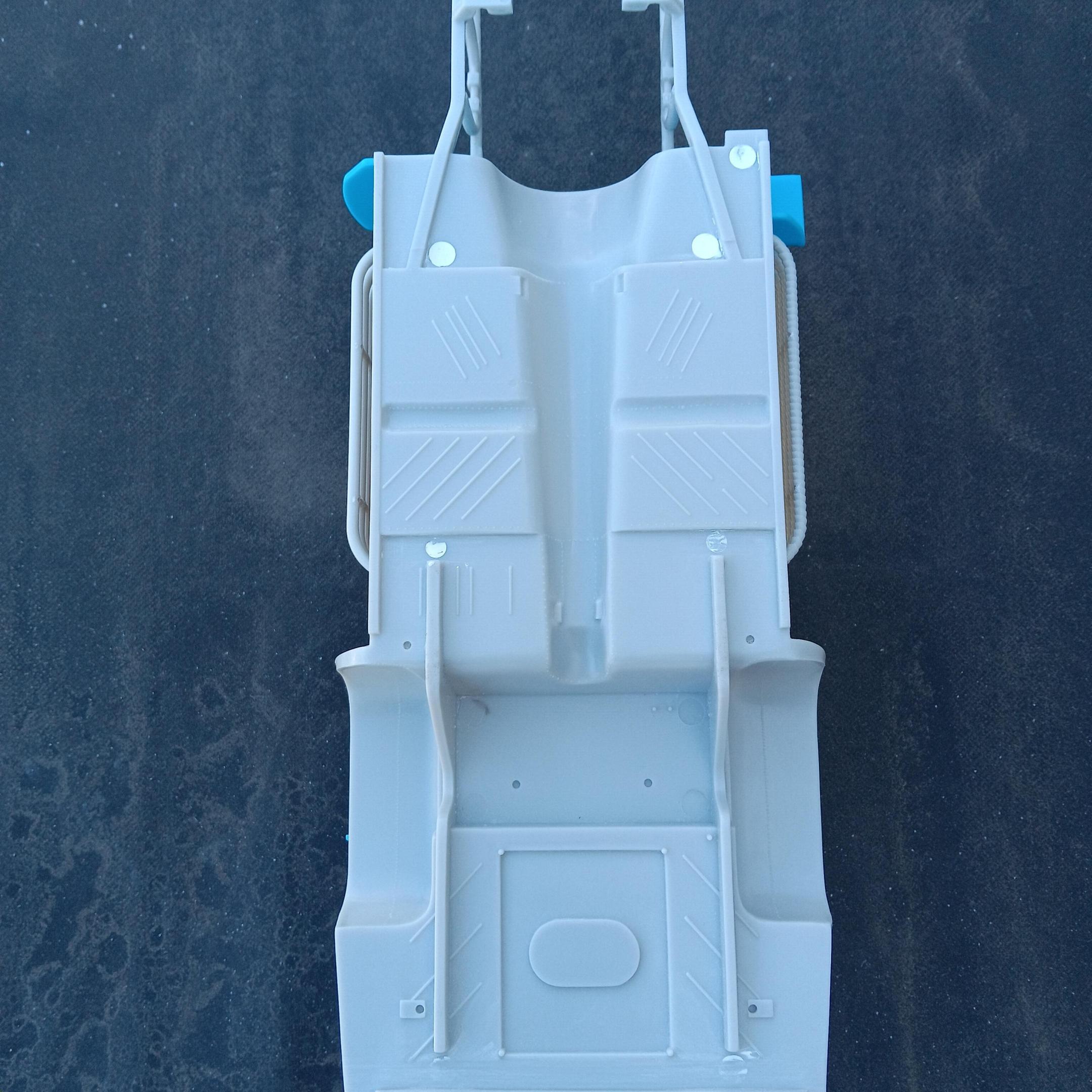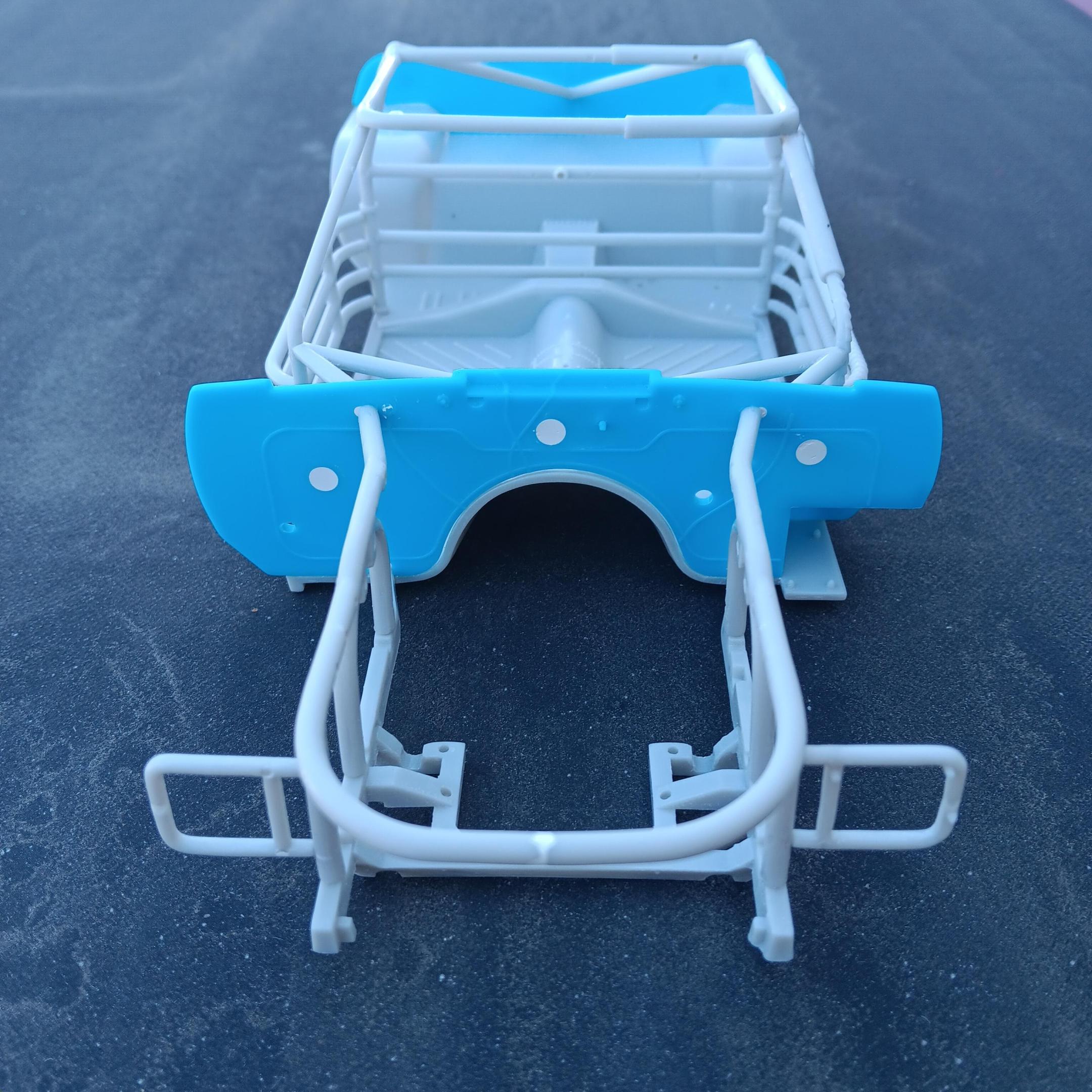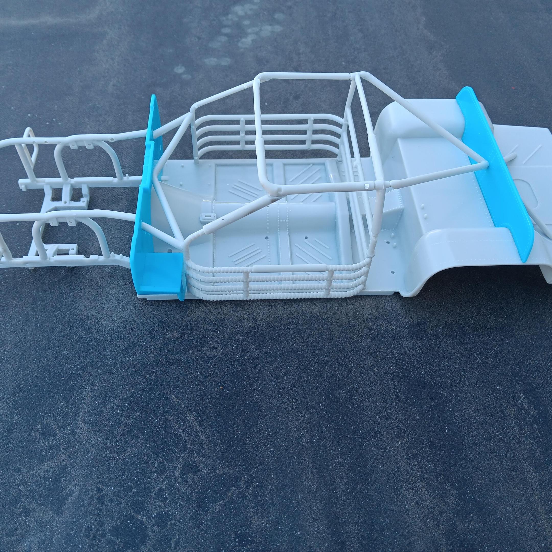 Got the body all cleaned up, primed, and painted with Tamiya Pure White. Started working on the floor pan and roll cage to get all the parts installed that are going to be painted the same. Once again, a lot of clean up to get rid of flash and sink marks. -