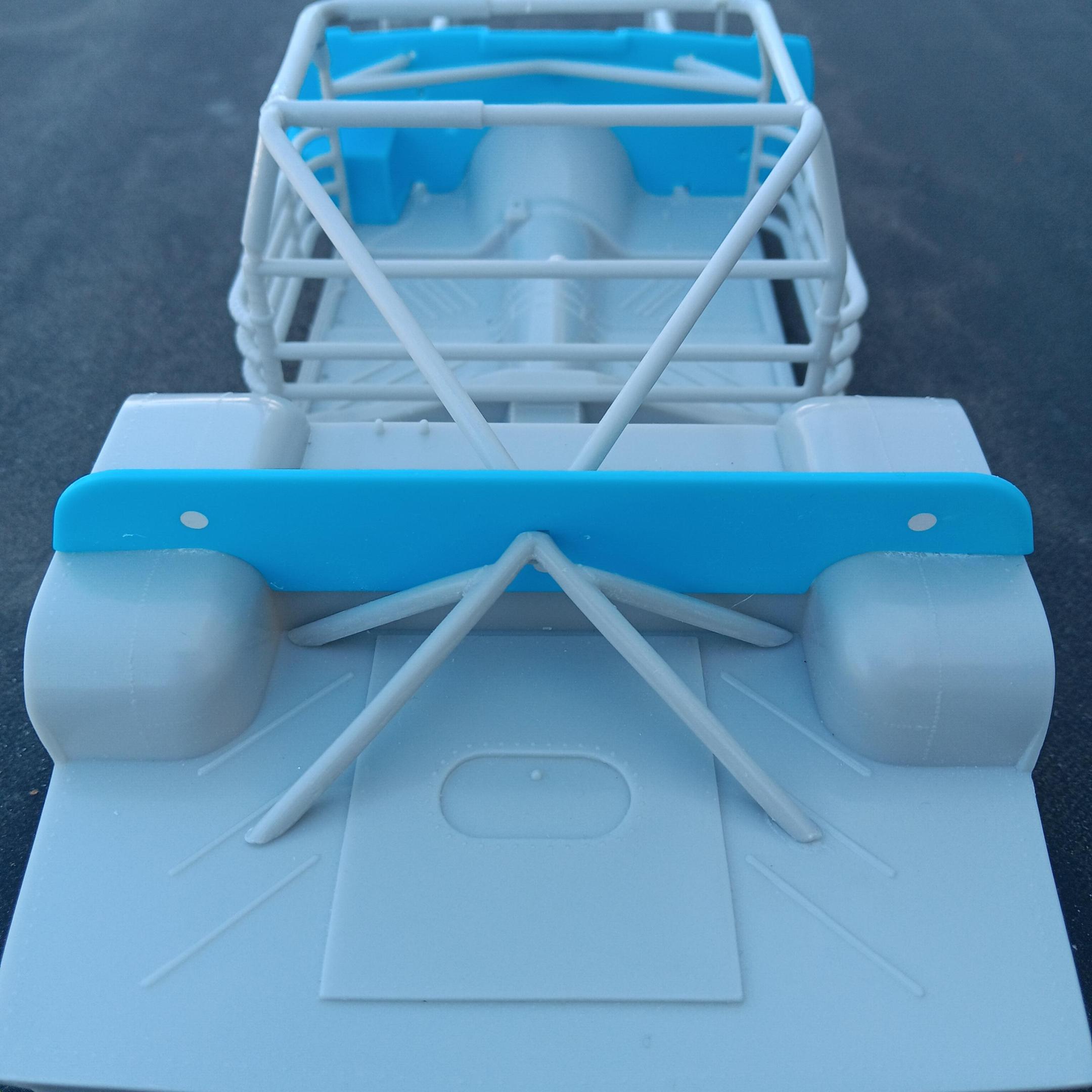 I'm starting on the 1/16th scale Pabst Blue Ribbon Charger using the Revell Hawaiian kit. Got most of the frame put together and primed along with adding extra bracing for the rear axle. Also added a bolt for the rear axle gear oil inspection plug. Not totally happy with the way the extra bracing came out, it was a pain in the butt!