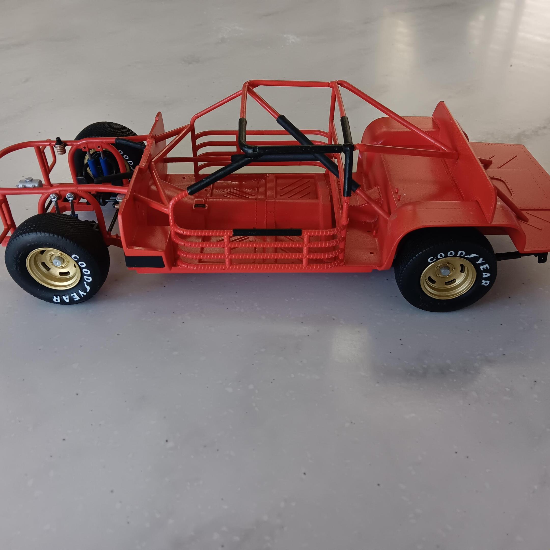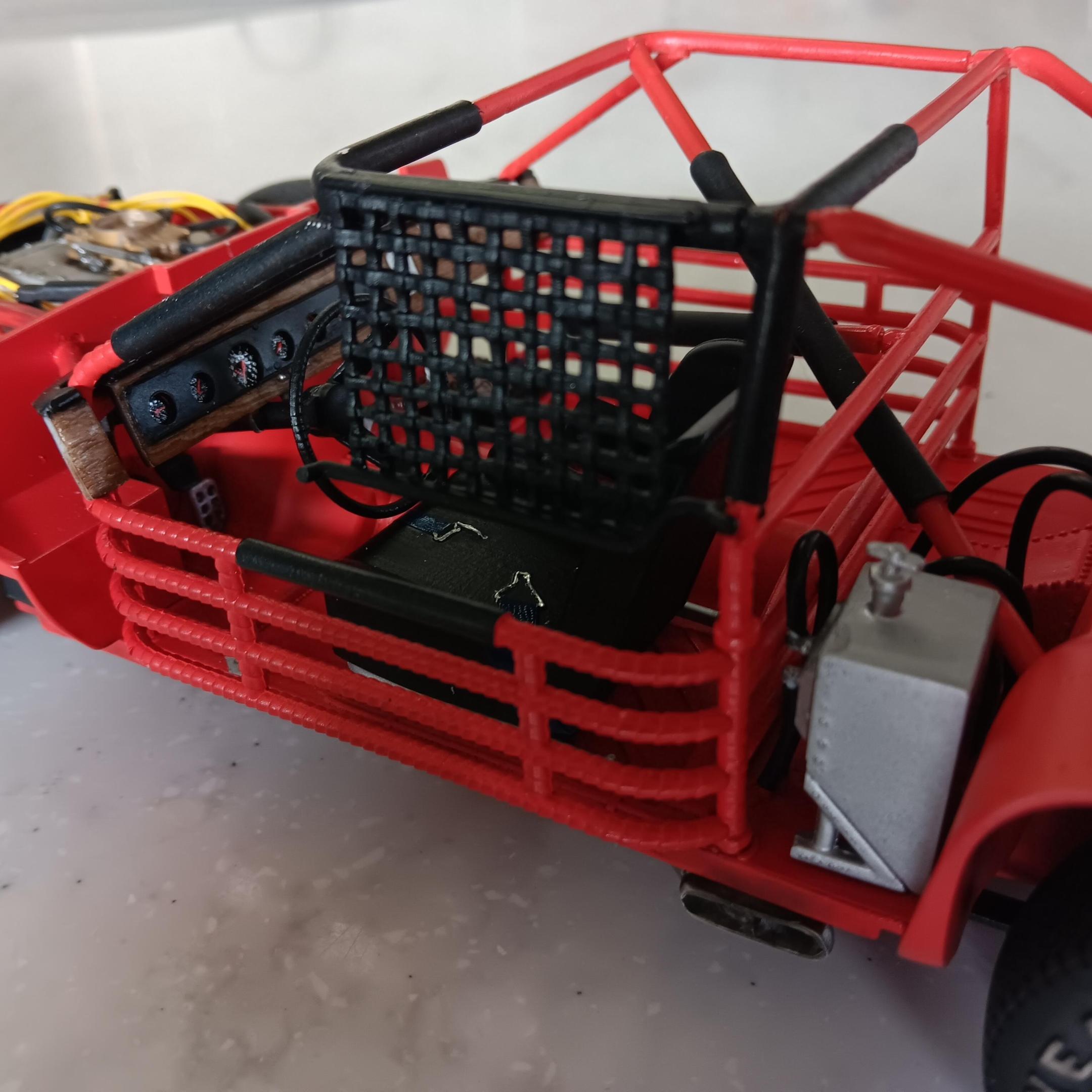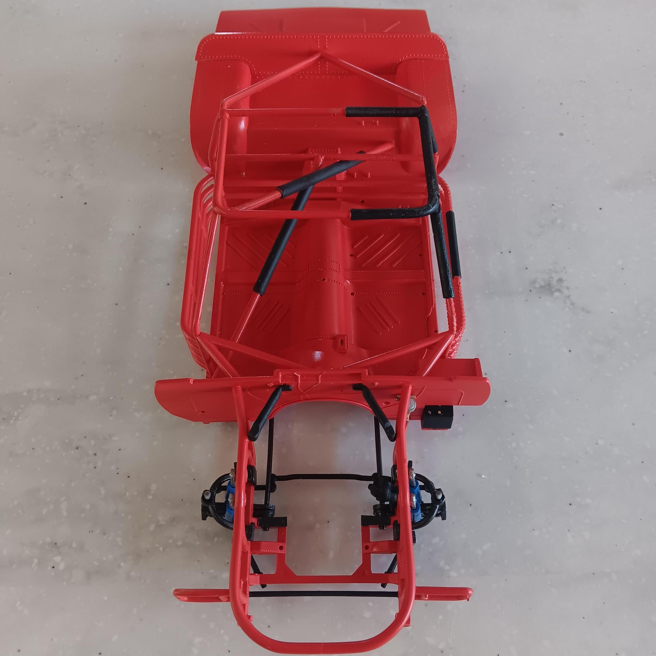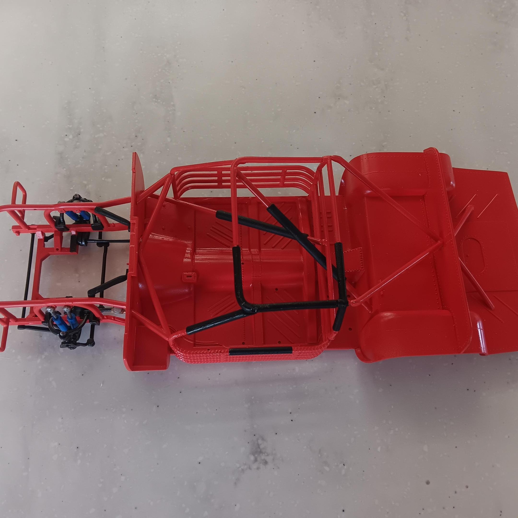 Painted the chassis, floor pan, and the roll cage a mixture of red and orange. I was not able to find any pictures on the web of the actual interior but I have been told it was a shade of red. Obviously this isn't going to be a replica so I've taken liberties on the colors. Some of the padding on the roll cage is shrink tubing and others are just painted black. Once I get farther along I will add some weathering and staining to the chassis. -