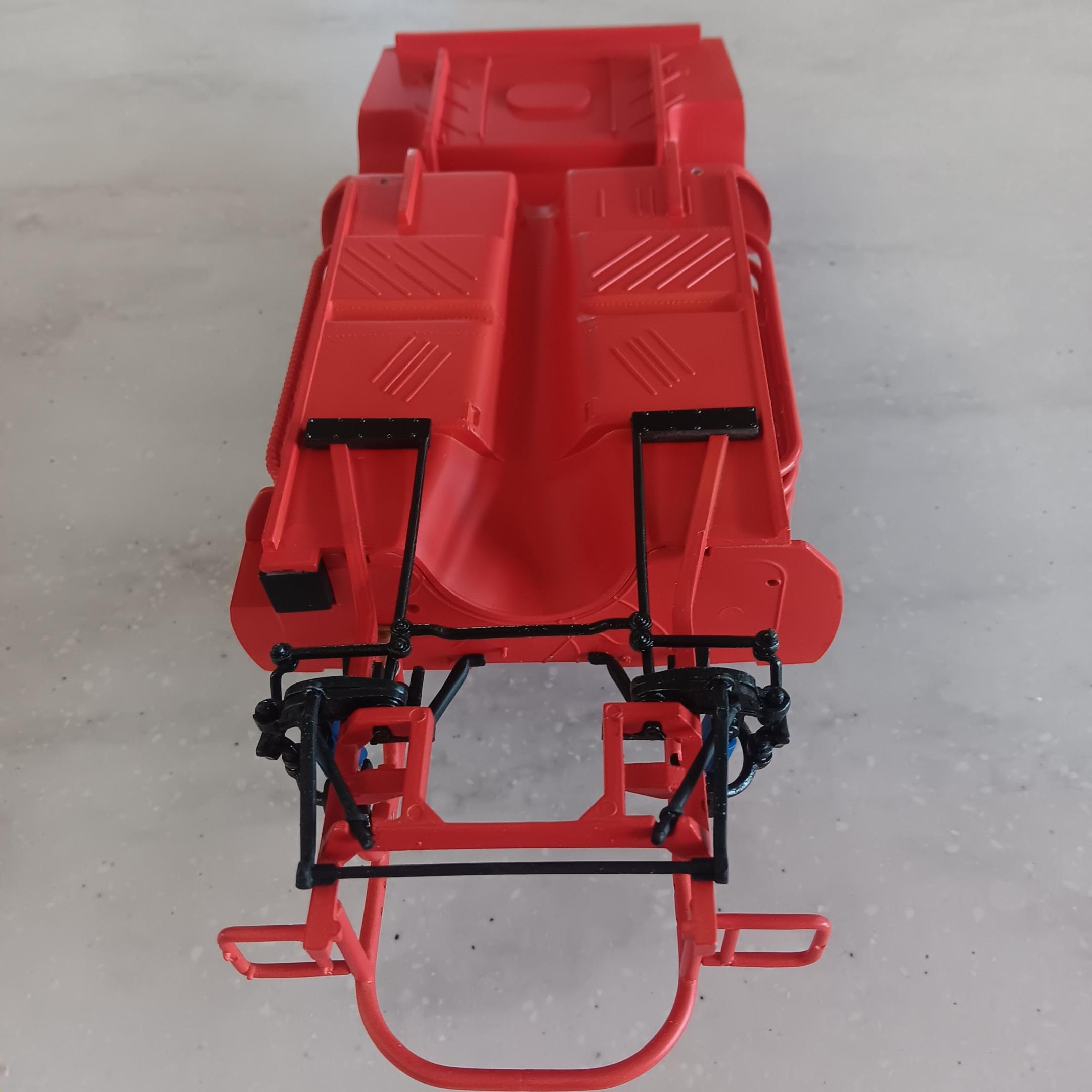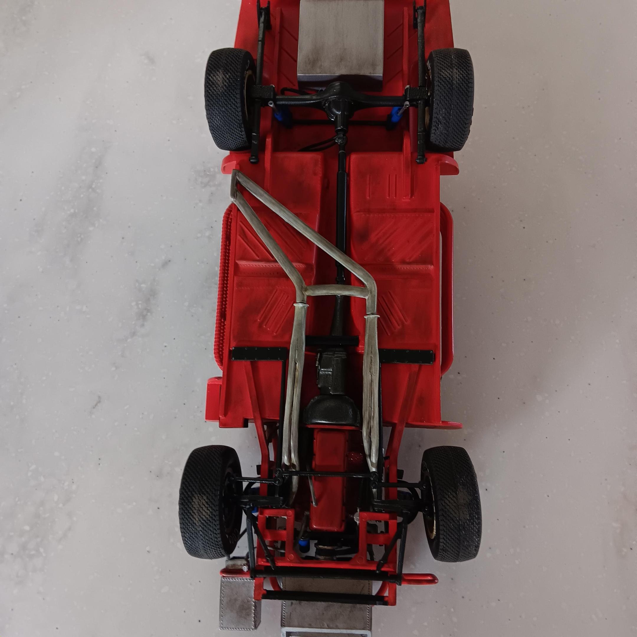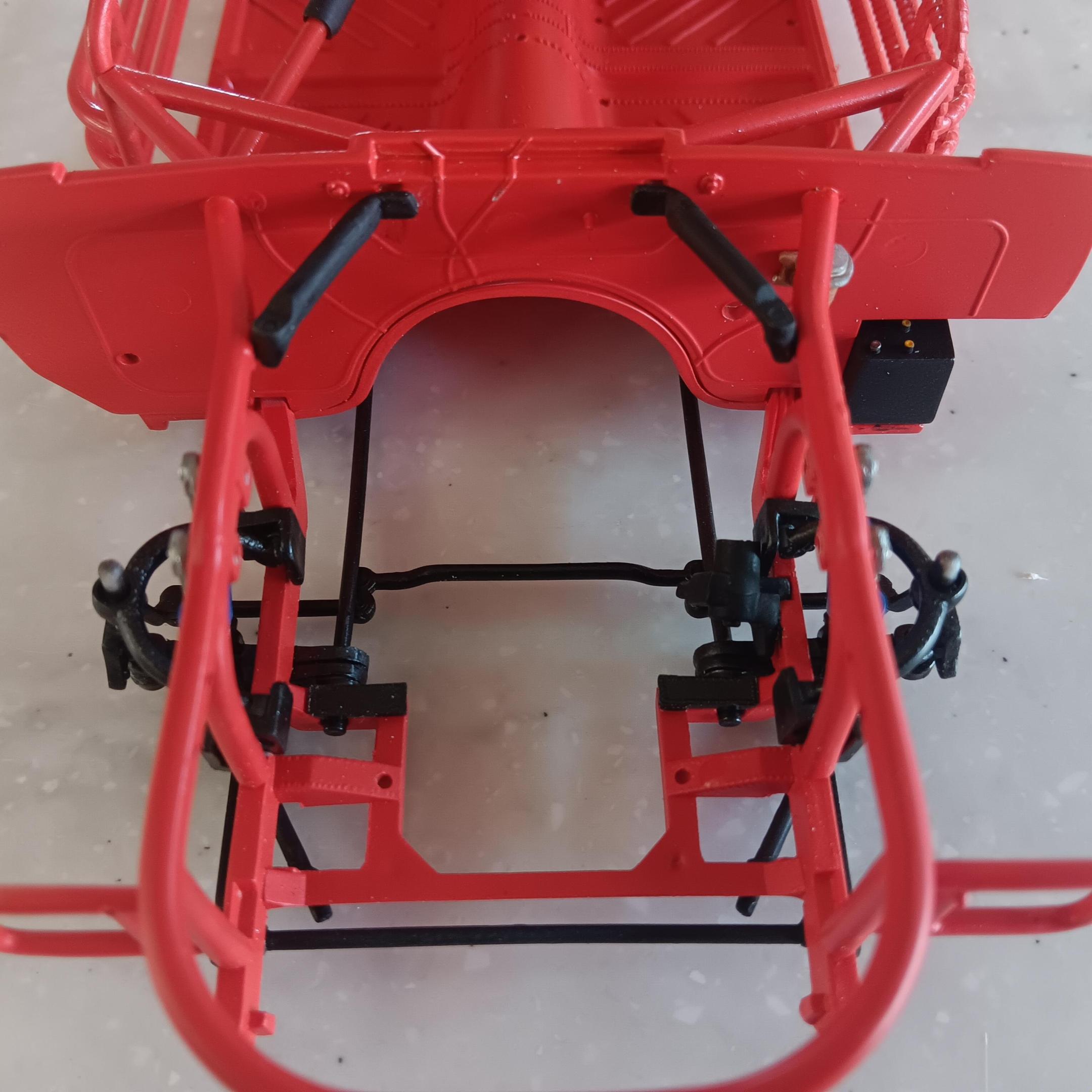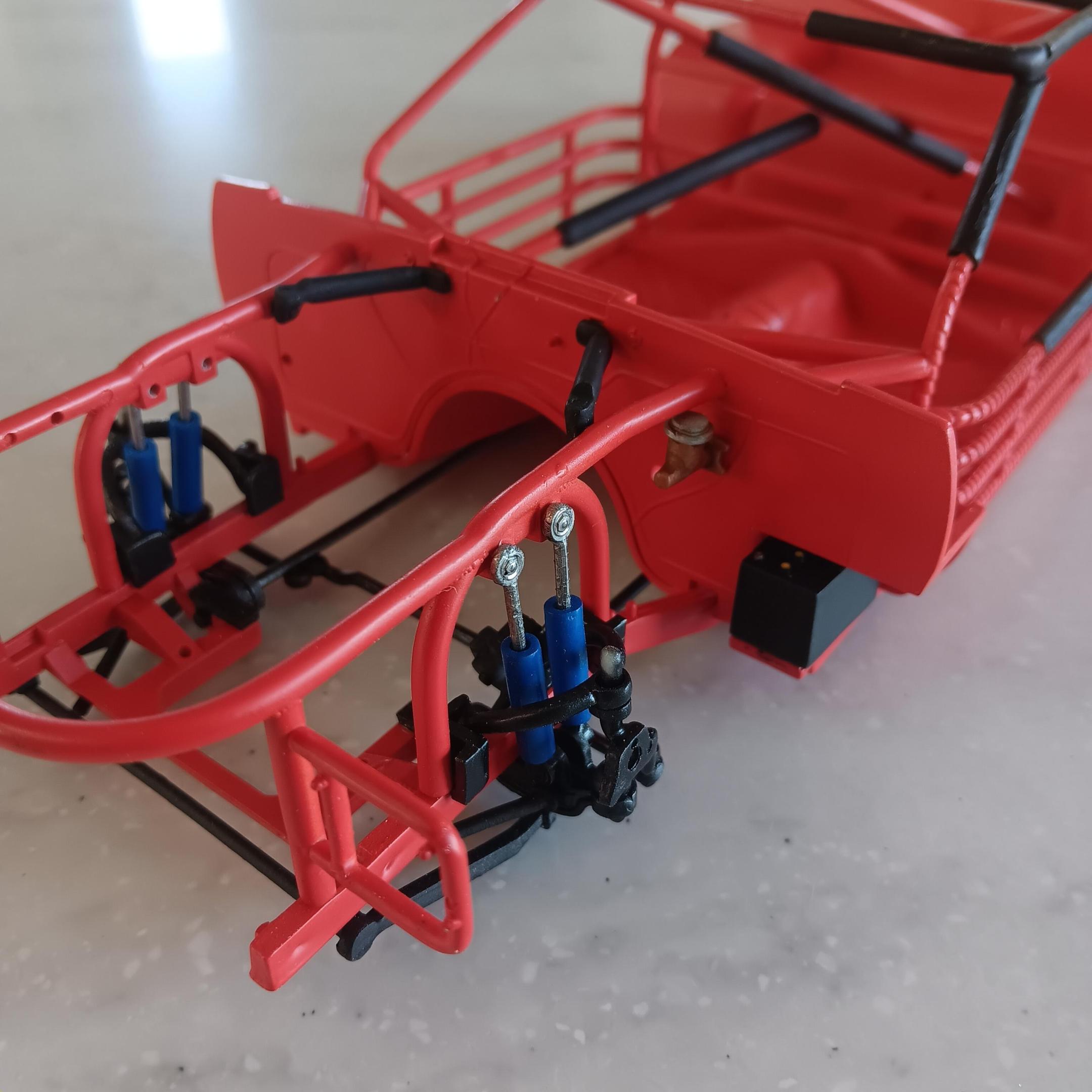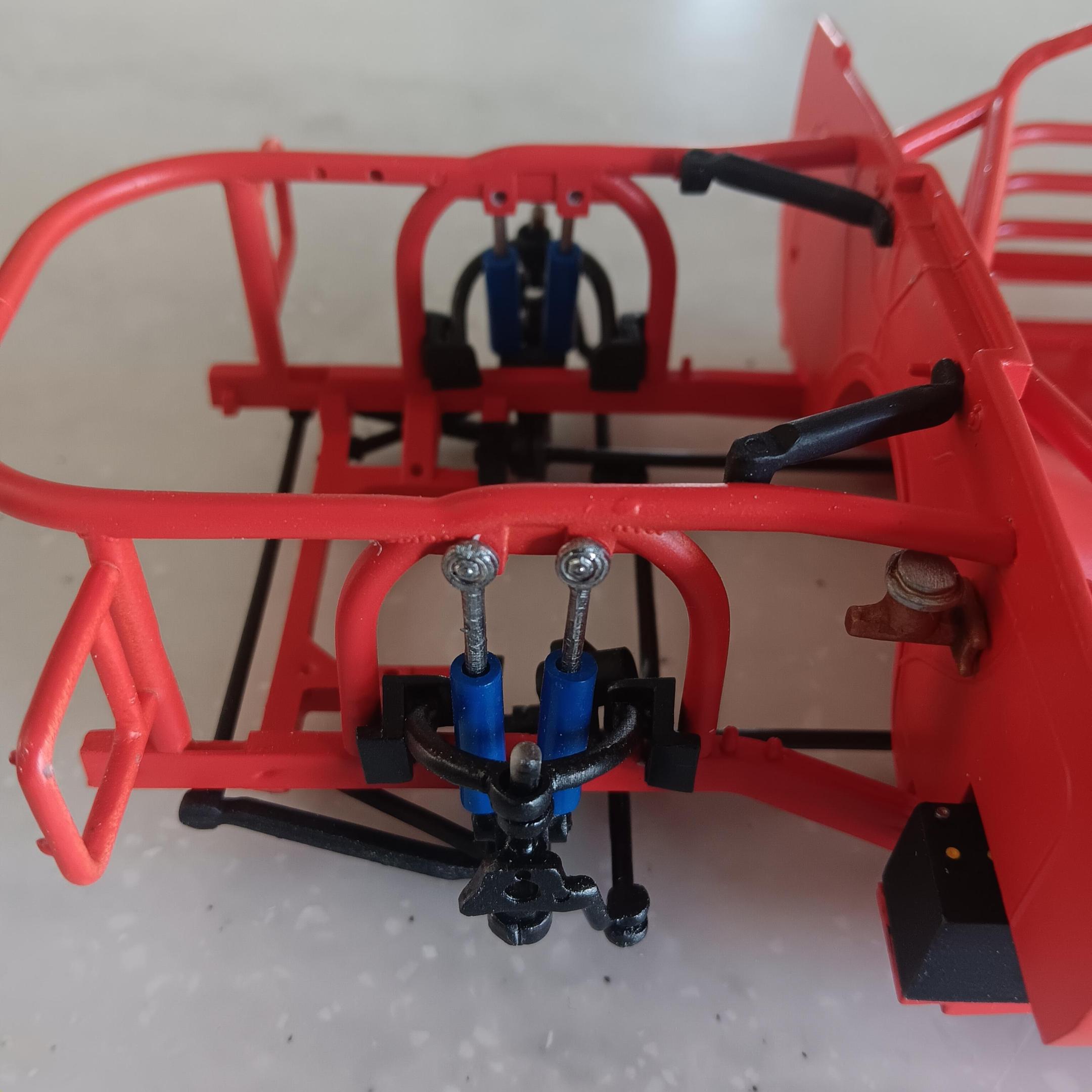Painted the chassis, floor pan, and the roll cage a mixture of red and orange. I was not able to find any pictures on the web of the actual interior but I have been told it was a shade of red. Obviously this isn't going to be a replica so I've taken liberties on the colors. Some of the padding on the roll cage is shrink tubing and others are just painted black. Once I get farther along I will add some weathering and staining to the chassis. -