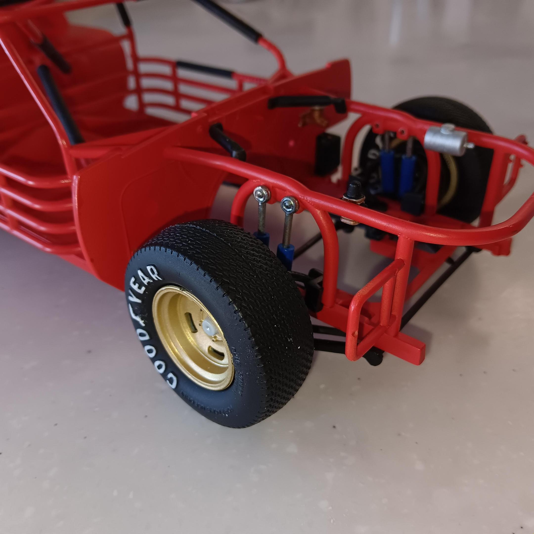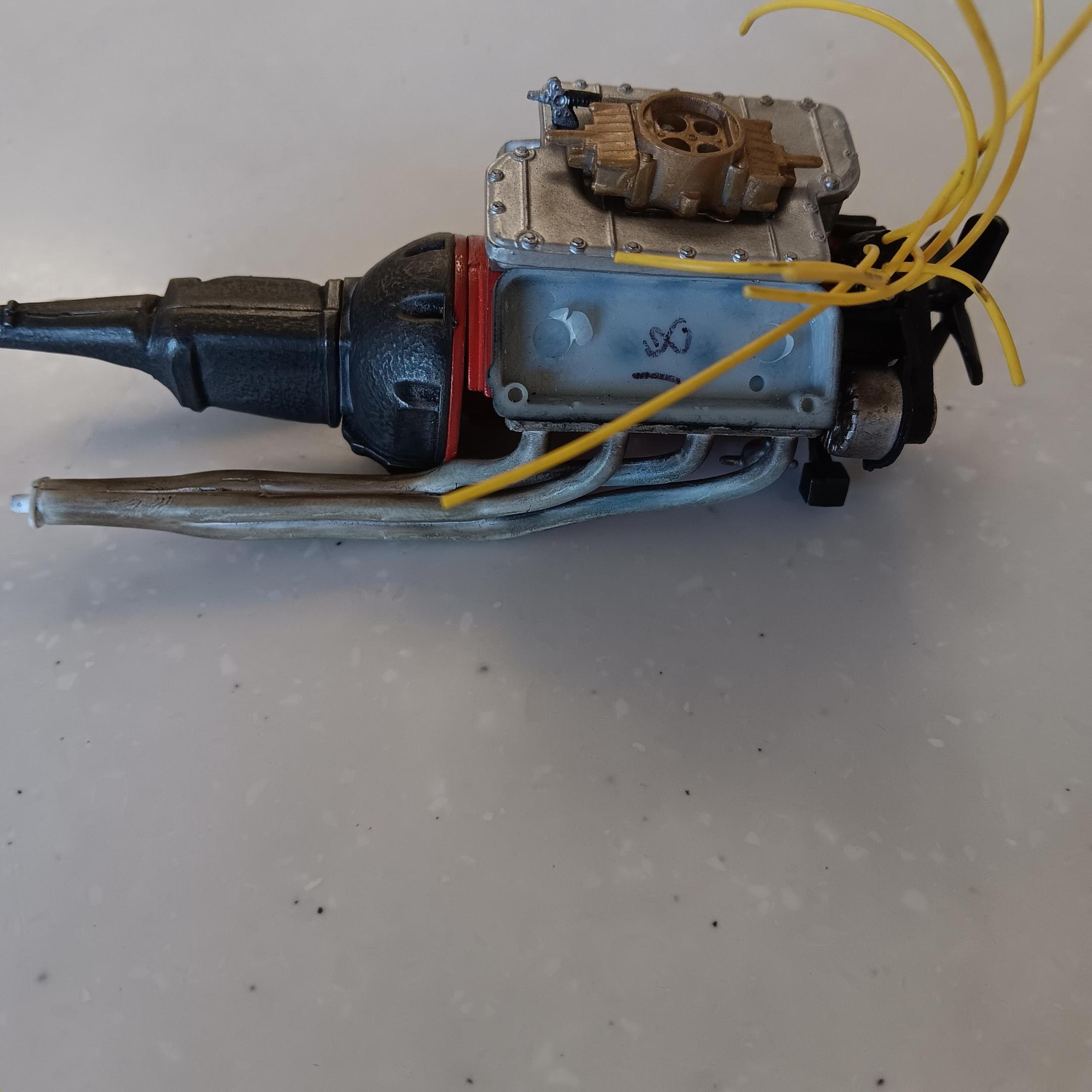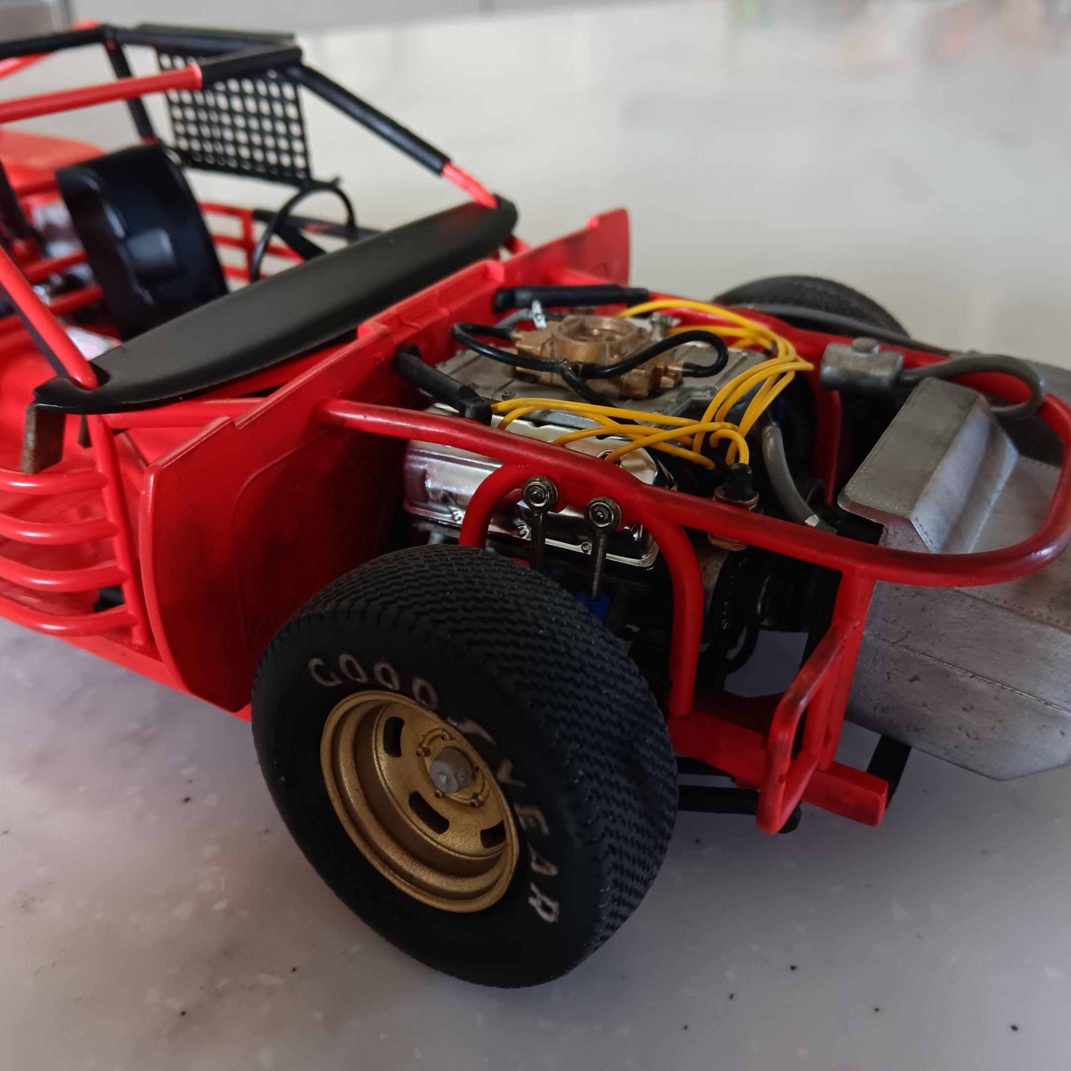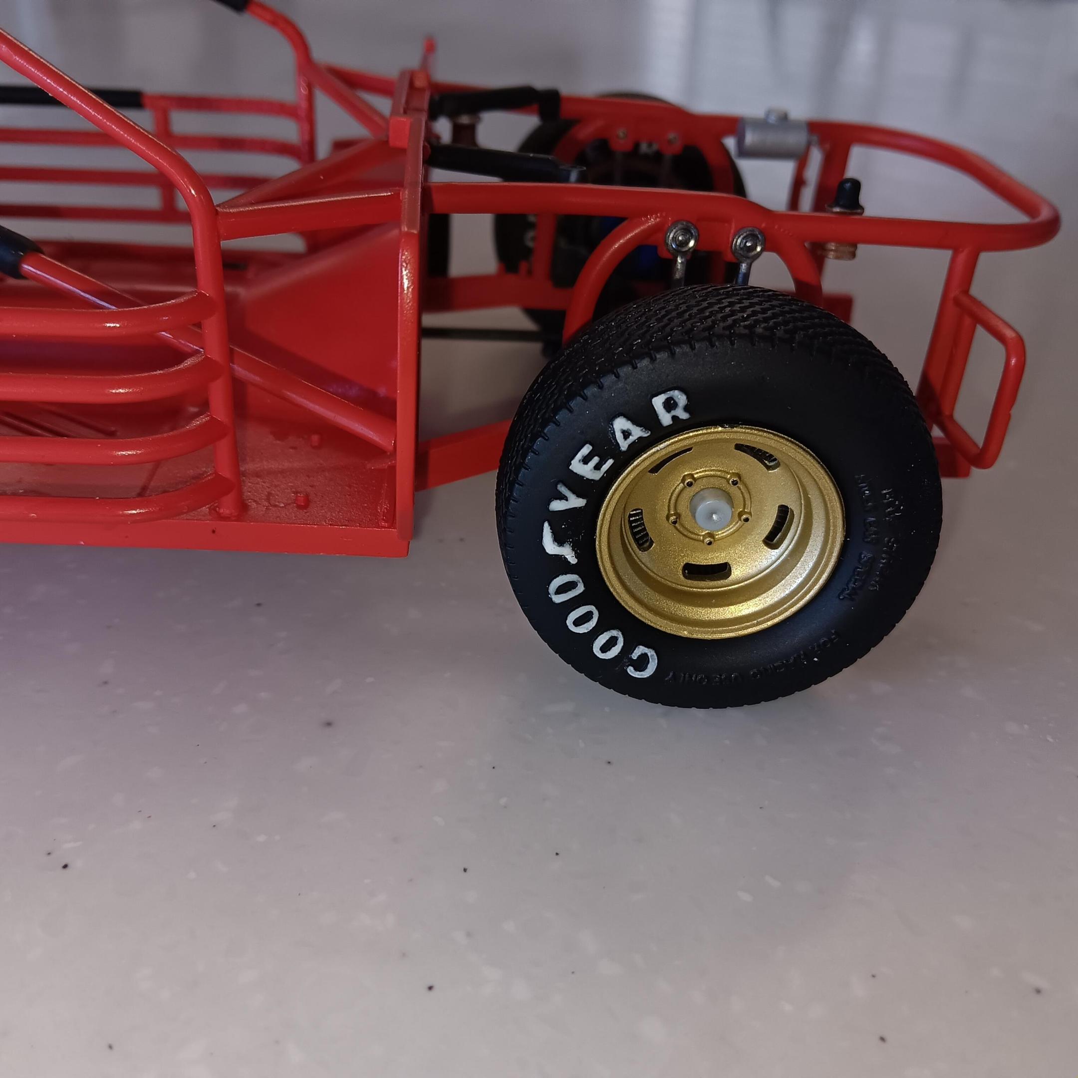 Lettered the tires using Tamiya acrylic white, they will be toned down and weathered along with the chassis. The wheels are painted using Model Master spray can gold. Started on the engine and have been weathering it as I go along. Engine block is painted same color as the interior and heads are Tamiya aluminum. For box stock the engine has some decent detail. Will be working on the interior and weathering the chassis next. -