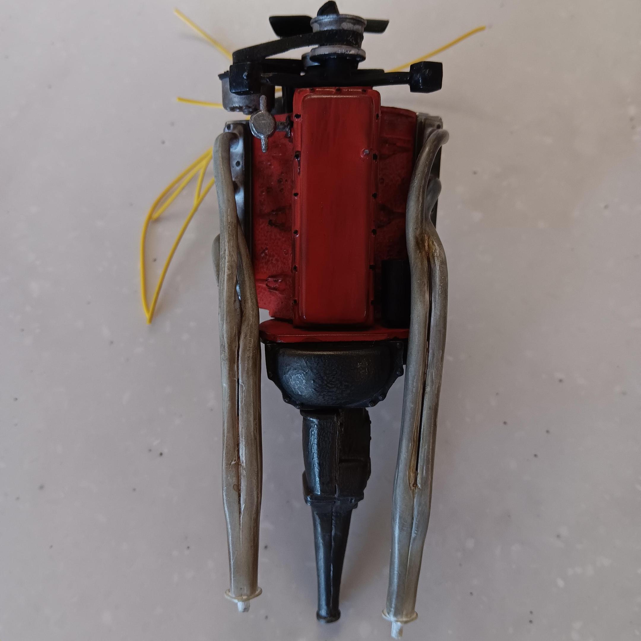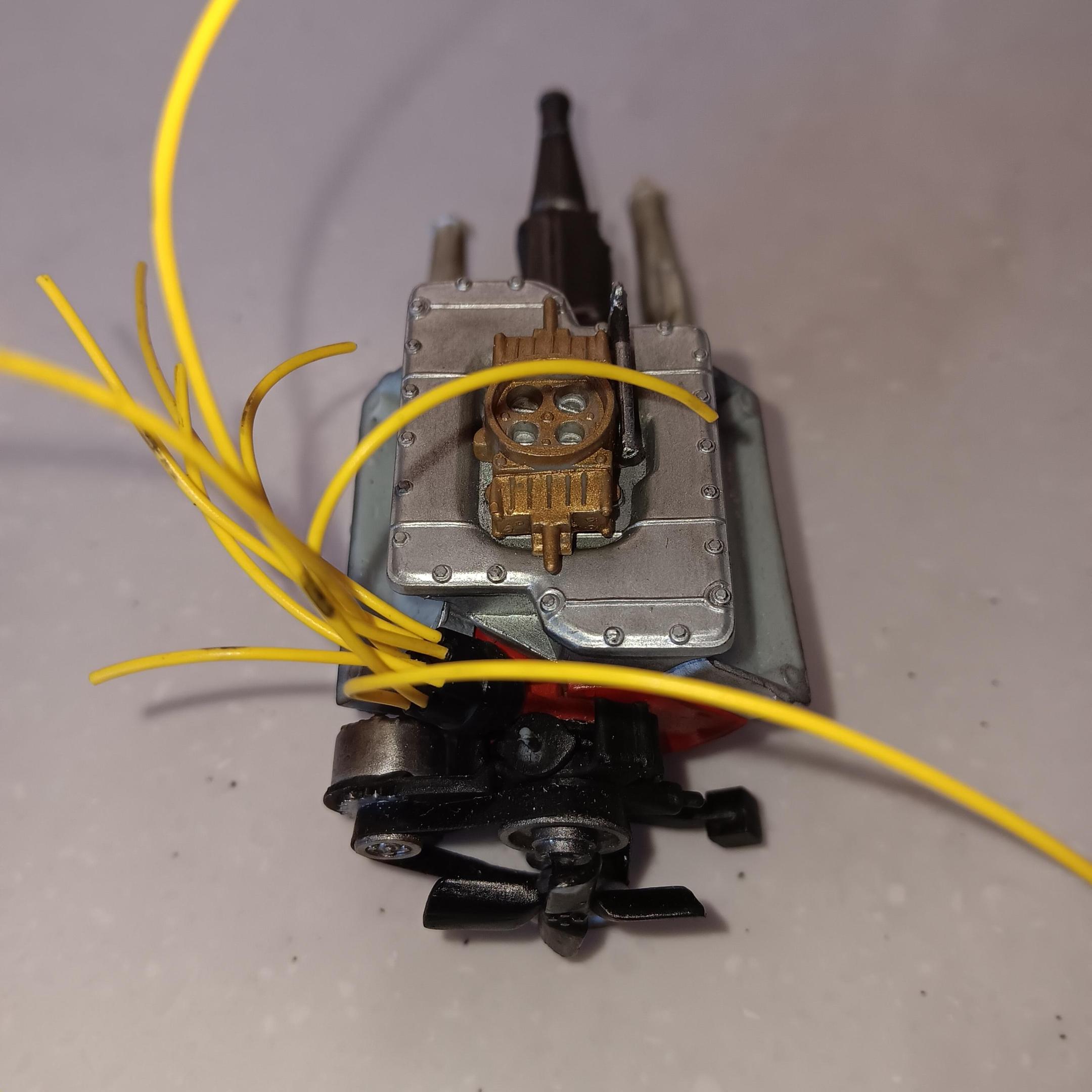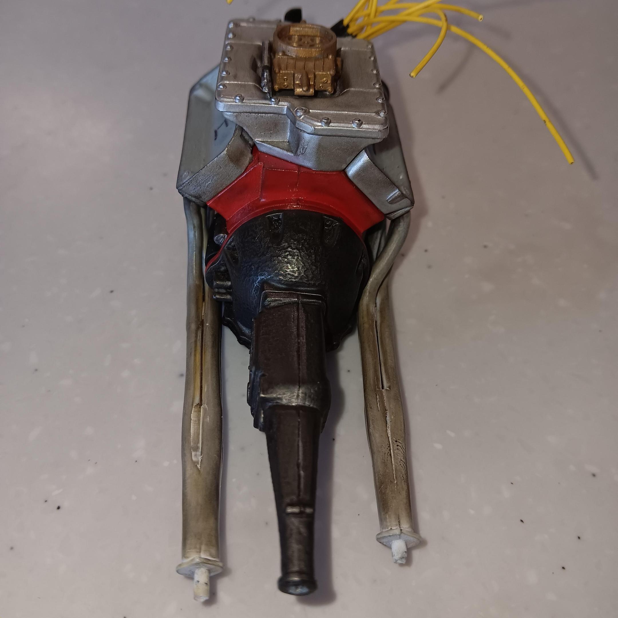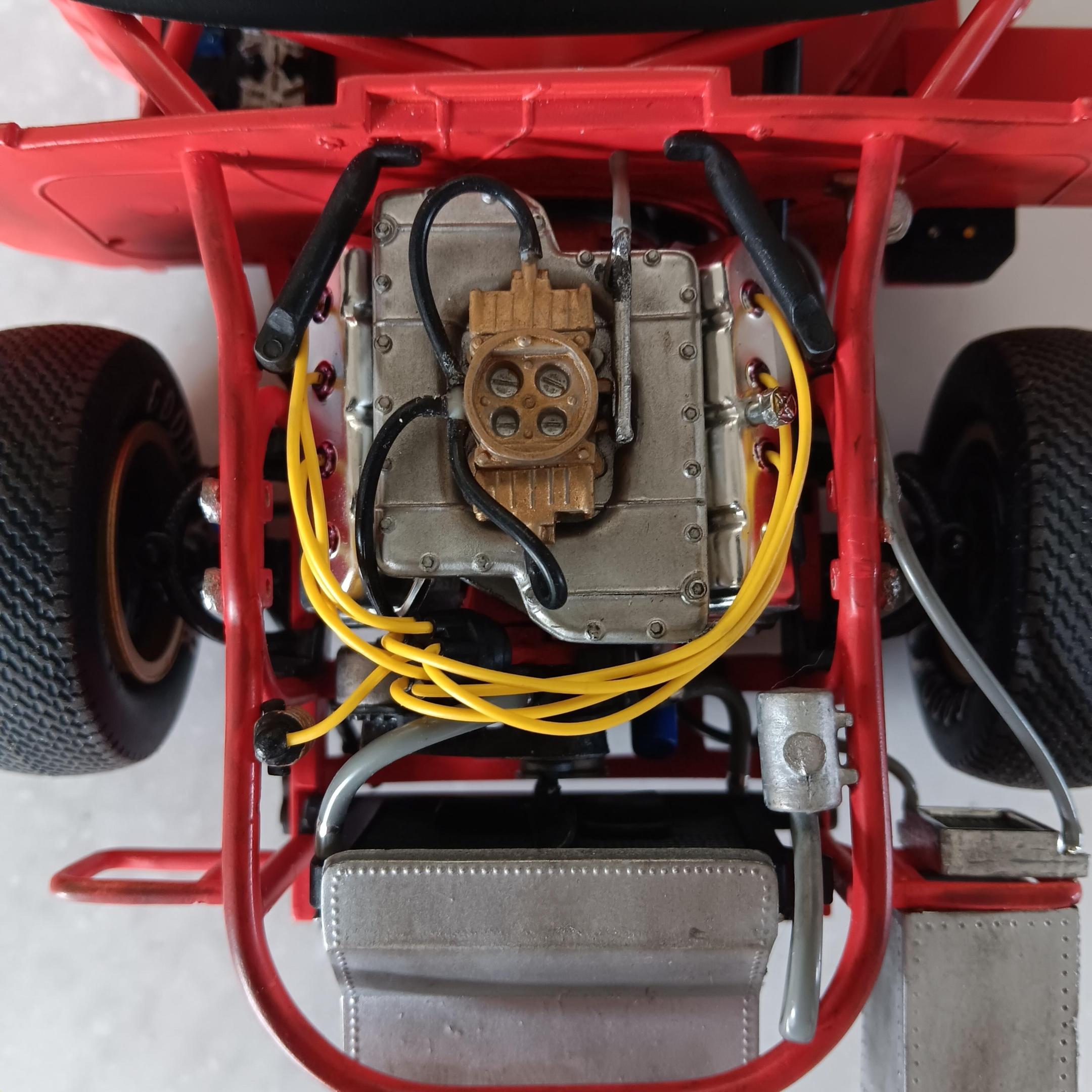 Lettered the tires using Tamiya acrylic white, they will be toned down and weathered along with the chassis. The wheels are painted using Model Master spray can gold. Started on the engine and have been weathering it as I go along. Engine block is painted same color as the interior and heads are Tamiya aluminum. For box stock the engine has some decent detail. Will be working on the interior and weathering the chassis next. -