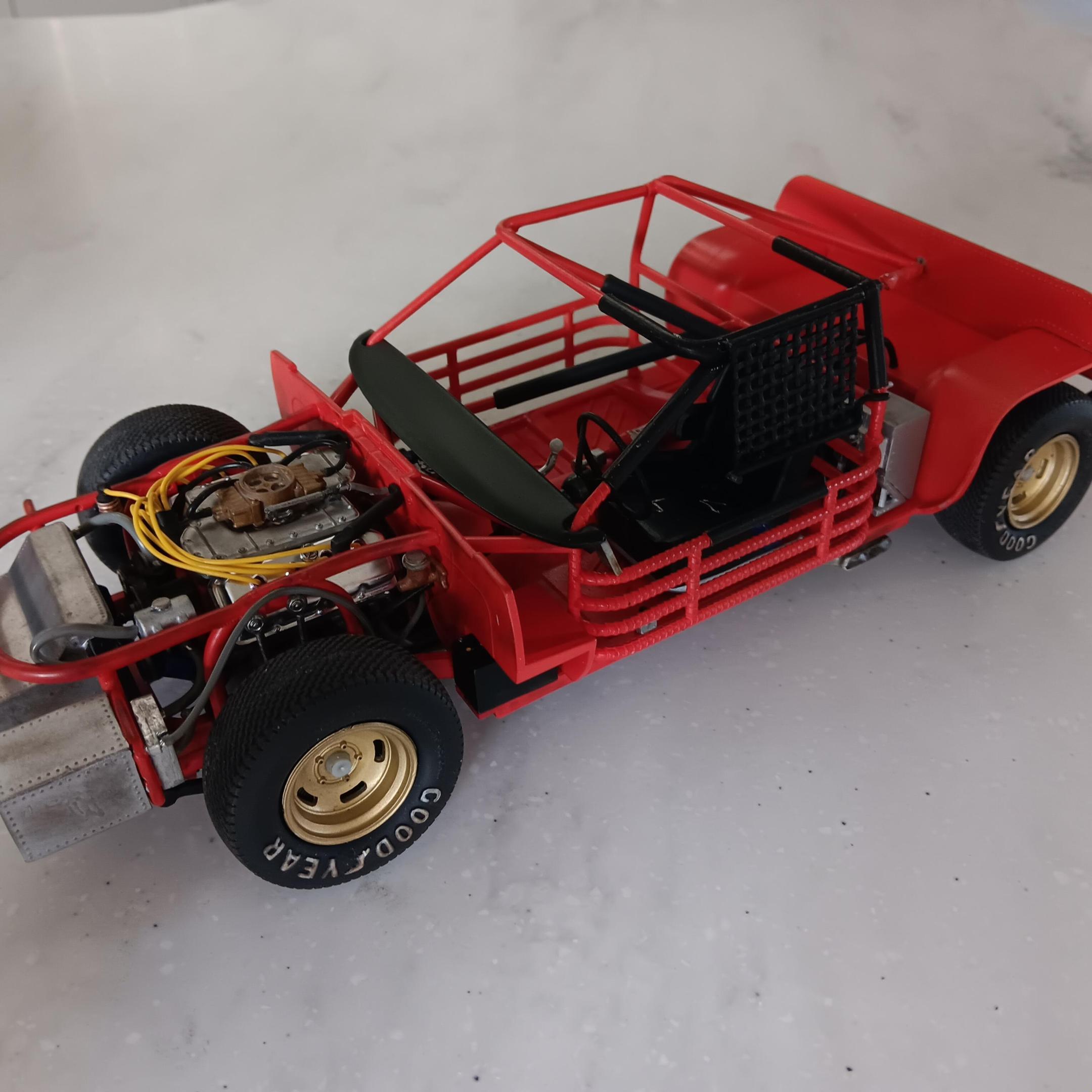 Installed the engine, wiring, and hoses that were supplied with the kit. Once it all went together I think it looks pretty good for what was included. Finished up installing the rest of the interior along with the window net. I'm not real happy with the way the front end sits now that it's all together, not sure what I did wrong, but the wheels don't want to line up real well. Used various Tamiya weathering master colors to weather the engine, chassis, and tires. Now it's on to finishing up the body and putting it all together. -