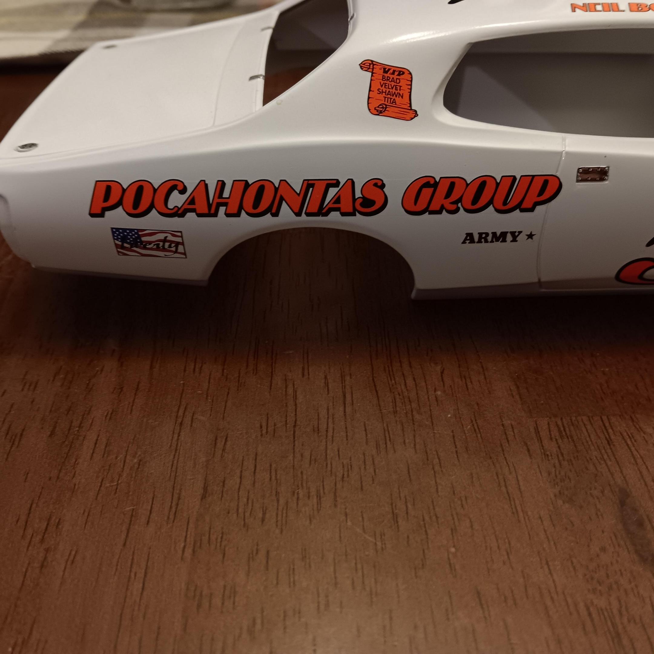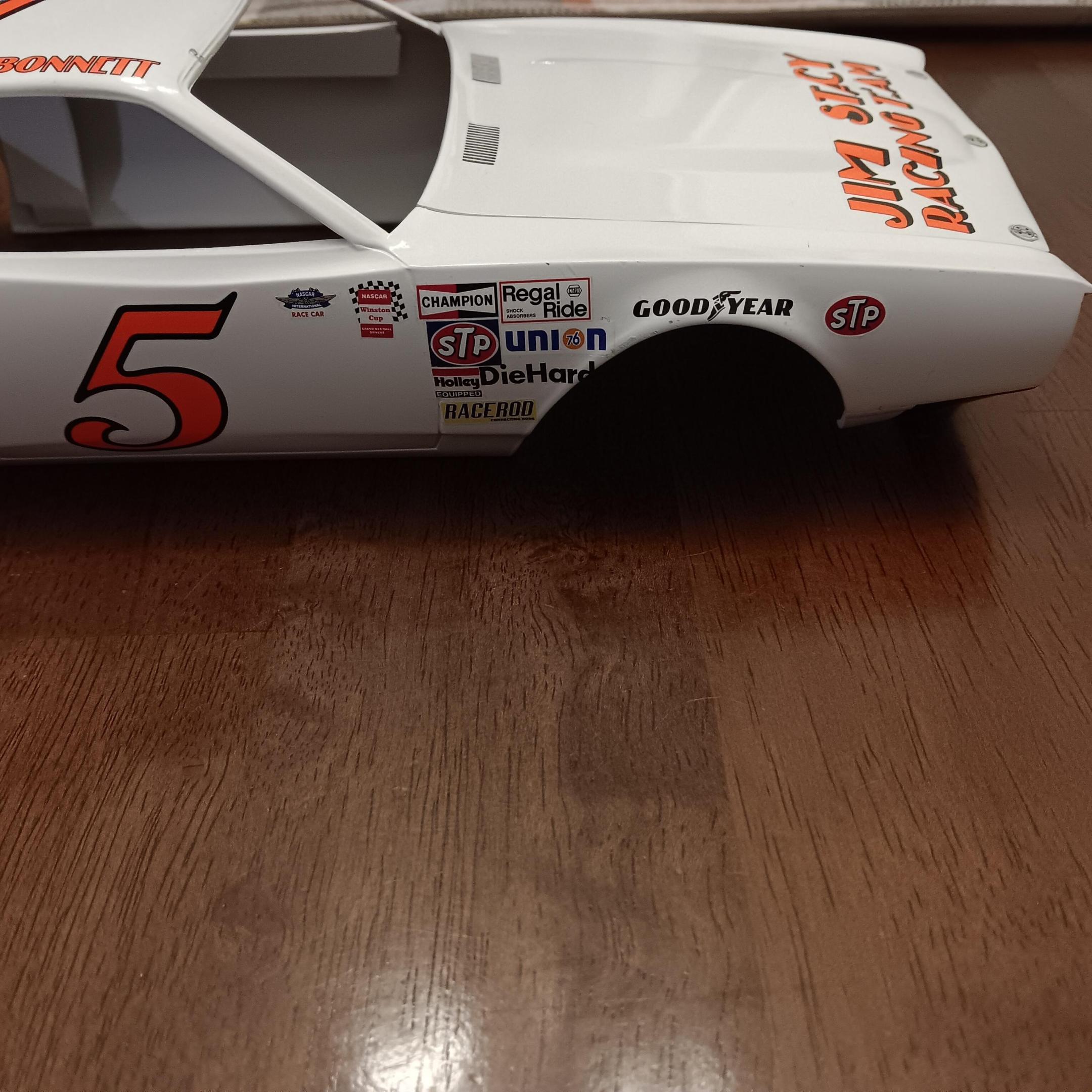 I used Power Slide decals on the body to match the layout for the 1977 Firecracker 400. The decals went down great, I had absolutely no issue with them. I did manage to mess up the layout of the front fender decal set. All the decals had to be cut out individually and hopefully laid out correctly. The Holley and STP decal were supposed to line up with the door side of the Champion decal above them. I obviously didn't do that which didn't leave quite enough room for the DieHard decal to fit without a portion of one letter hanging over into the wheel well. The chrome on the bumpers is too shiny to my liking so once I get the window trim painted or bare metal foiled I'm going to spray the whole body with Tamiya semi- gloss clear to get rid of some of the shine. -
