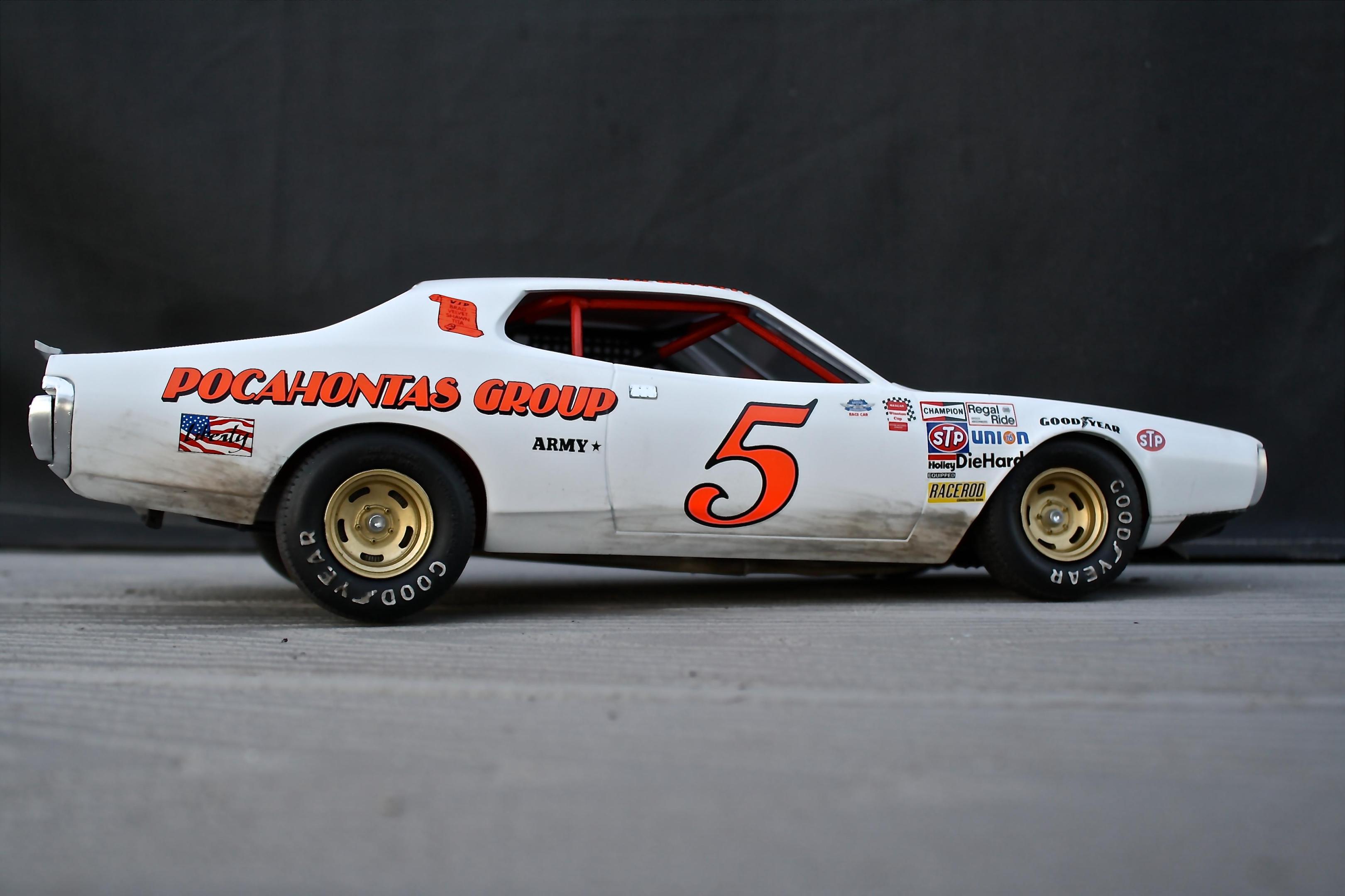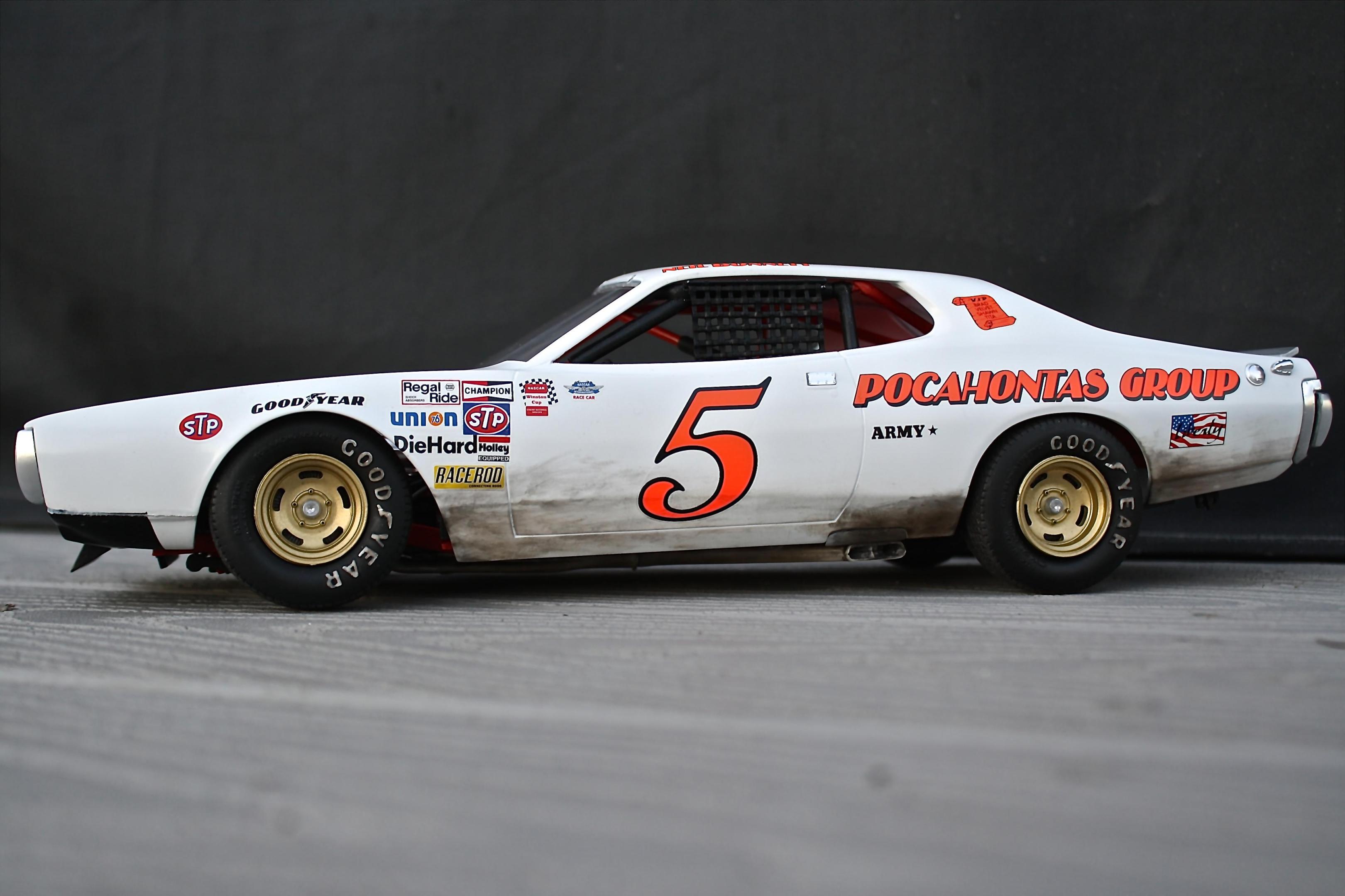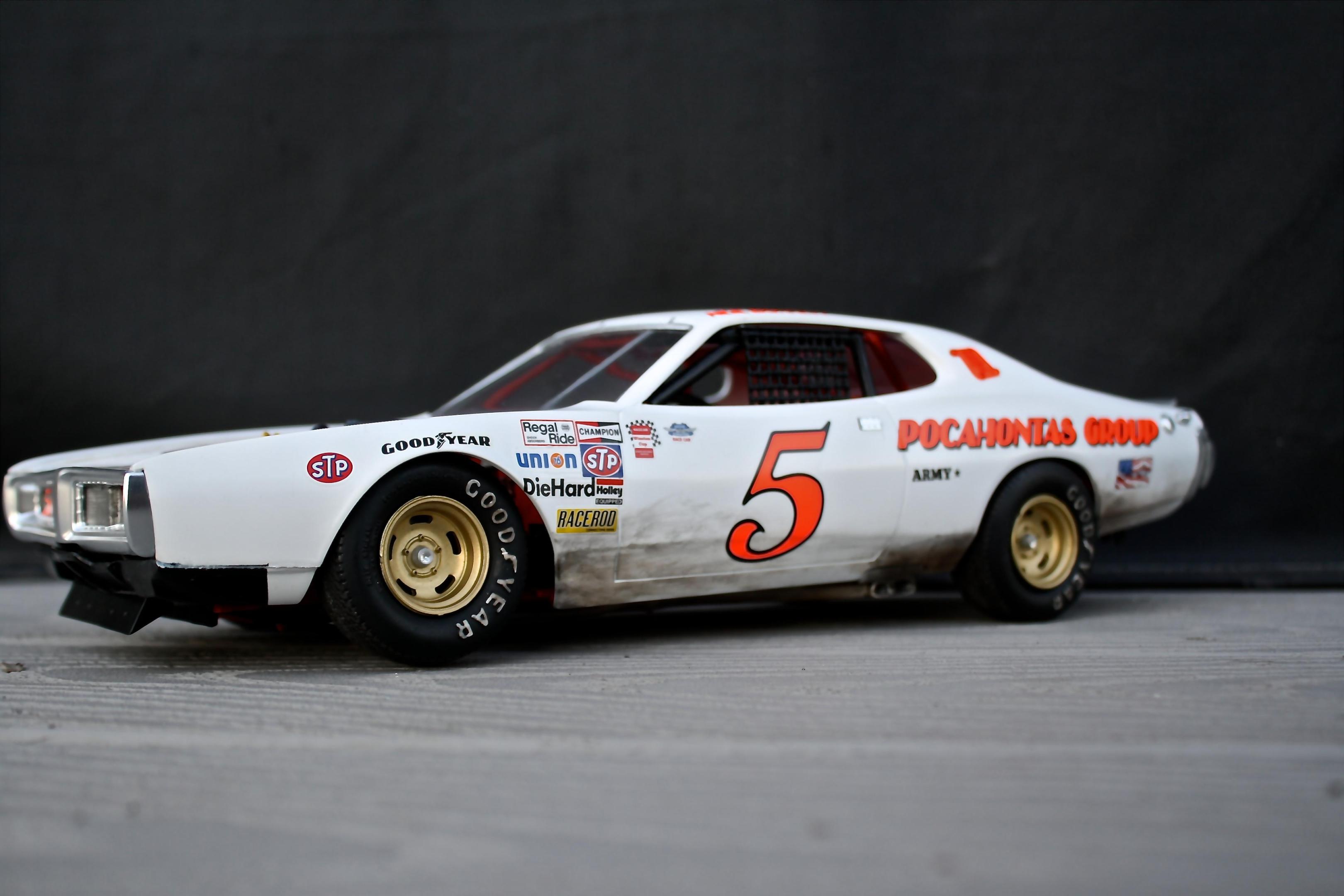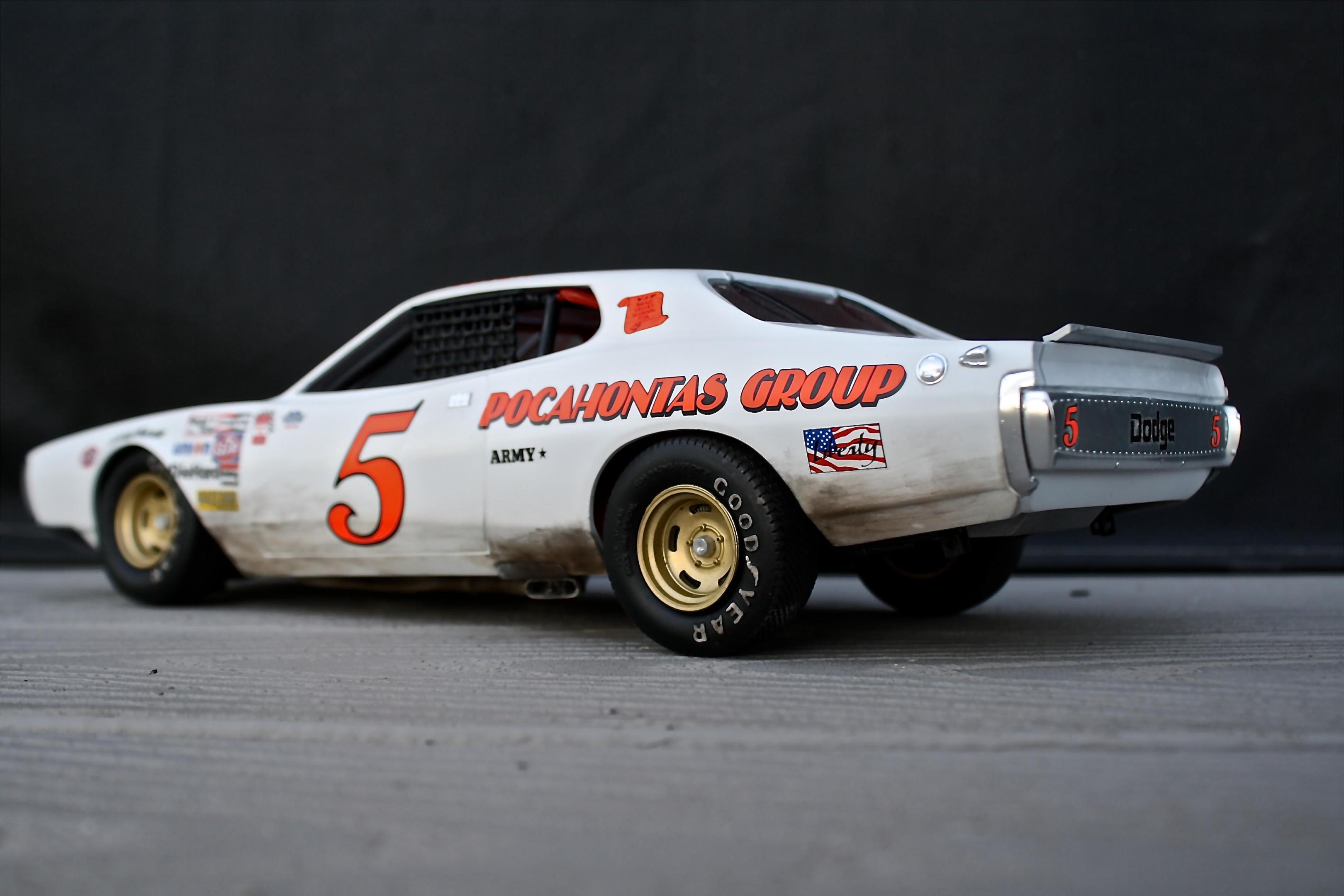 Finally got the Charger completed! This is the 1/16th Petty Charger kit from MPC painted to represent the Neil Bonnett entry in the 1977 Firecracker 400. The model is built box stock with nothing added from the aftermarket. Some of the build was posted in the WIP section so I won't bore you with the details. The car went together fairly well, the fit of most of the parts was pretty good, there was just a ton of flash and sink marks that had to be dealt with. Overall I'm happy with the results and was really pleased with the Powerslide decals. If anyone needs a complete set of the Petty decals included in the kit for this model I would be happy to send them to you. -