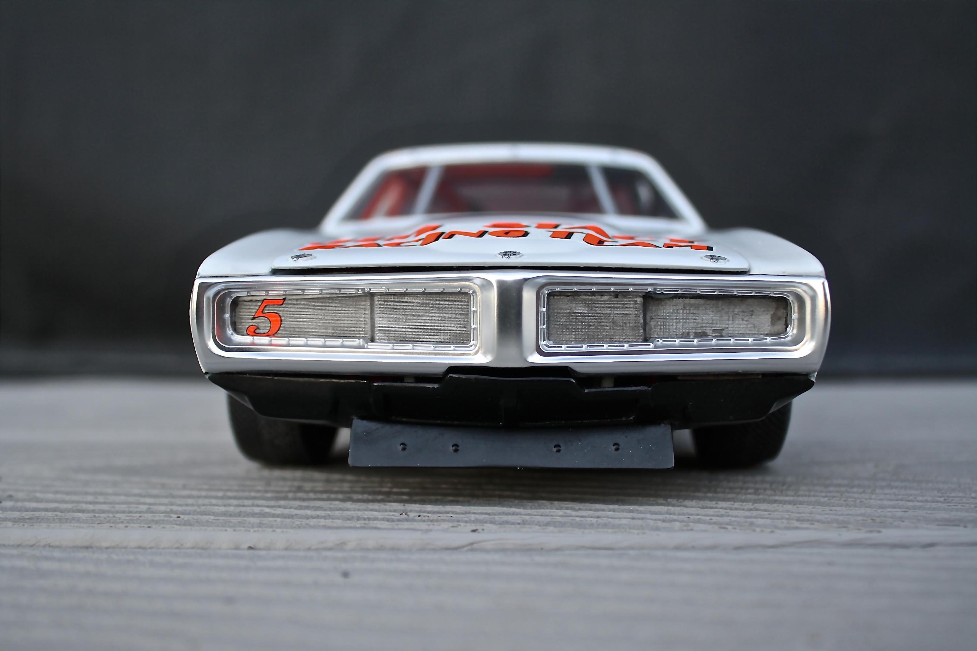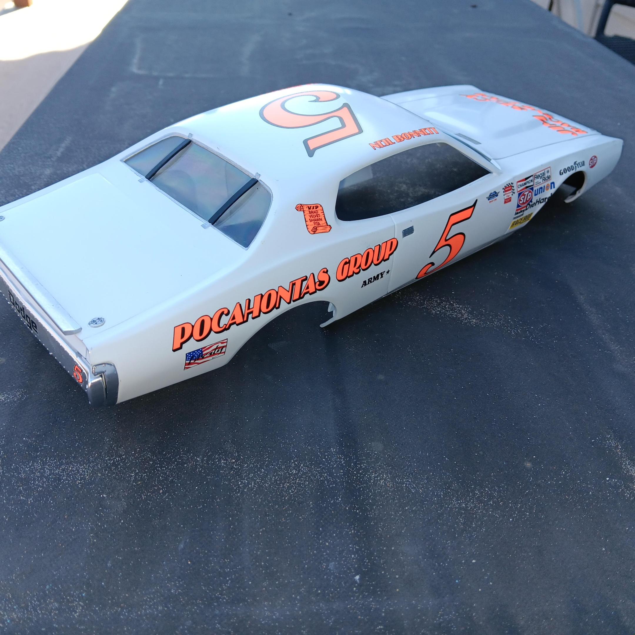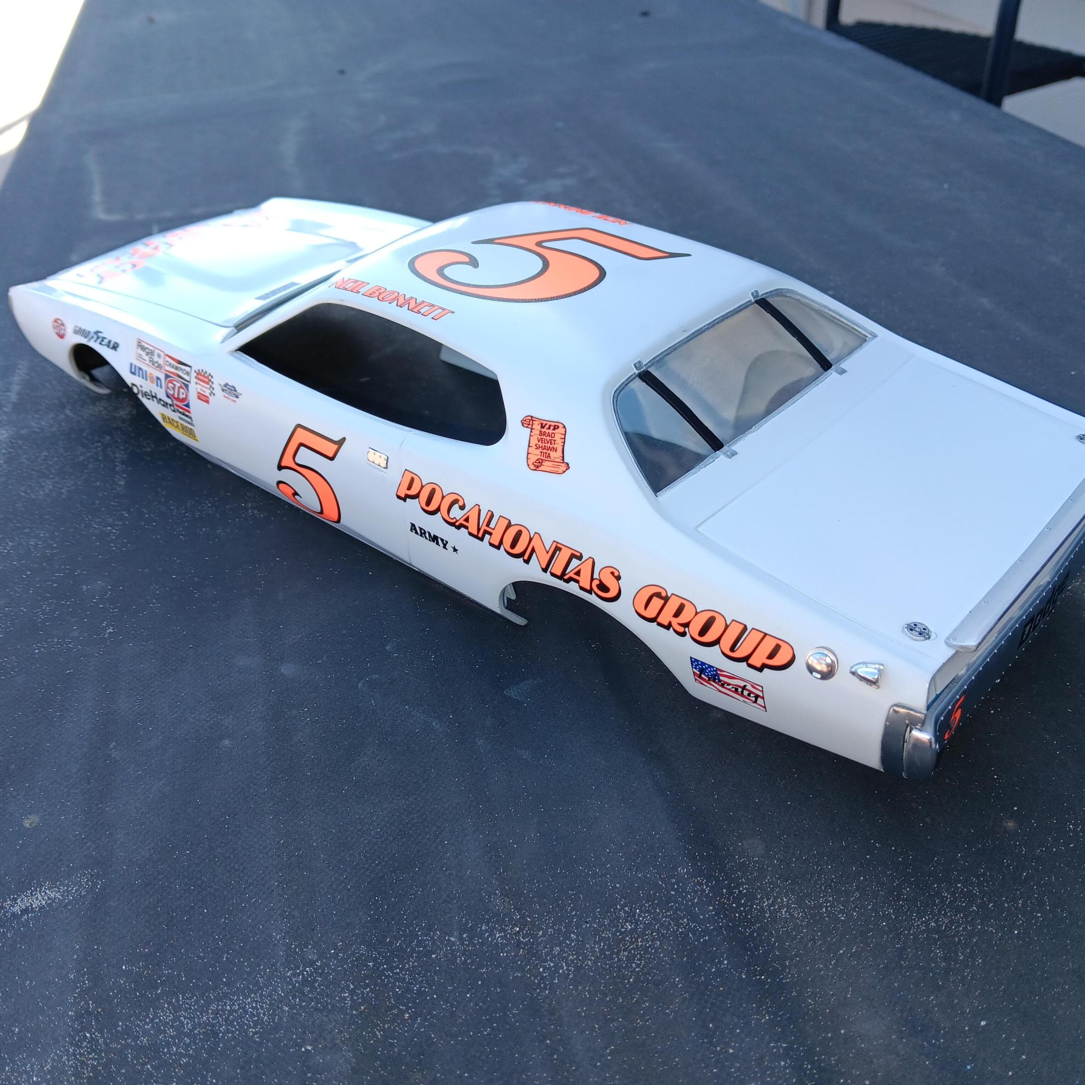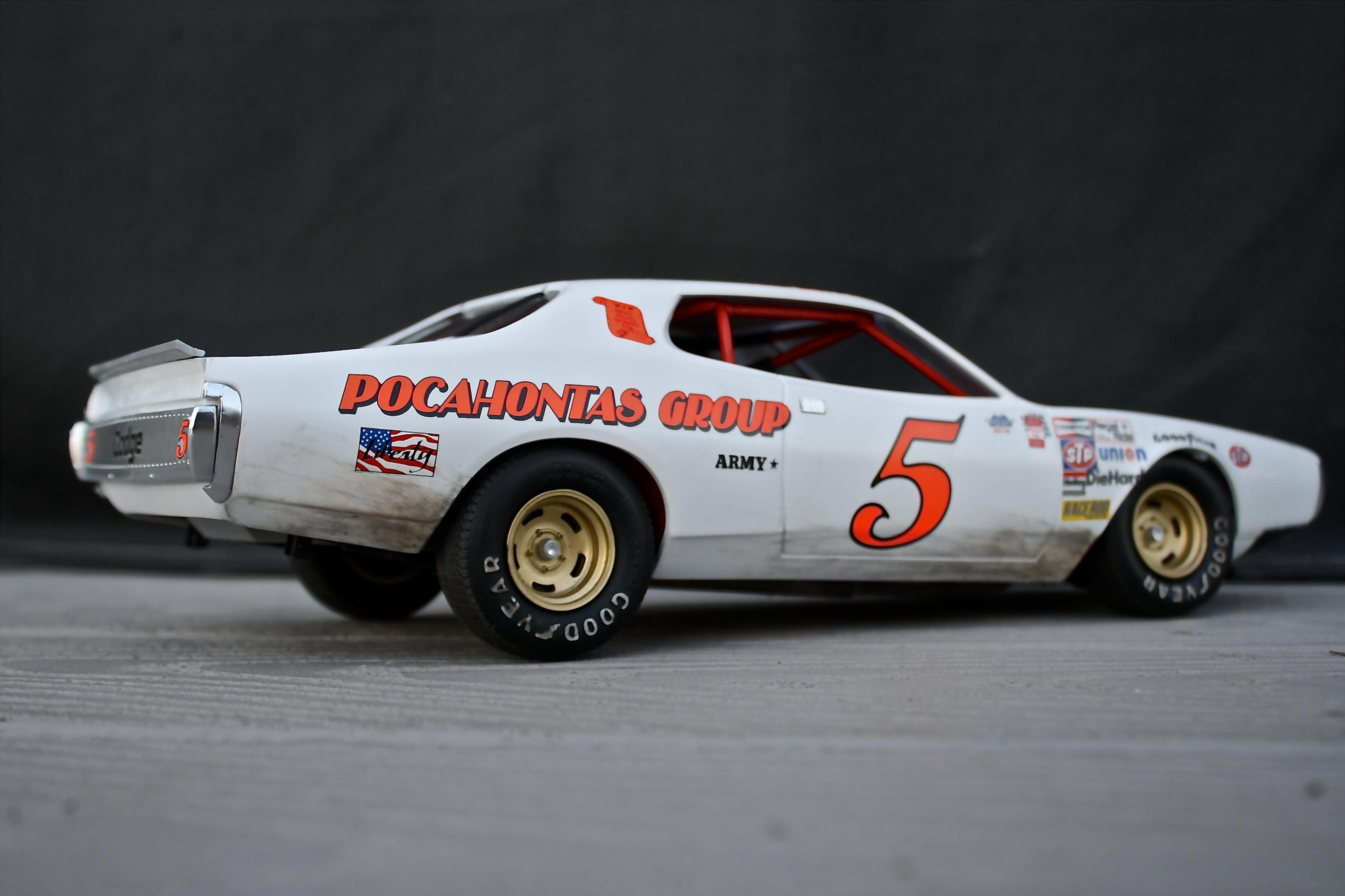 Finally got the Charger completed! This is the 1/16th Petty Charger kit from MPC painted to represent the Neil Bonnett entry in the 1977 Firecracker 400. The model is built box stock with nothing added from the aftermarket. Some of the build was posted in the WIP section so I won't bore you with the details. The car went together fairly well, the fit of most of the parts was pretty good, there was just a ton of flash and sink marks that had to be dealt with. Overall I'm happy with the results and was really pleased with the Powerslide decals. If anyone needs a complete set of the Petty decals included in the kit for this model I would be happy to send them to you. -