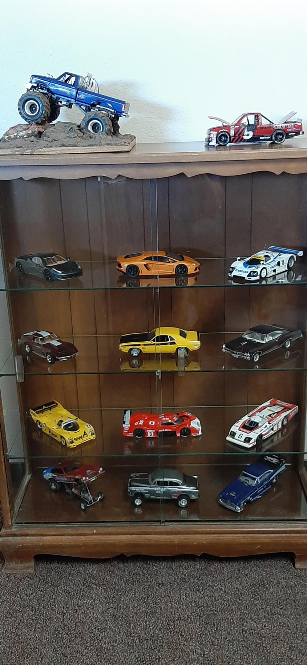 Which model are you talking about Tom? The NASCAR truck is normally in a plastic display case, I just took it out and set it on top of the cabinet for the picture. The Bigfoot is on a 12 x 12 base which unfortunately I have never been able to find an affordable case for.