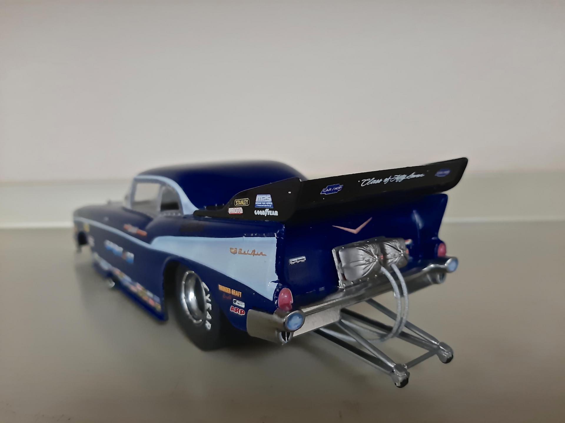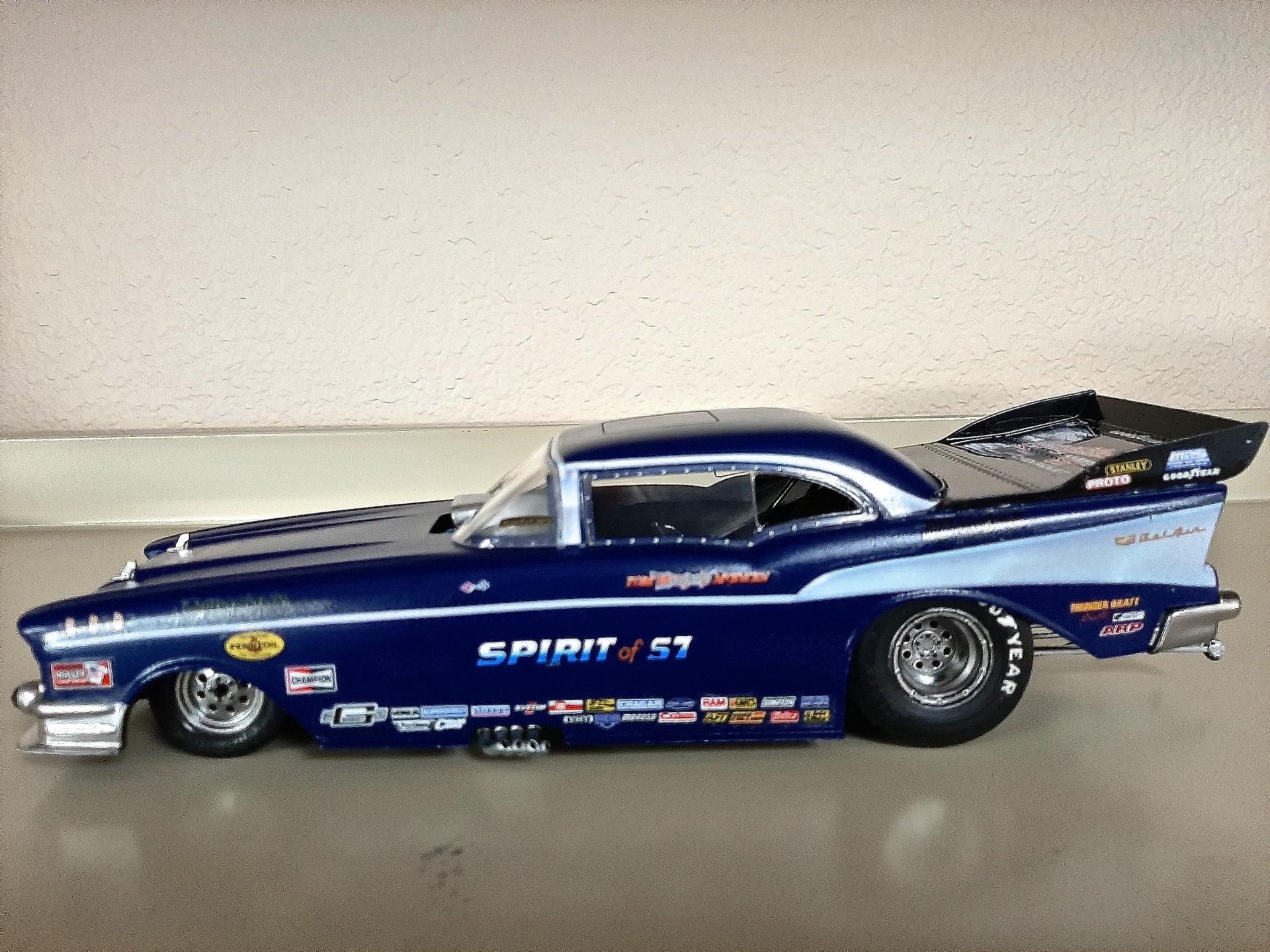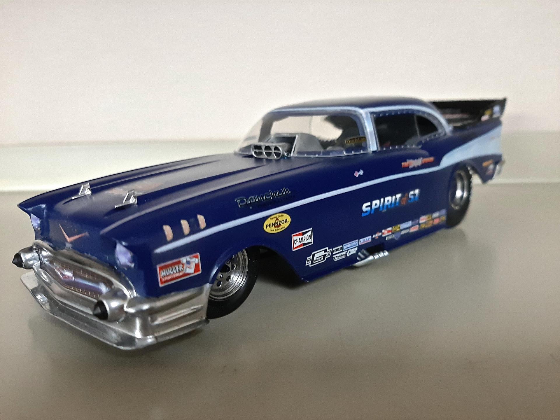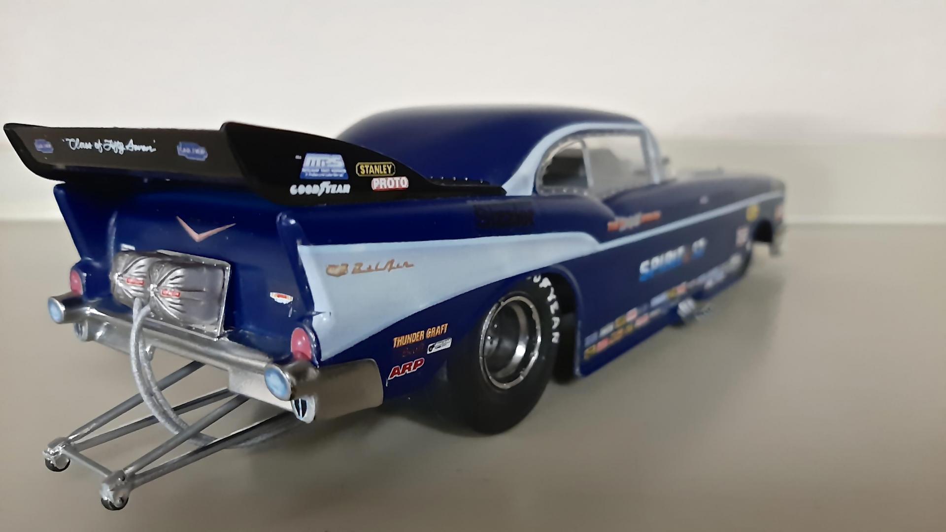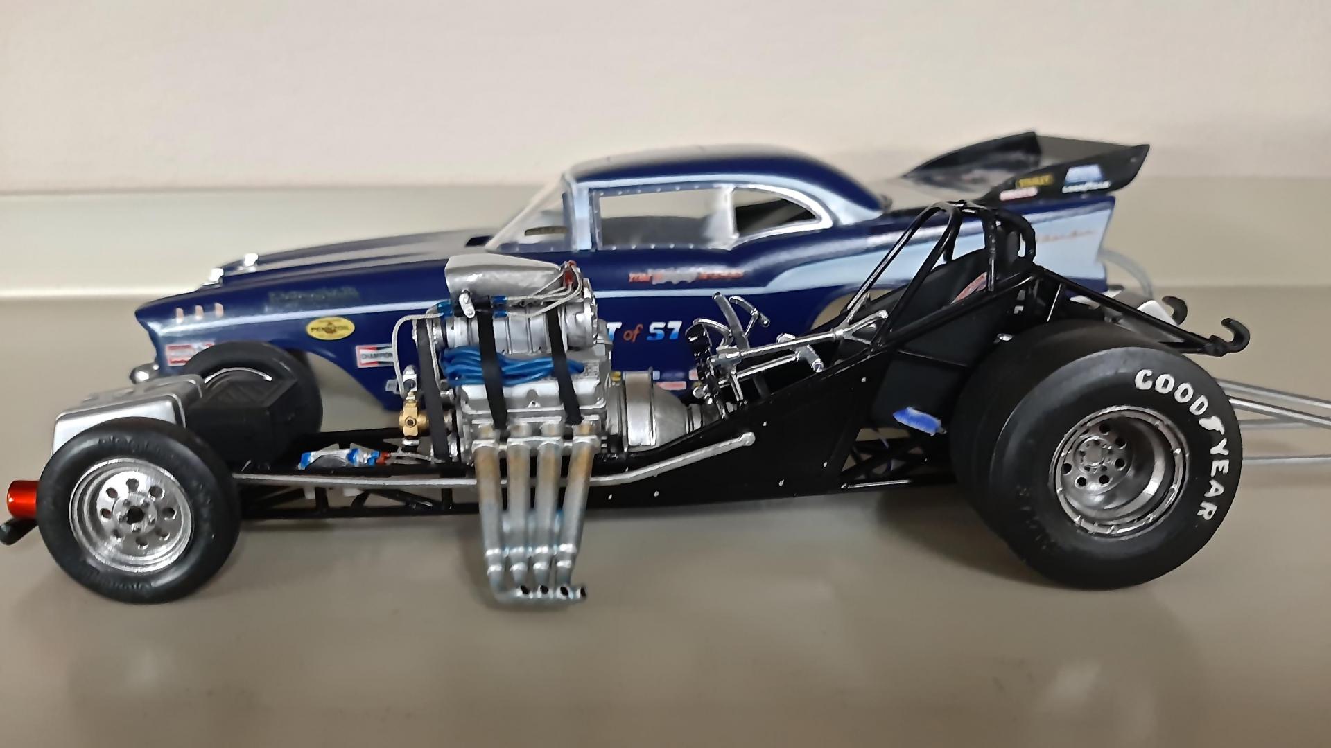 Here's my rendition of the Revell Tom McEwen '57 Chevy funny car. The body was painted with TruColor Spectrum Blue Pearl paint, chassis with Tamiya semi gloss black that was clear coated. Decals were a combination of kit supplied decals and Slixx gasser sheet for the Spirit of 57 decal. Braided lines are from ProTech and fittings are from ProTech and Detail Master Top studio. Five point harness is from ProTech and the Simpson decals are from Slixx. All of the chrome was stripped and painted with Alclad chrome, and the plug wires are Cat 6 phone wires (24 gauge). The parachutes are kit supplied and the parachute cords are craft store elastic cord painted silver and pinned on the chassis. The kit went together well, unfortunately I made some noticeable mistakes on the decals and construction, but overall I am happy with it. All comments and critiques are welcome, always open to learning.