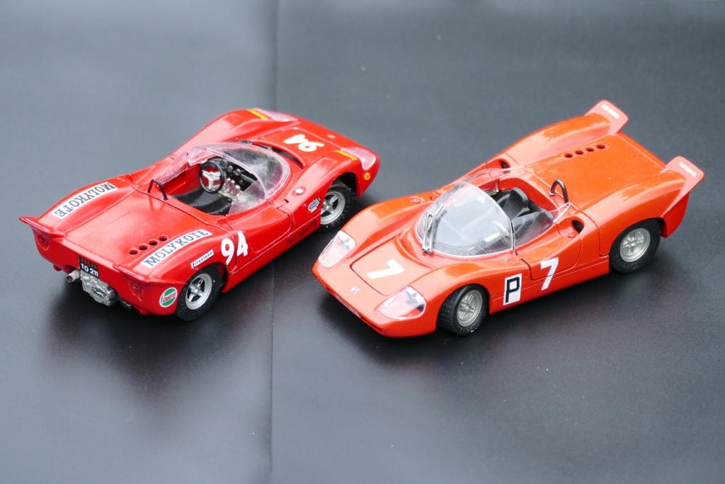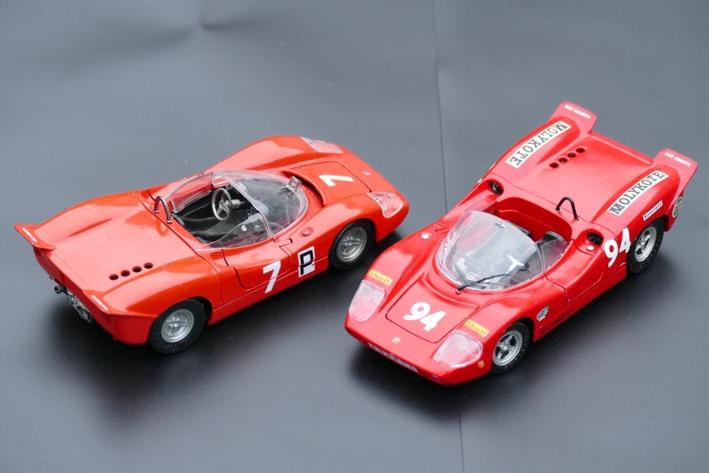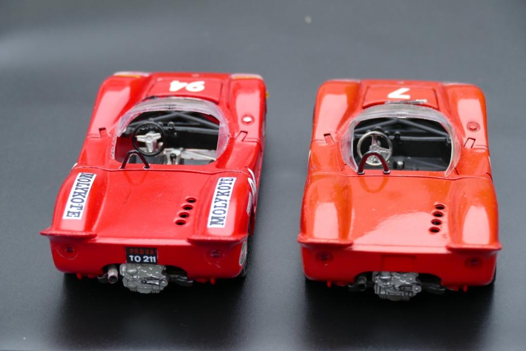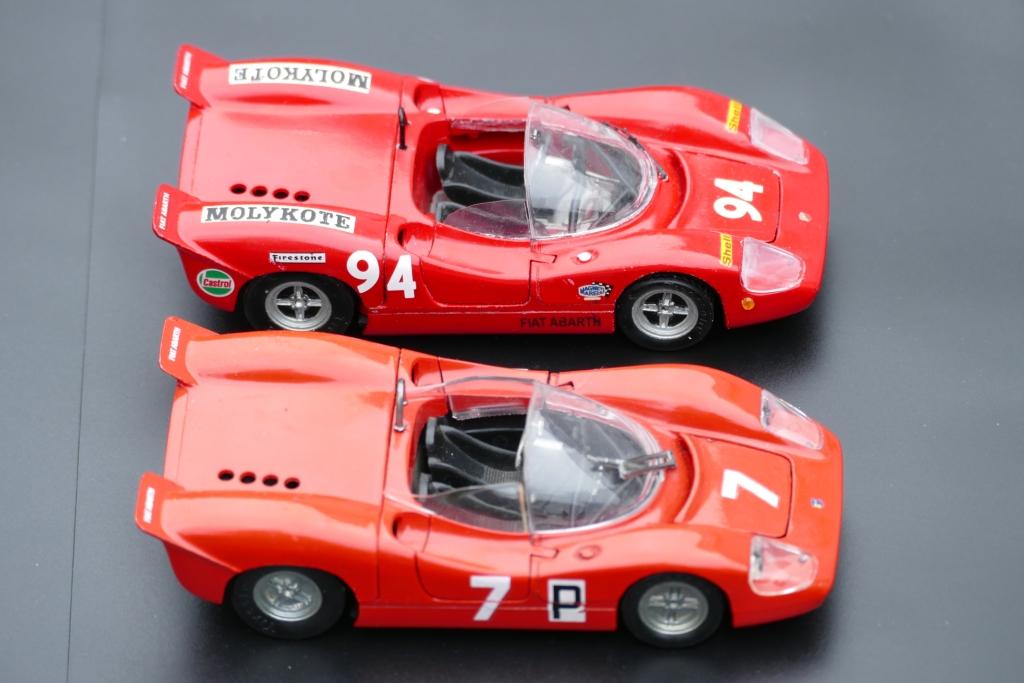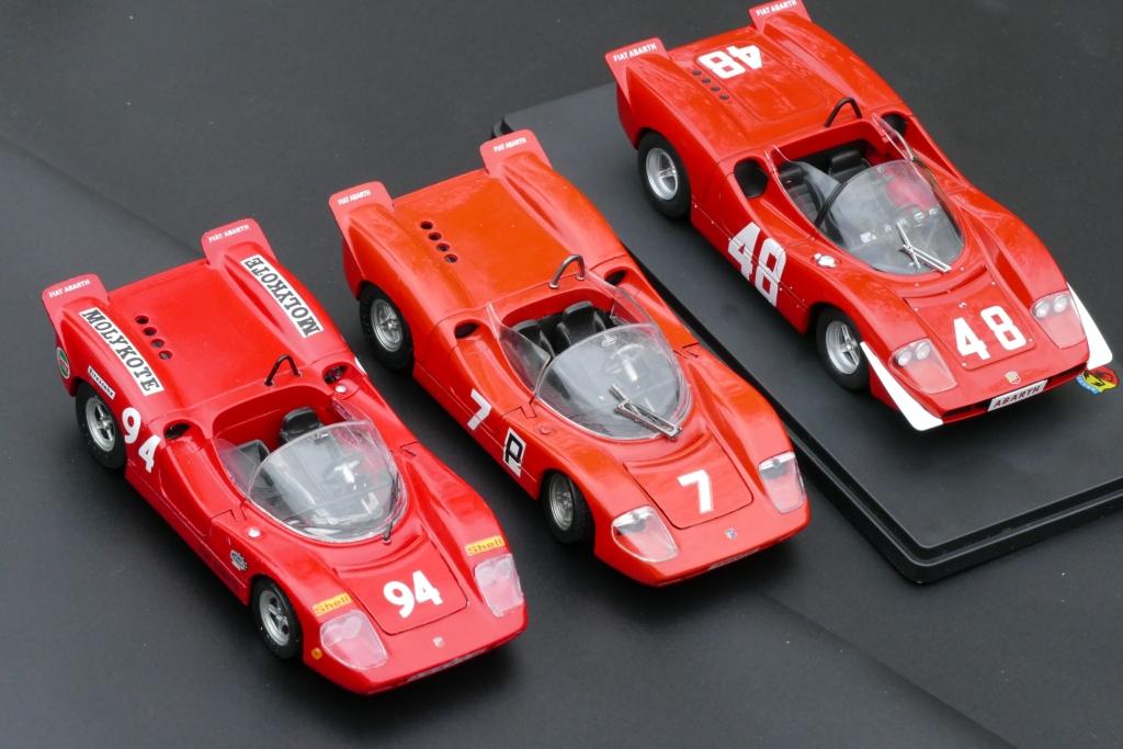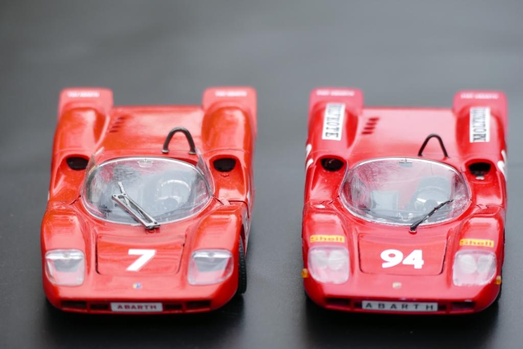 Fresh from the Italian newsstand Hachette Abarth series (1/24, made by Ixo): model represents the 2nd place car (sports car class winner) at the 1969 Trento-Bondone race (European hillclimb championship) driven by (then worksdriver) Arturo Merzario. I only added the rear number, license plate and the Abarth letters on the front (all from the superb decalsheet by Tiptoys/Italy) : The next picture shows the new model together with 2 old 1/25 scale very heavy die-cast toys from ca. 1969 (made in Italy by Politoys: everything opens, wheels steer, working suspensions wiith spiral springs). They represent the 1968 model year (without front spoilers): # 94 was a junker, missing rollbar, wiper and side windows - I added these from the scrapbox and installed 4 headlight lenses - car has been repainted and some typical decals from the era added (no specific car) # 7 was in almost mint condition - I only removed its ugly vinyl stickers, cleaned it and added race numbers from an old UMi decal sheet - works driver Johannes Ortner was runner-up at the 500 km Nürburgring 1968 (European 2 ltr. sportscar championship), this time with a 1600 cc - 4 cyl. engine: this was a 1 - 2 - 3 for Abarth: Peter Schetty 1. - Johannes Ortner 2. - Arturo Merzario 3. On to the pics: