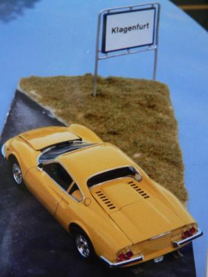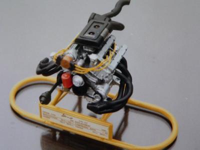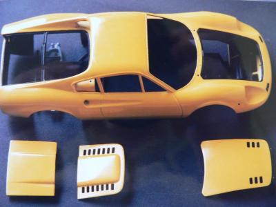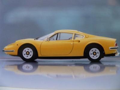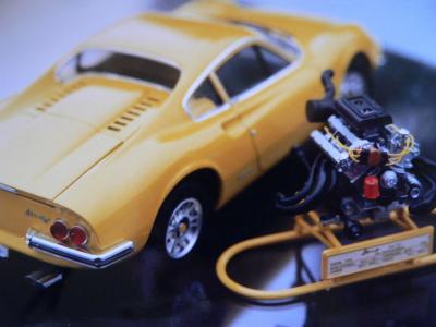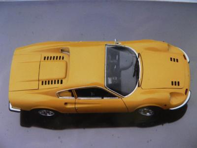 (the other is the 250 GT/L Lusso), and my best car model that I have ever built (up to now). I made this about 20 years ago for a customer who owns the real thing - so each and every part is painted according to his instructions like his 1:1 Dino, from the underbody to the spark plug cables and the oil filter, suspension parts and windshield wipers. I used 2 Fujimi Enthusiast kits - from the 2nd one I took the engine to place it alongside the car. Unfortunately the pics are lousy - I have only color prints which I photographed with my digital camera. This has to be my most detailed kit ever: lots of bare metal foil, photo-etched scripts and parts from Replicas and MIniatures of Maryland and painted in Ferrari Giallo Fly (original yellow). It was no easy task to put the motor/transmission into the chassis and finally the body over the whole thing - but very rewarding. The only flaw is that the front hood does not fit flush with the body, but nevertheless the owner was very pleased with the final result. I will build this one for myself again - I have still 4 in my stash (1 missing its engine) - now on to the pics!