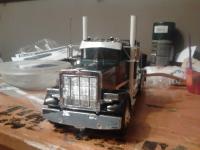 I got this kenworth t600a to build a rig for my dad, i have a bit of progress done like frame, engine and some cab and sleeper assembled. heres some pics of what i have now. hopefully get the cab done sanding and get the paint on it and all other things need painted so i will have some more to do on it. a couple of these pics are of the frame attached to the moebius trailer frame. they will go together anyway when both are done.