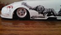 well finished up with the decals. Not sure if I like the hood ones. Don't know if I am gonna stick with these or make maybe one huge blood splatter going up the hood. Make it look as if I hit one and it was thrown over the top of the car. Can't move on with the clear coat until I decide which way I am gonna go. So I will start working on the frame. I have two resin molds made of slicks and smaller front wheels so I guess I will get them poured and ready to paint.