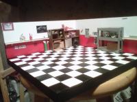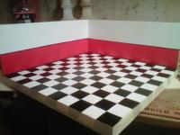 Well after some time away working on other garages for people I finally got some ME time ! After looking at Crazy Richard's 1/24-25 hotrod garage post I really got the urge to work on mine again. Since the last post I have worked on the office, lunch room on top of the office, some pillars and a few other things. I started the brick walls along with the wooden pillars but this is where I am stuck at. I am not sure on which way to go with them. First I was thinking of doing half with brick , black stripe and white. Then I thought to just stain them or maybe just paint them black. For now I am going to stop with them until I figure it out. OH of course any ideas are welcome. -