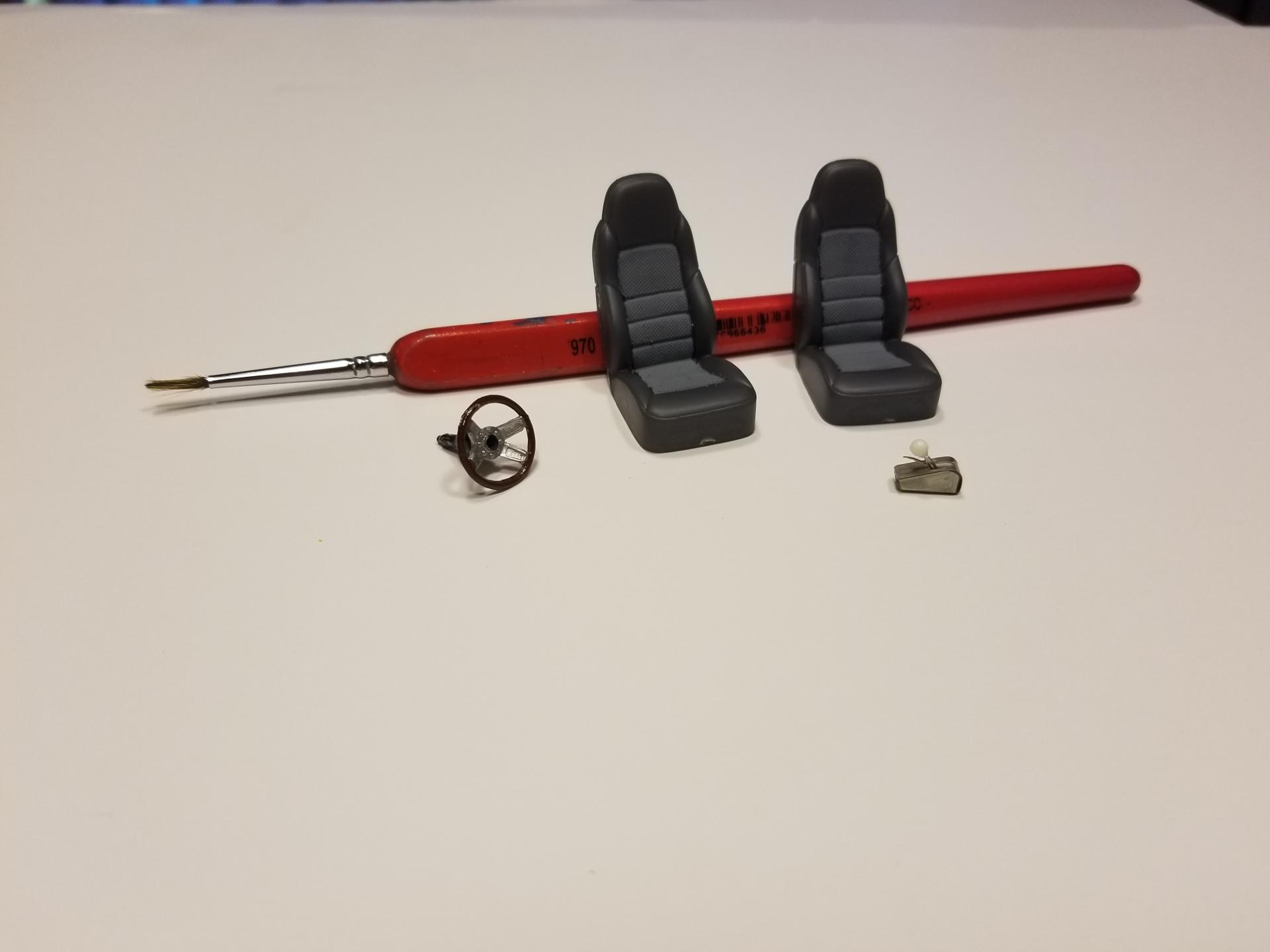 Hello everyone, got a little time at the bench this morning. Boy you sure don't realize how rusty you get when you haven't built anything in a while lol. I'm not gonna put a whole lot of detail into this one (just getting the mo joe back). Decided to go with flat black on the chassis and will probably go with some sort of steel or titanium color for springs and etc. The ride height is so low I found some parts box springs with no arch for the rear. Also made some simple spring boxes (not really accurate but will do) and also a half driveshaft loop. Still need to make the wheel yuns which will actually stick through the back seat (because of the low ride height).Parts box once again came through on a set of seats ( i think from a Corvette). Put a quarter stick shifter together from scott at futurattraction and painted up the steering wheel. Hopefully I will have a few more updates in a few days as I'm waiting on engine parts to arrive. Hope you enjoy
