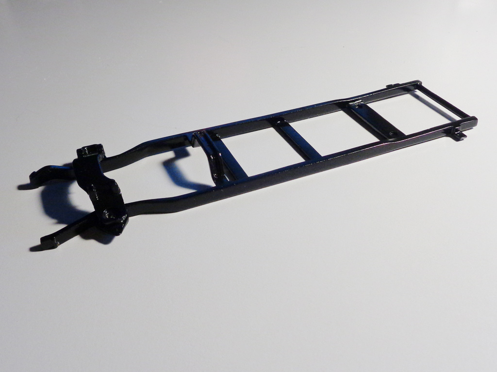 Frame stock cross-members removed/new-members installed, leaf springs removed/new rear – air adj sys will be built. Frame smoothed out, filled, primed, sanded numerous times and pained gloss black.