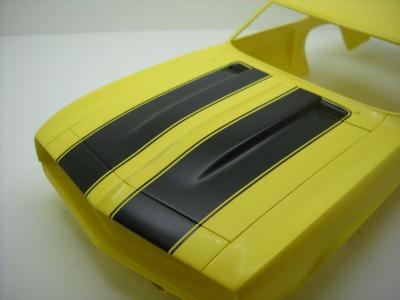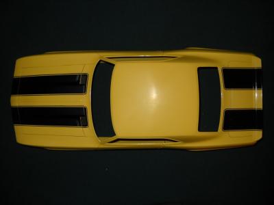 14. Daytona Yellow from Automotivetouchup.com. Three coats of color and three coats of clear. It needs a fair bit of polishing, but it came out pretty good. I will later add the black stripe decals and seal them with another coat of clear. I also did a bit of detailing on the chassis.