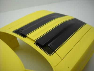 11. I couldn't for the life of me get the decals to lay flat on the hood even with Micro Set and Micro Sol, so I'm thinking of a compromise. If I mask and paint the stripes on the front but use the decals on the back, after a couple coats of clear, do you out there think there will be any noticeable difference? I would think that since they have the expanse of the roof between them, even if there was a slight difference, it would be difficult to compare them anyway. I would greatly appreciate anybody's input.