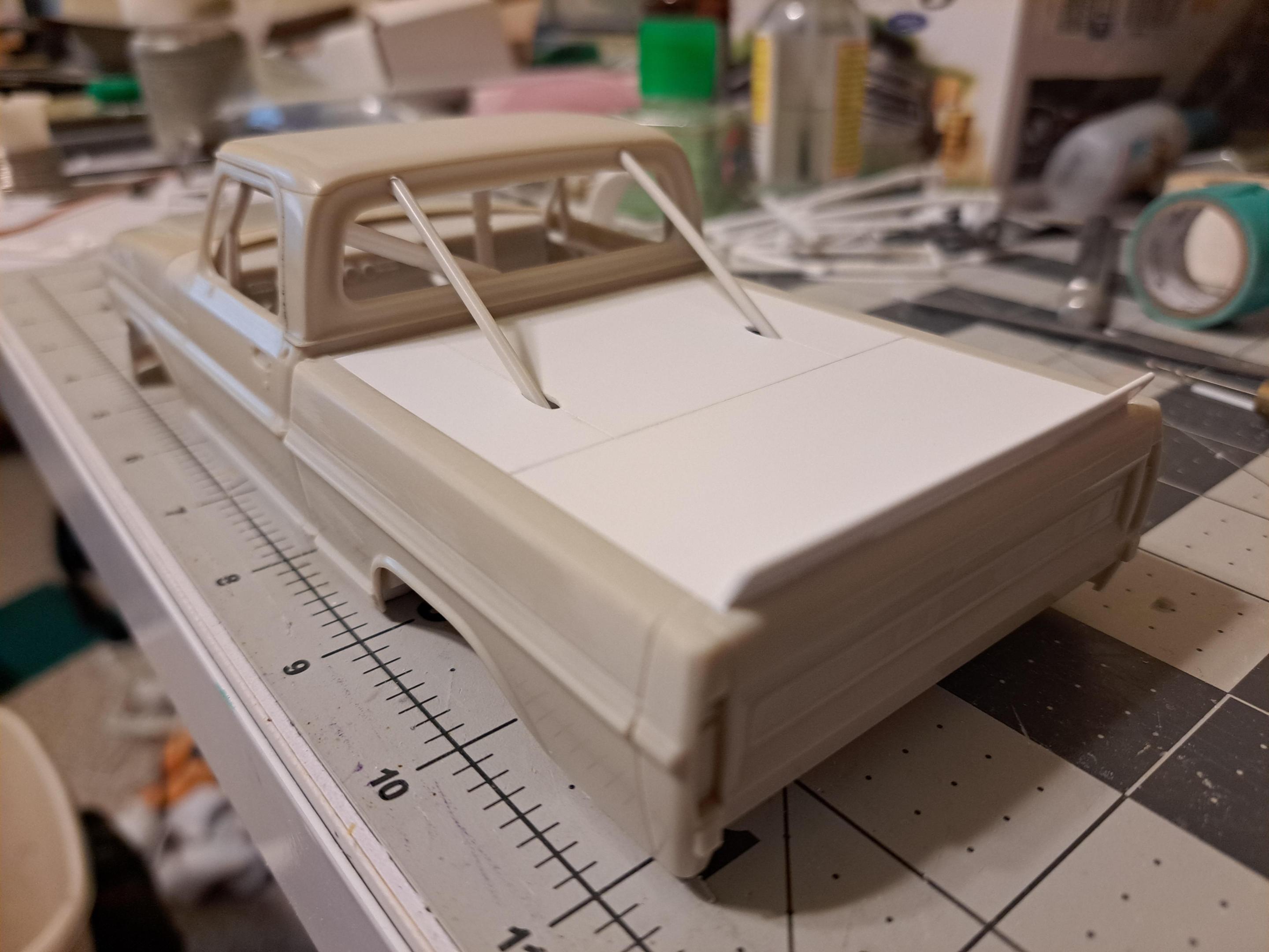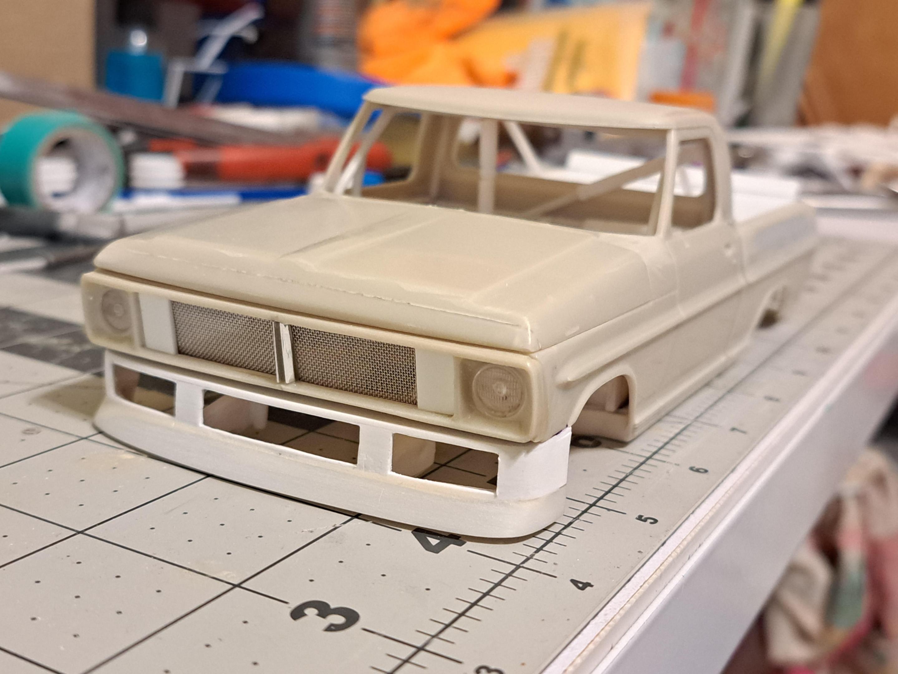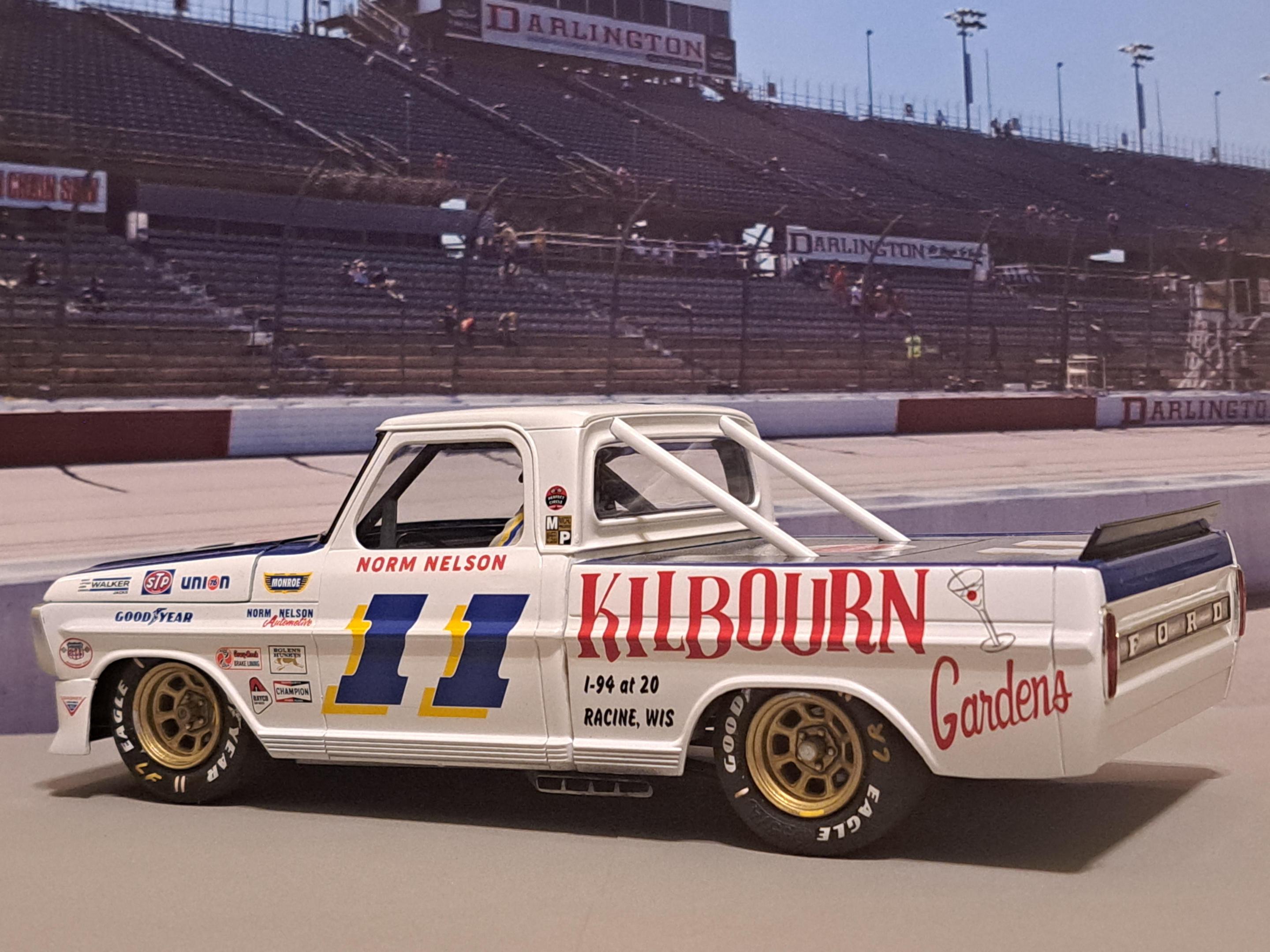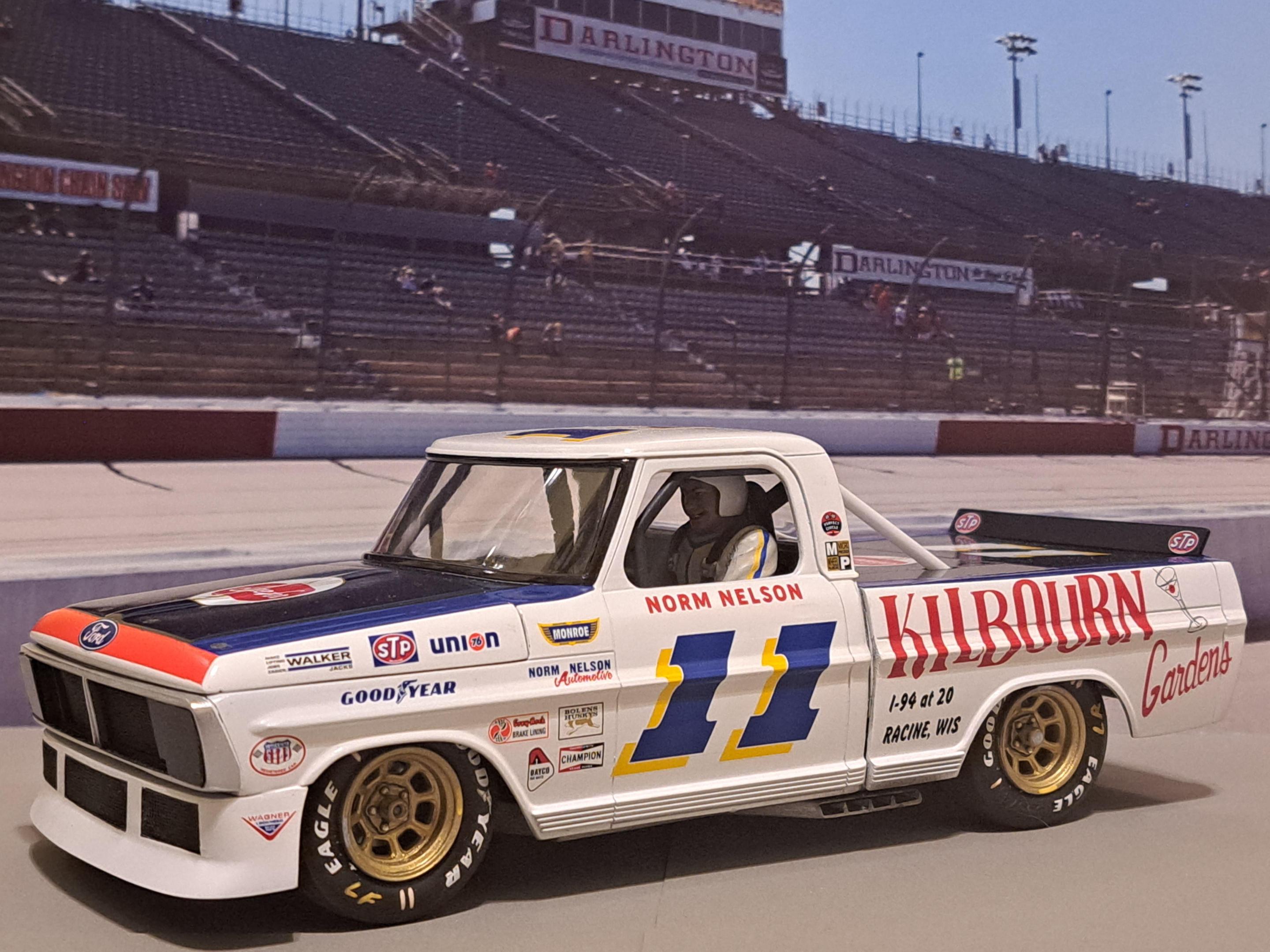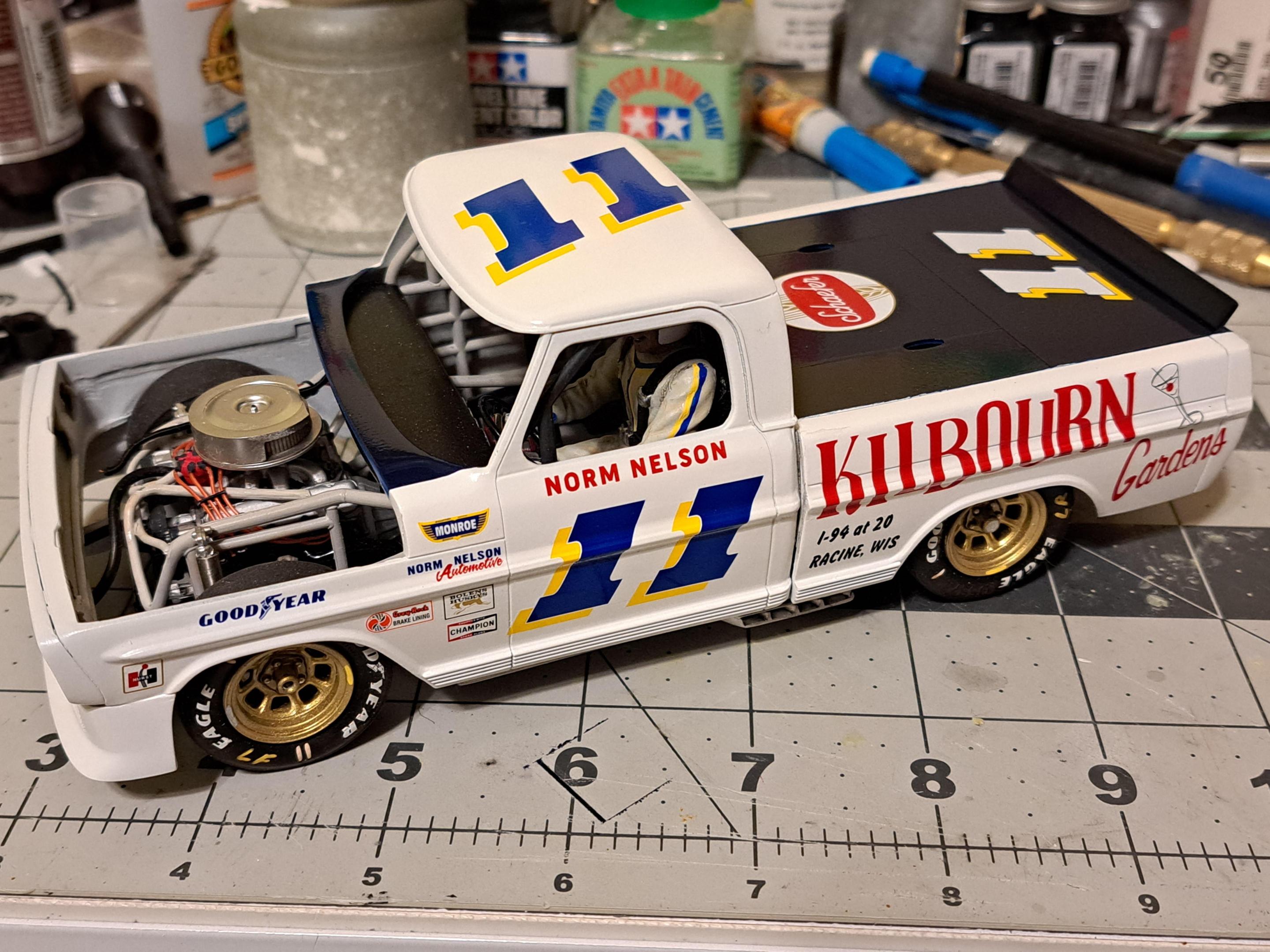 Built this Moebius 1972 Ford Ranger Sport Custom as a "what if" race truck. Our local club (Auto Modelers Group or A.M.G.) had a one year build of your choice a 1972 c10 or this Ford or the 1972 Ford 4x4. I chose the Sport Custom As you can probably guess, I used only the body, glass, and trim pieces. Everything else is still in the box lol. The chassis and driveline came from a Revell Nascar kit. The rollcage was Custom built from several Nascar rollcages. Norm Nelson himself I made from a Don Garlits figure. The front bumper I scratchbuilt from Evergreen sheet and Stainless fuel filter screen. The grille was cut open and customized with screen and scratchbuilt headlight covers from acetate sheet. The rear bed cover was also made from Evergreen sheet. The hood was dropped at the front removing the F O R D letter section and sloping it downward for aerodynamics. Took forced perspective photos of it in front of a printout of Darlington where it would have most likely made the rounds. I did not take a lot of photos near the end of the build due to the amount of time this took to make complete. Decals came from Mike's decals. I chose the livery because I am from the Racine area and worked at Kilbourn Gardens in high school. I can say I am glad this build is done....I like how it turned out but it fought me every step of the way as any heavy Custom kitbash will have the tendency of doing. Enjoy!!!