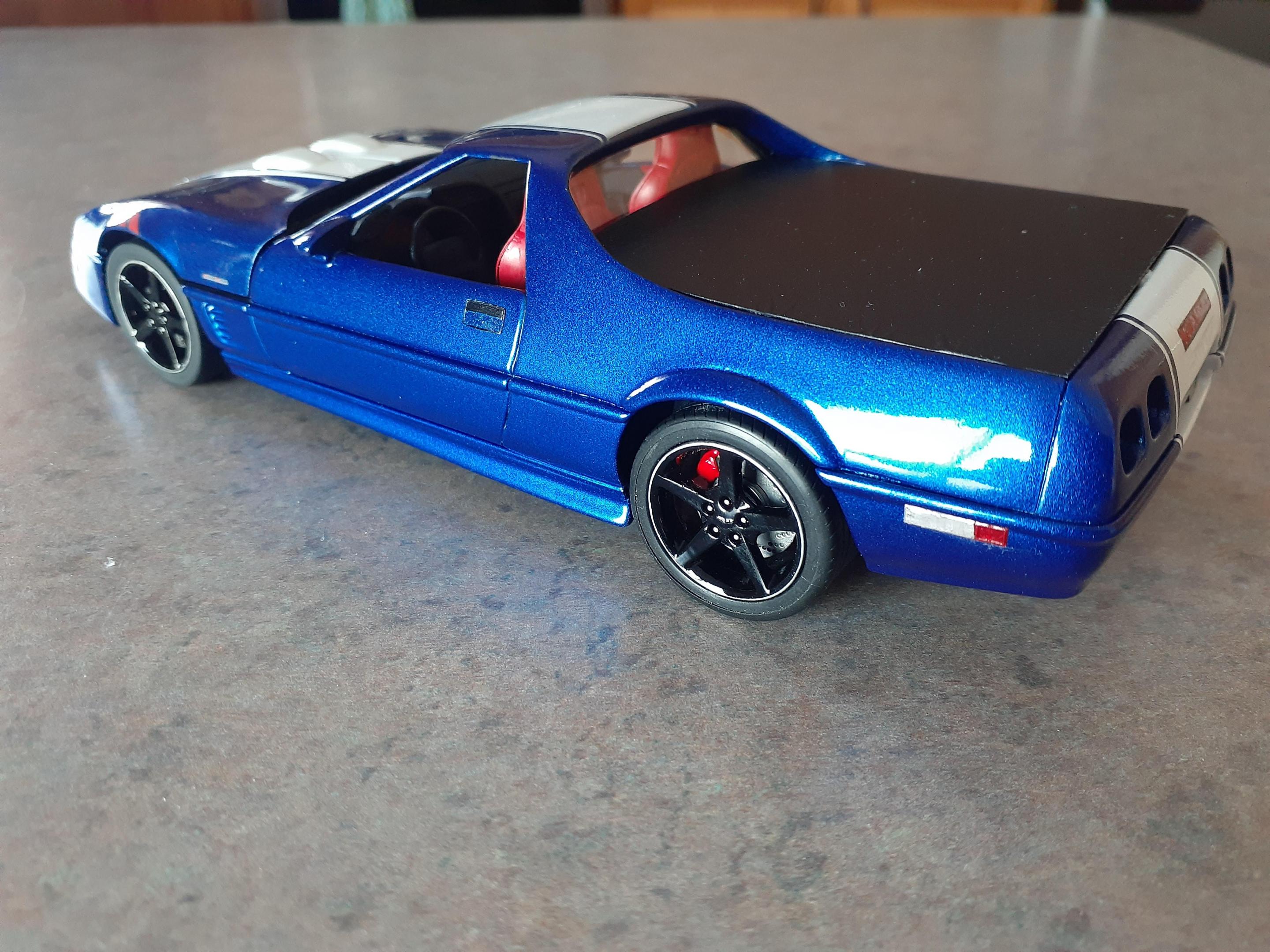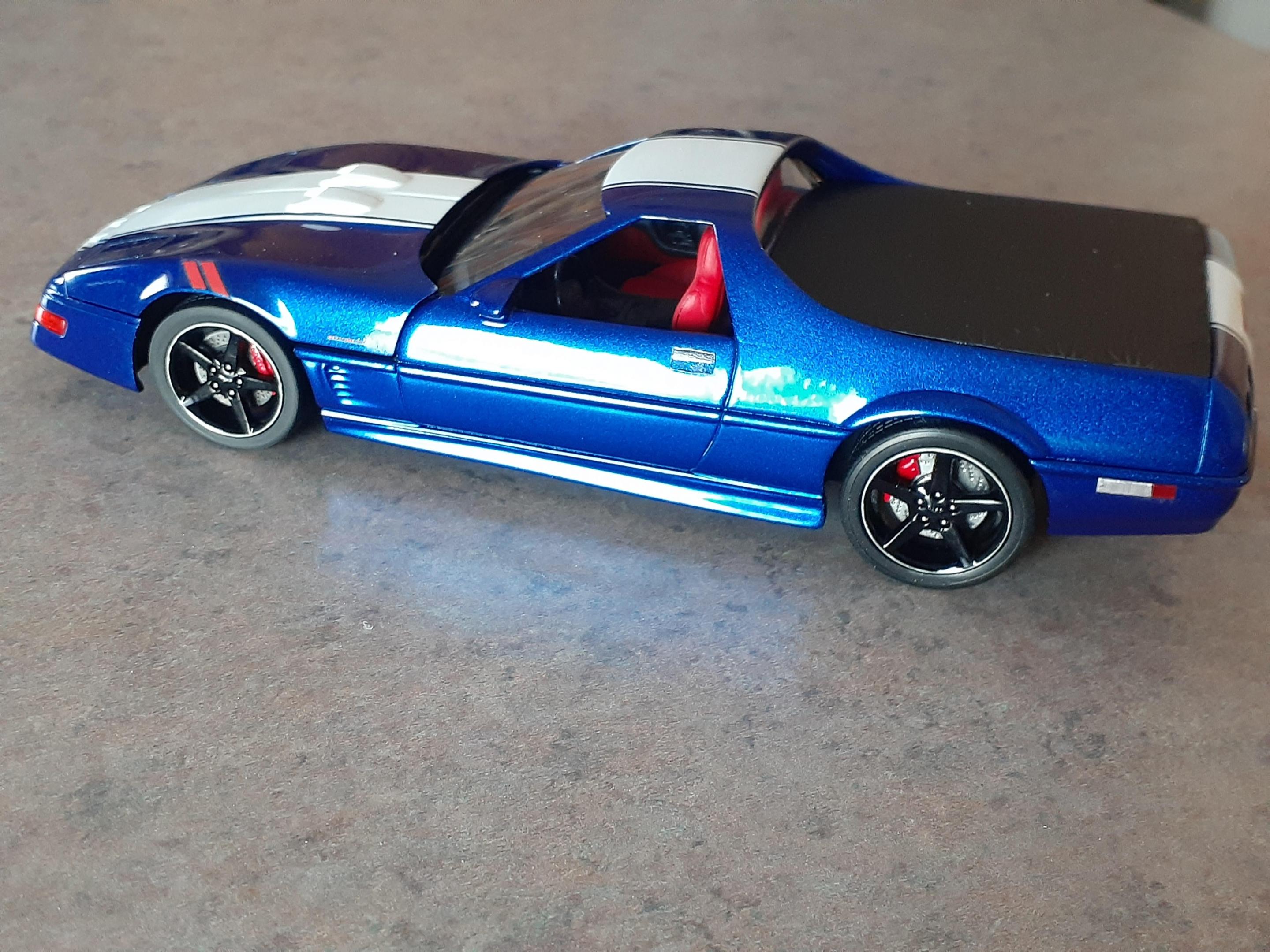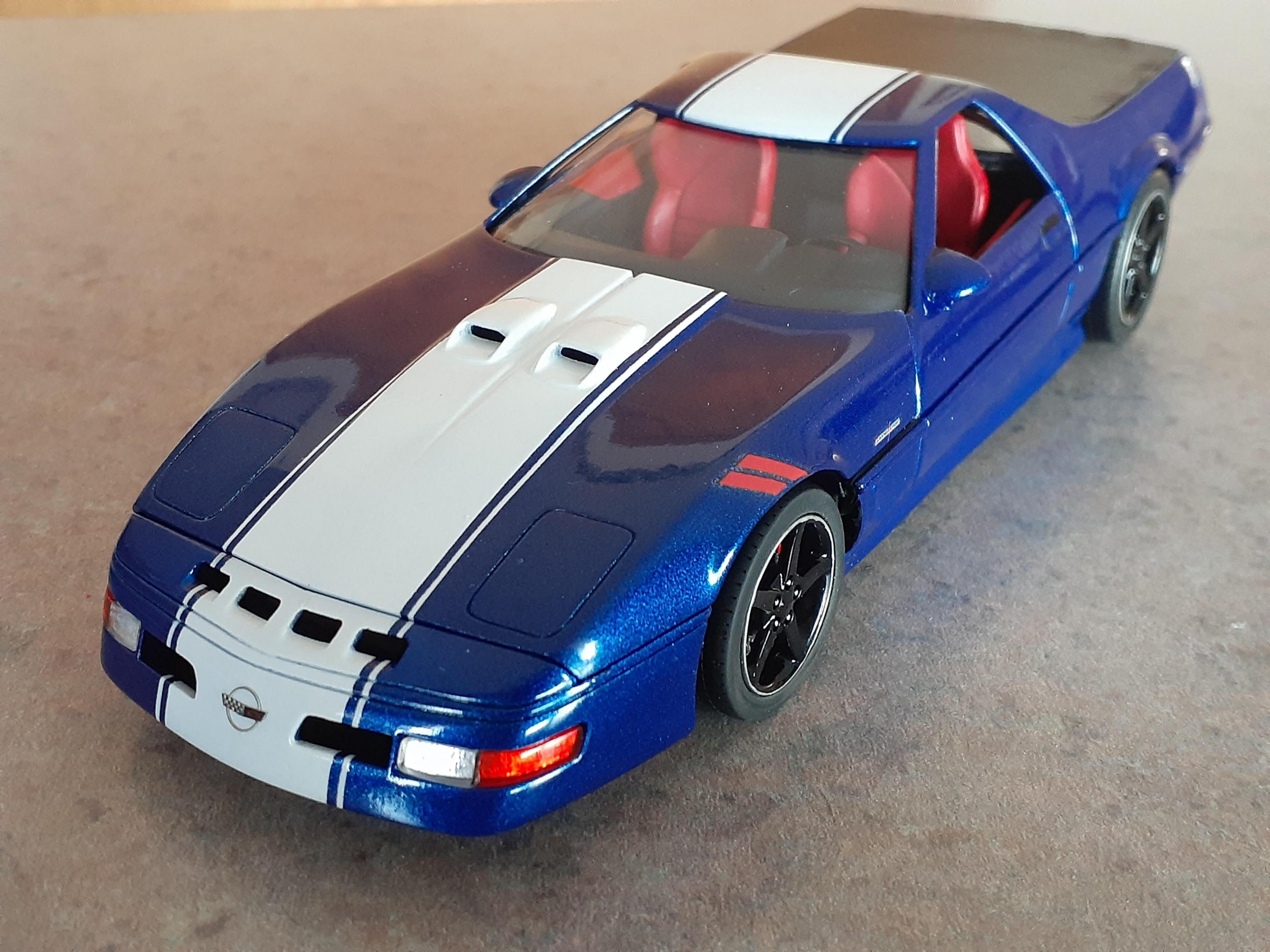 This was another stalled (5 years stalled!!) project I pulled out and finished. Paint is all lacquer: Blue base is Deja blue with True blue pearl. White stripes are masked and painted. Wheels are c6 Corvette with large Brembos behind them, tires are from the Foose c7. Photoetch emblem, rear sidemarkers, and door handles. Oh yeah, I made the front marker lights out of clear grand sport markers sanded and reshaped because the Callaway markers are tinted. ? When taking on something this complicated there are bound to be fitment issues which was an understatement.....the chassis had to be stretched 3/4 of inch to accommodate the new wheelbase, which meant new exhaust, driveline, new interior which is c4 Grand Sport.....yada yada yada. Lol on to the pics